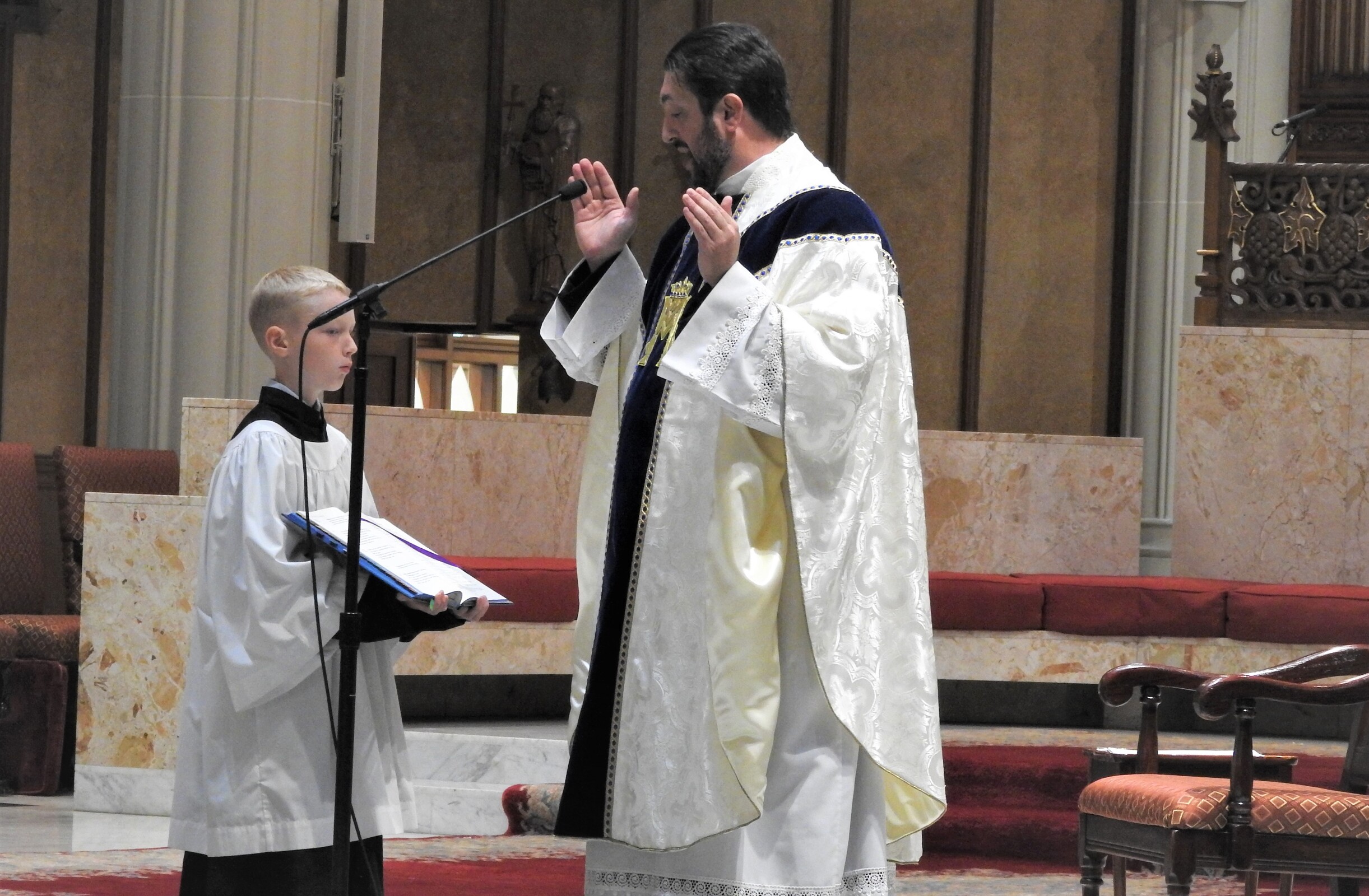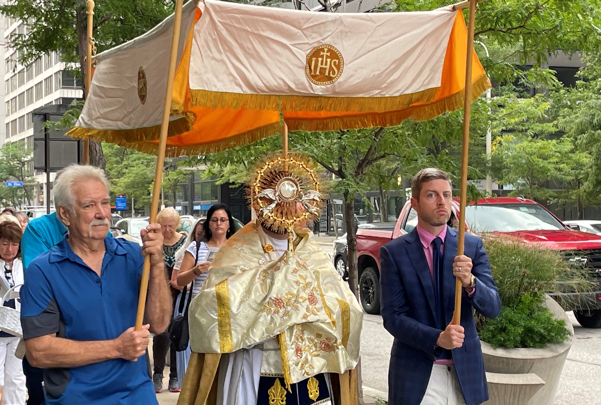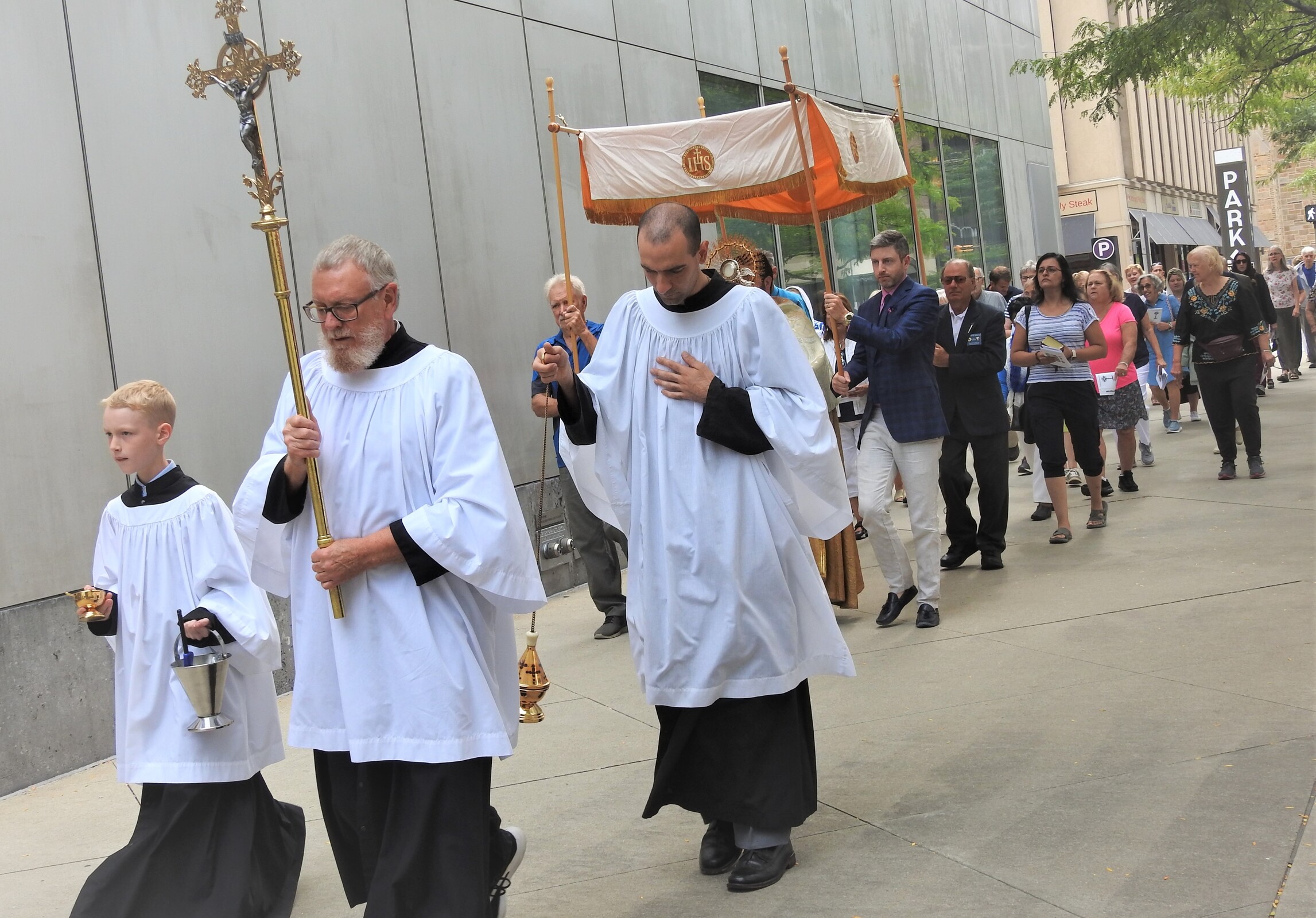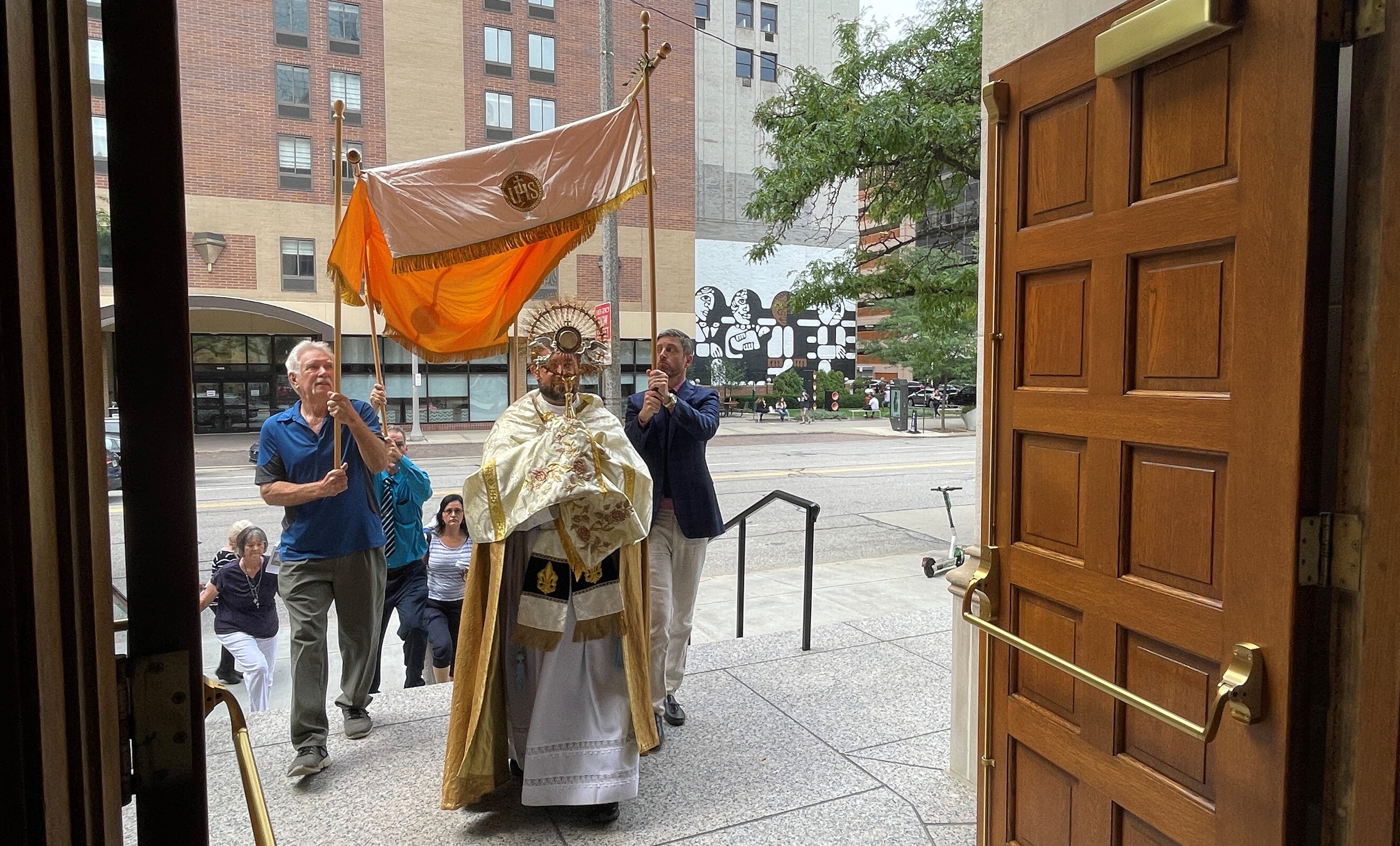 After Mass, Father Estabrook carefully placed a blessed host in the luna of the monstrance and carried it reverently as he led the procession that marched north on East Ninth Street to Lakeside Avenue, west on Lakeside to East Sixth Street, south on East Sixth to Superior Avenue and east on Superior to East Ninth Street, where the group crossed the street and reentered the cathedral to pray the rosary and recite closing prayers.