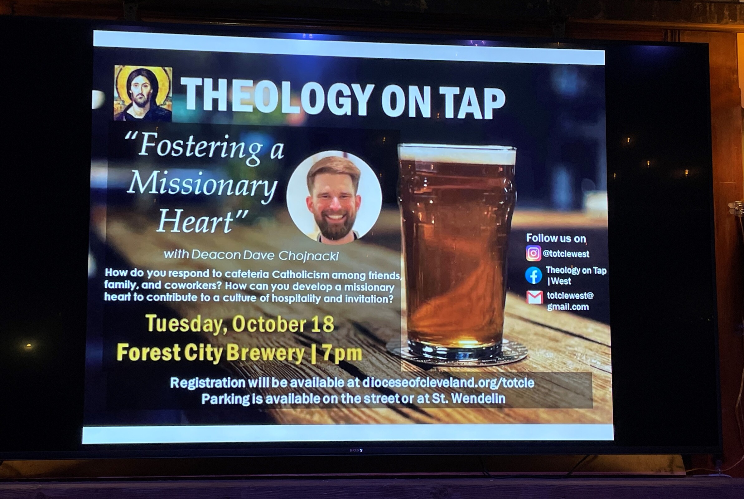 The next TOT will feature Deacon Dave Chojnacki discussing “Fostering a Missionary Heart” at 7 p.m. Oct. 18 at Forest City Brewery.
