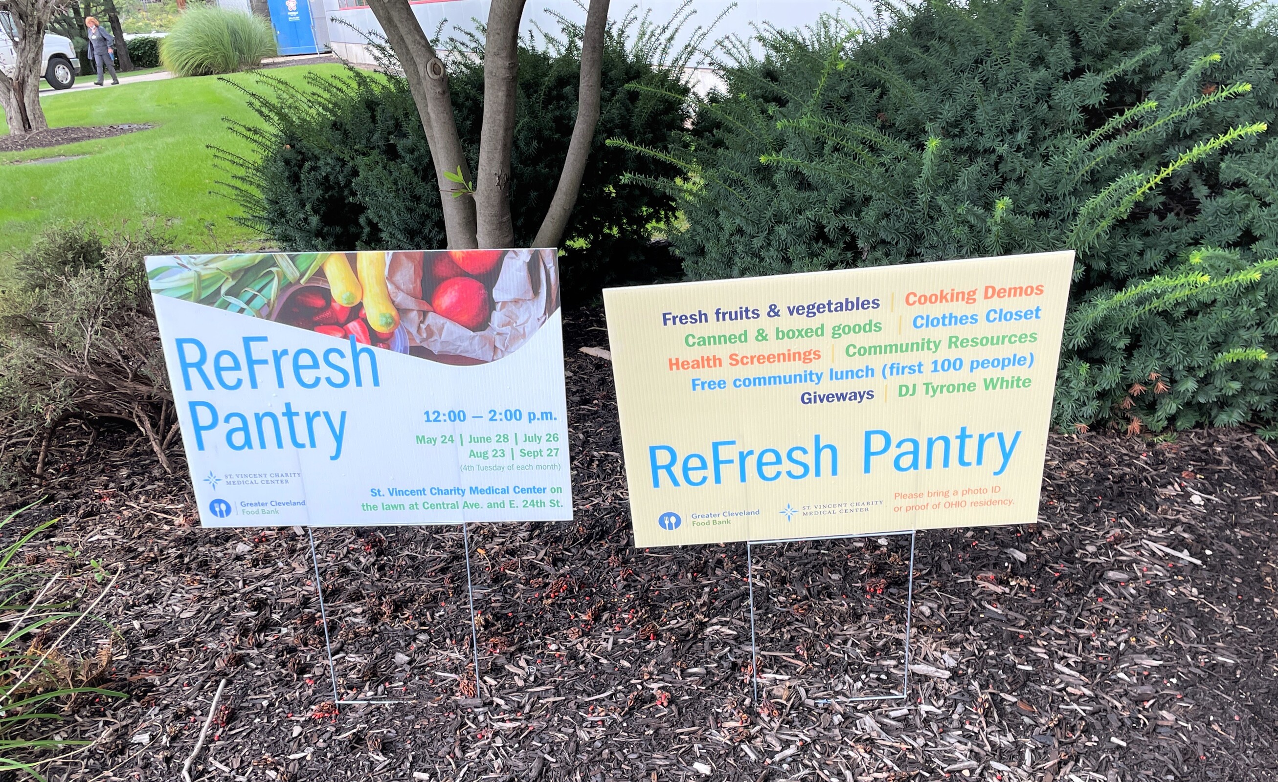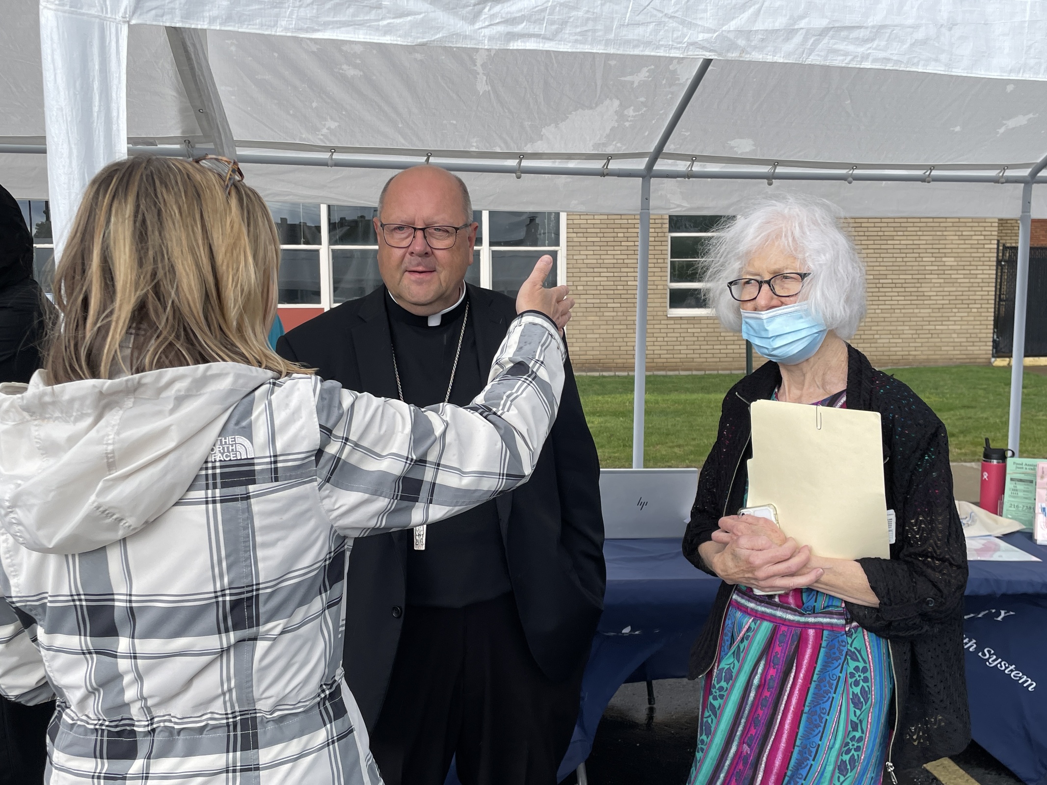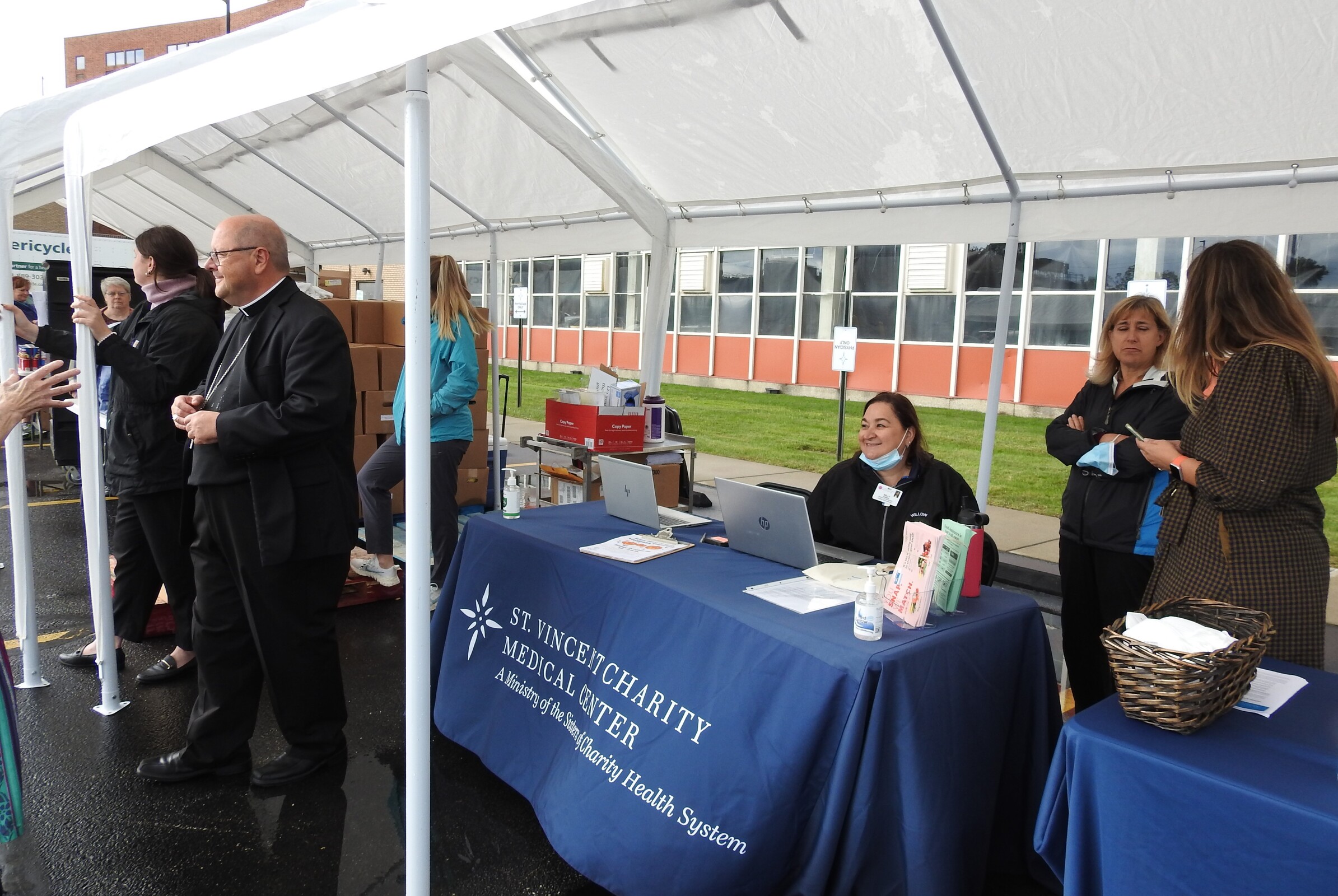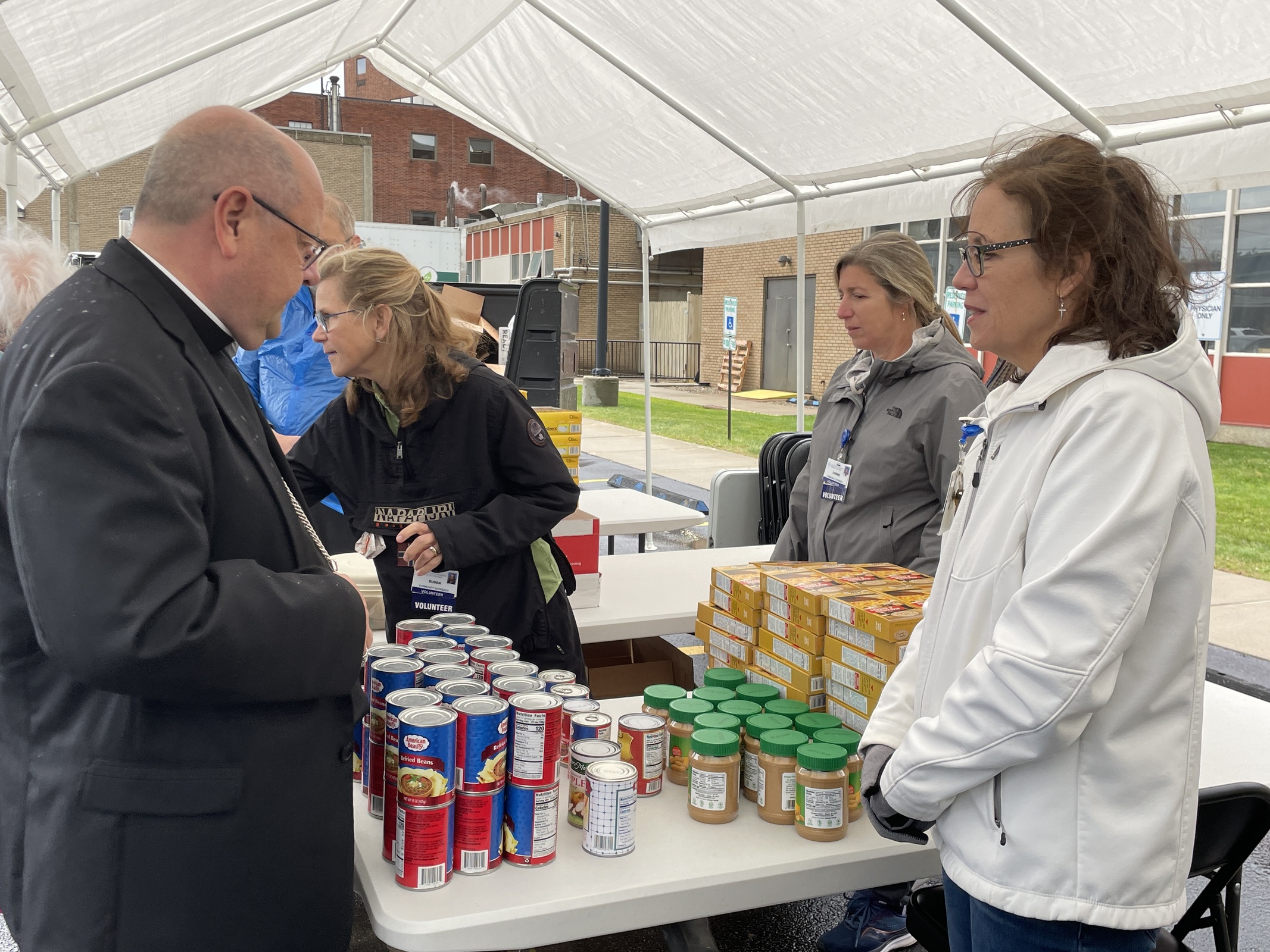 Bishop Edward Malesic visited the medical center on Sept. 27 to celebrate Mass and to observe the operation of the Refresh Food Pantry, a monthly program that operates during lunchtime from June through September. It welcomes those in need to register and receive a hot lunch, food, produce, blood pressure and other checkups and more. Often there is music, as well. Unfortunately, the day of the bishop’s visit, which was the final pantry day for the season, rain forced a reduction in operations.