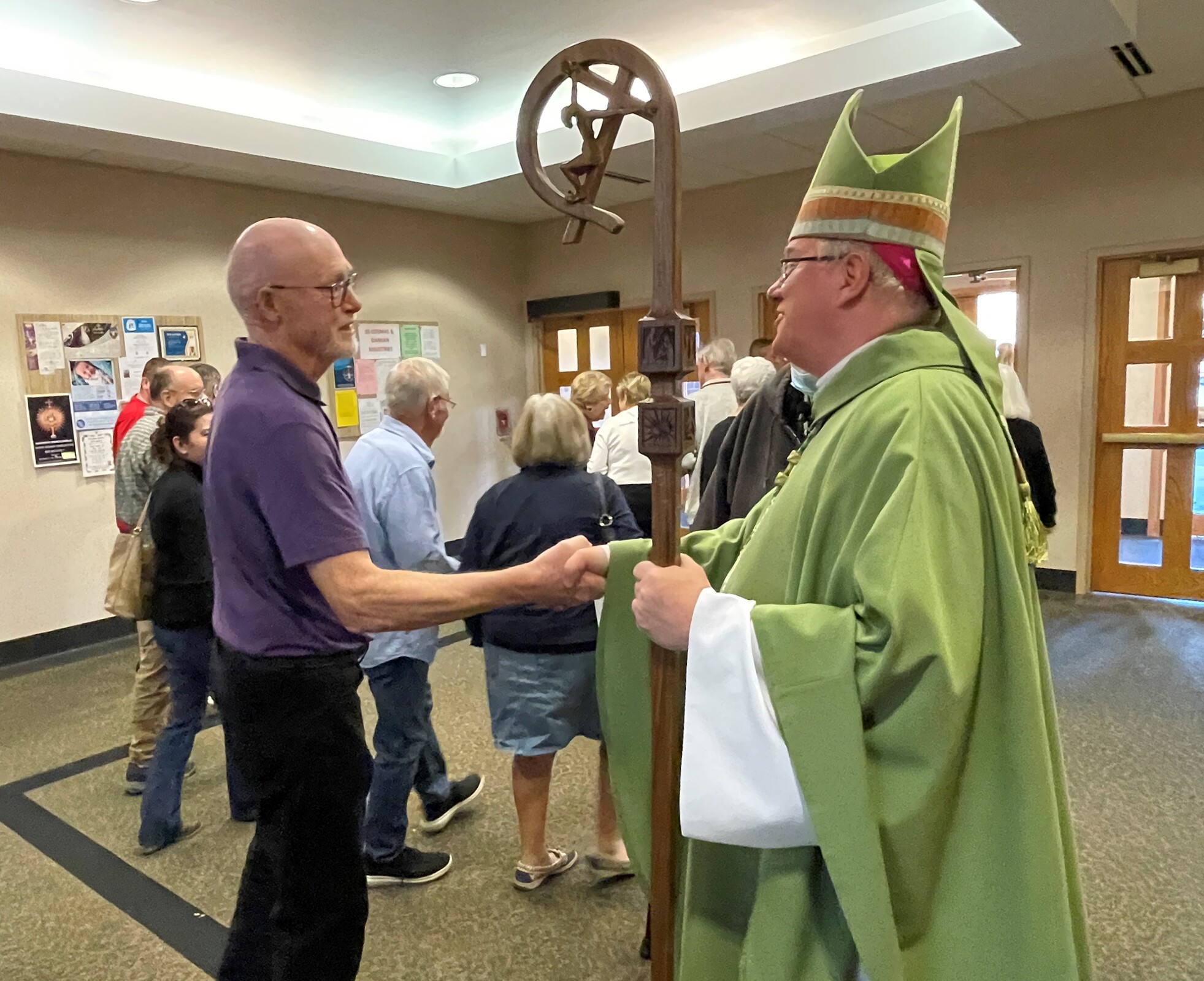 At the conclusion of Mass, Bishop Woost said the Blessed Sacrament would be exposed in a monstrance so the congregation could spend a few minutes in adoration. “We behold God and he beholds us,” he said, adding, “We see each other living in each other.”