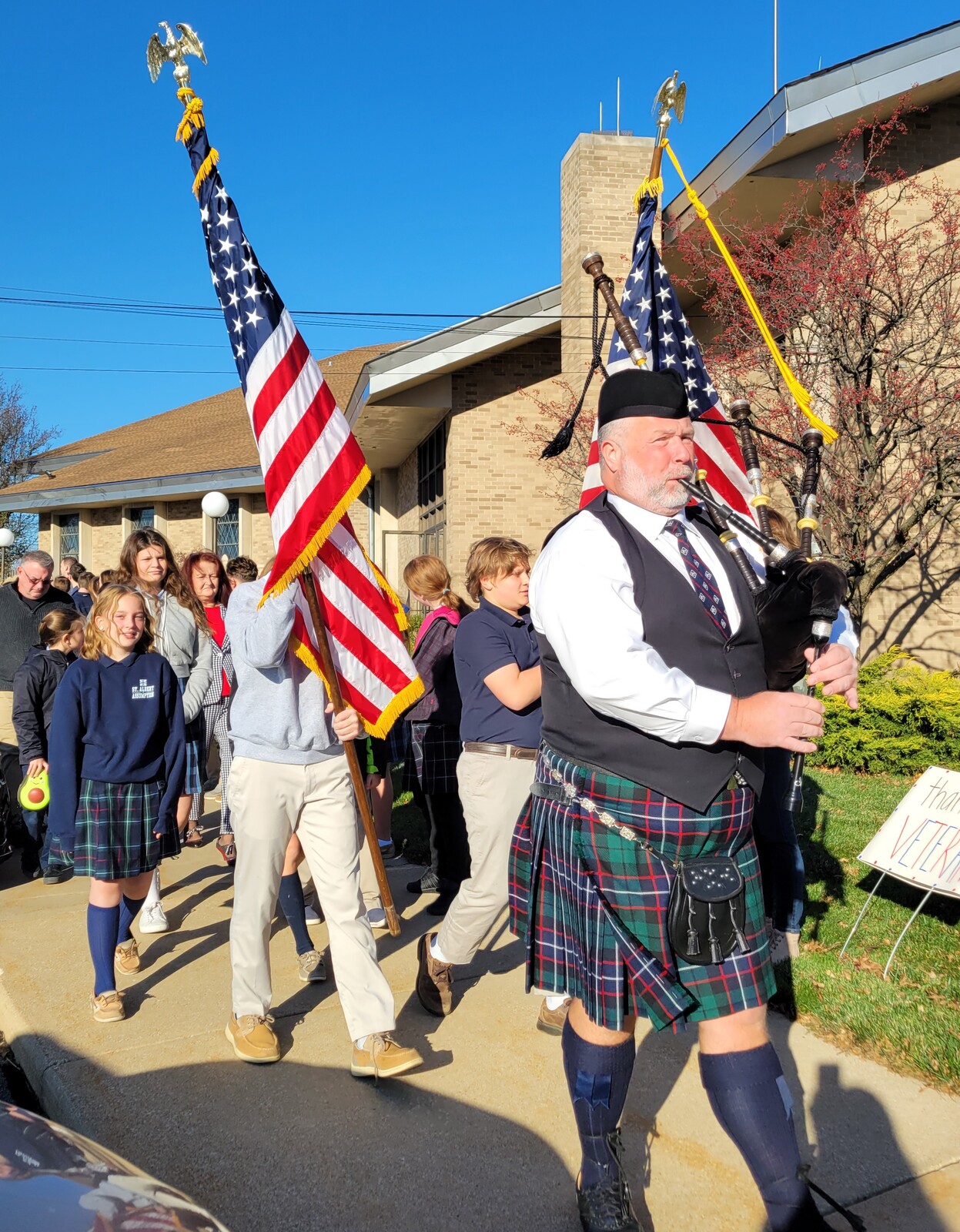 After Mass, the students lined up as a bagpiper led the veterans in a procession to share in a breakfast and program hosted by the Assumption Student Council and staff. Students in kindergarten through eighth grade, the seventh-grade bell choir and the school’s Viking Choir performed patriotic songs.