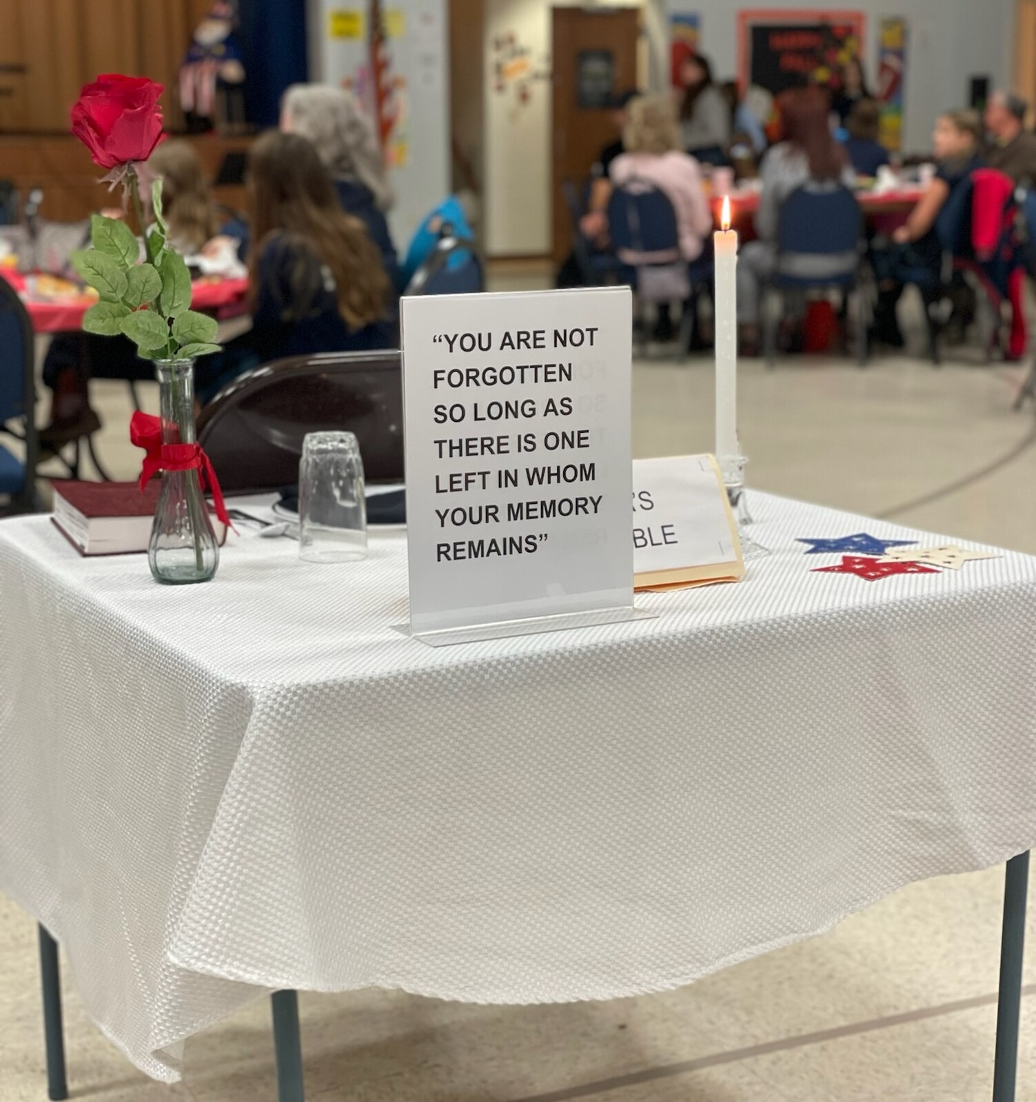Students participated in the traditional Veterans Day White Table display honoring the men and women who served in the nation’s armed forces and who are missing from the ranks. The display includes: