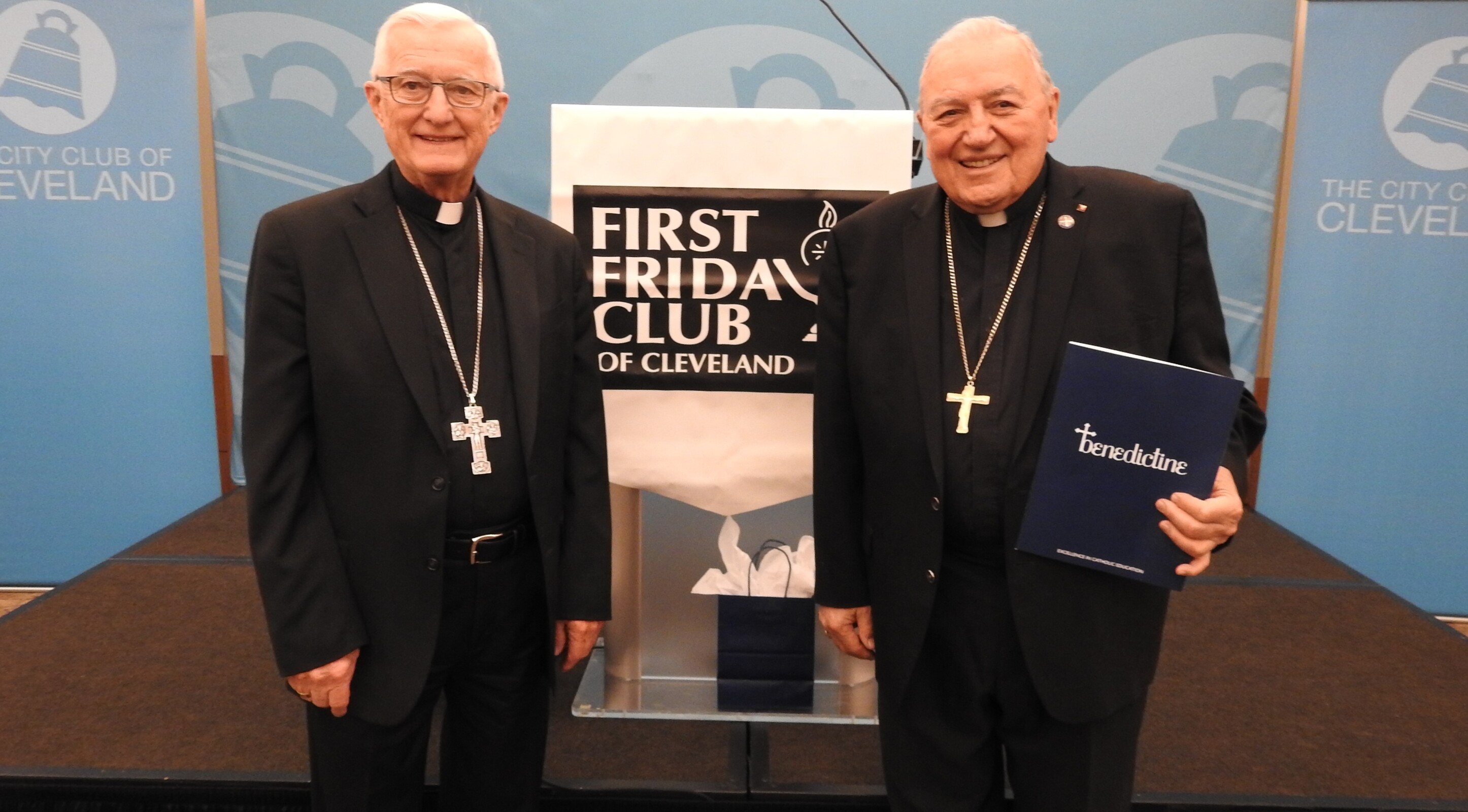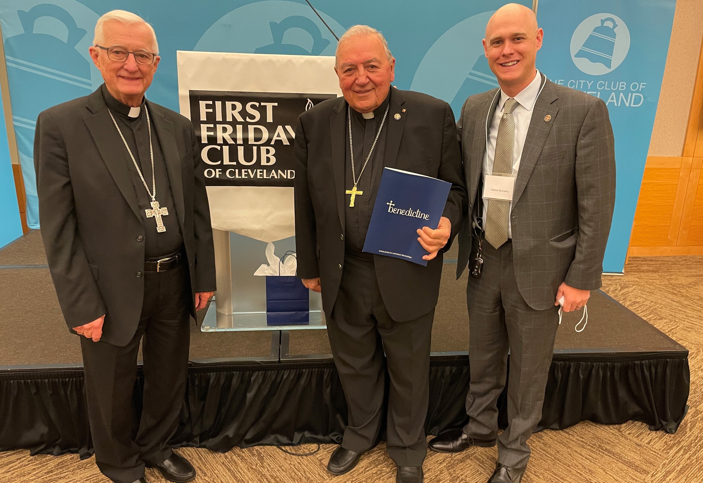 It was a full house for the Dec. 1 First Friday Club of Cleveland program when Auxiliary Bishop emeritus Roger Gries shared the story of his life as a Benedictine monk, teacher, coach, school administrator, prior, abbot and auxiliary bishop of Cleveland. In attendance were fellow priests, monks, students from some Catholic high schools – including a contingent from Benedictine – friends and admirers of the beloved bishop.
