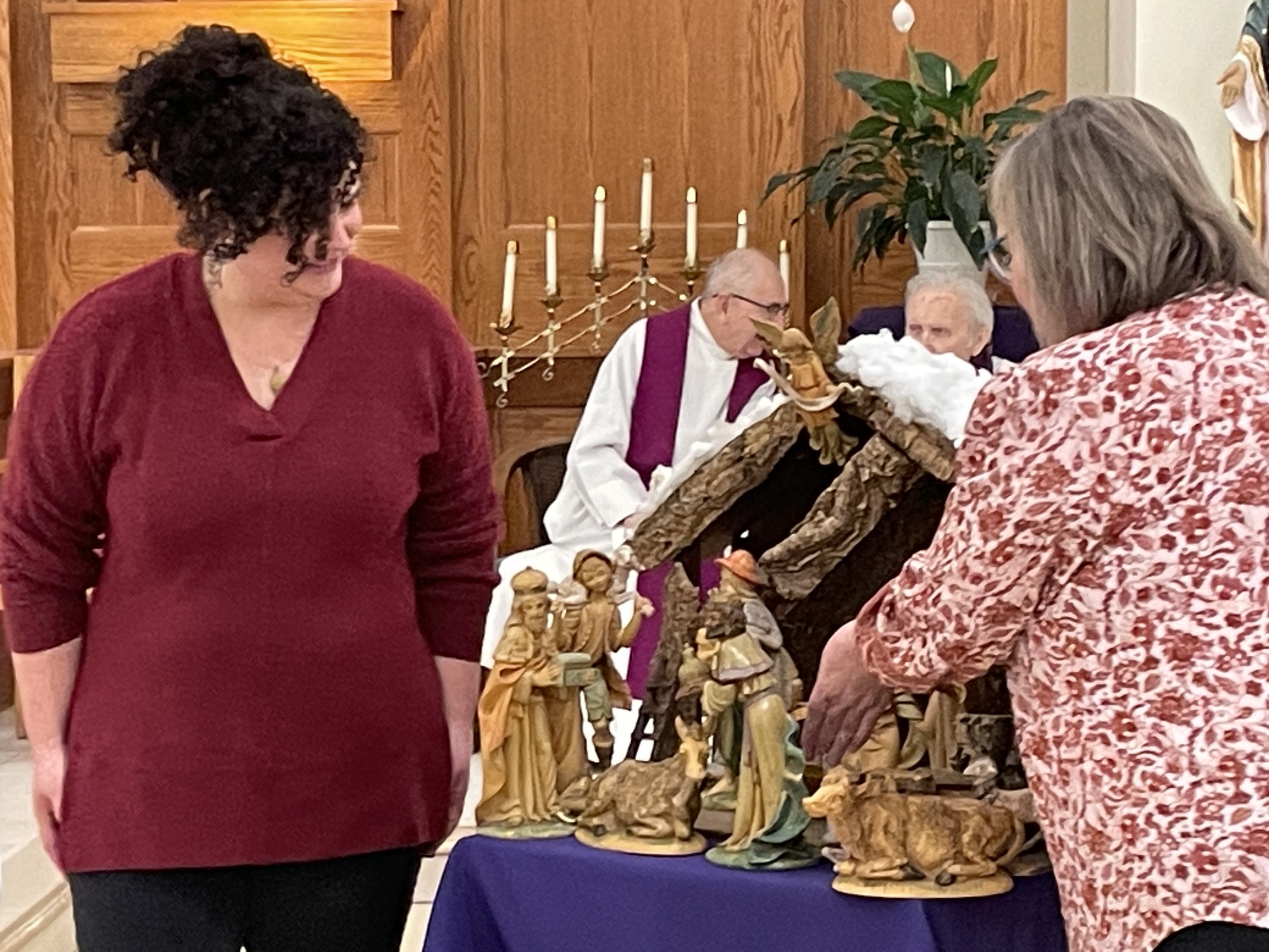 According to tradition, members of the community volunteered to carry figures from the Nativity set during the offertory procession and hand them to the bishop who then passed them on to volunteers who placed them in the crèche near the altar.