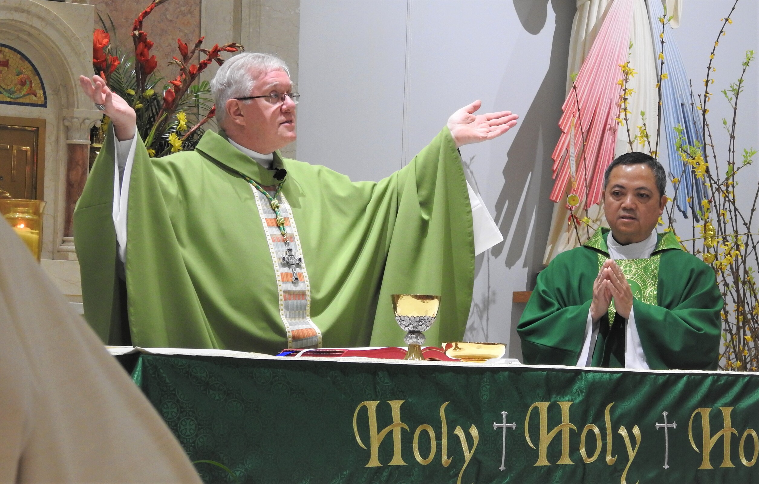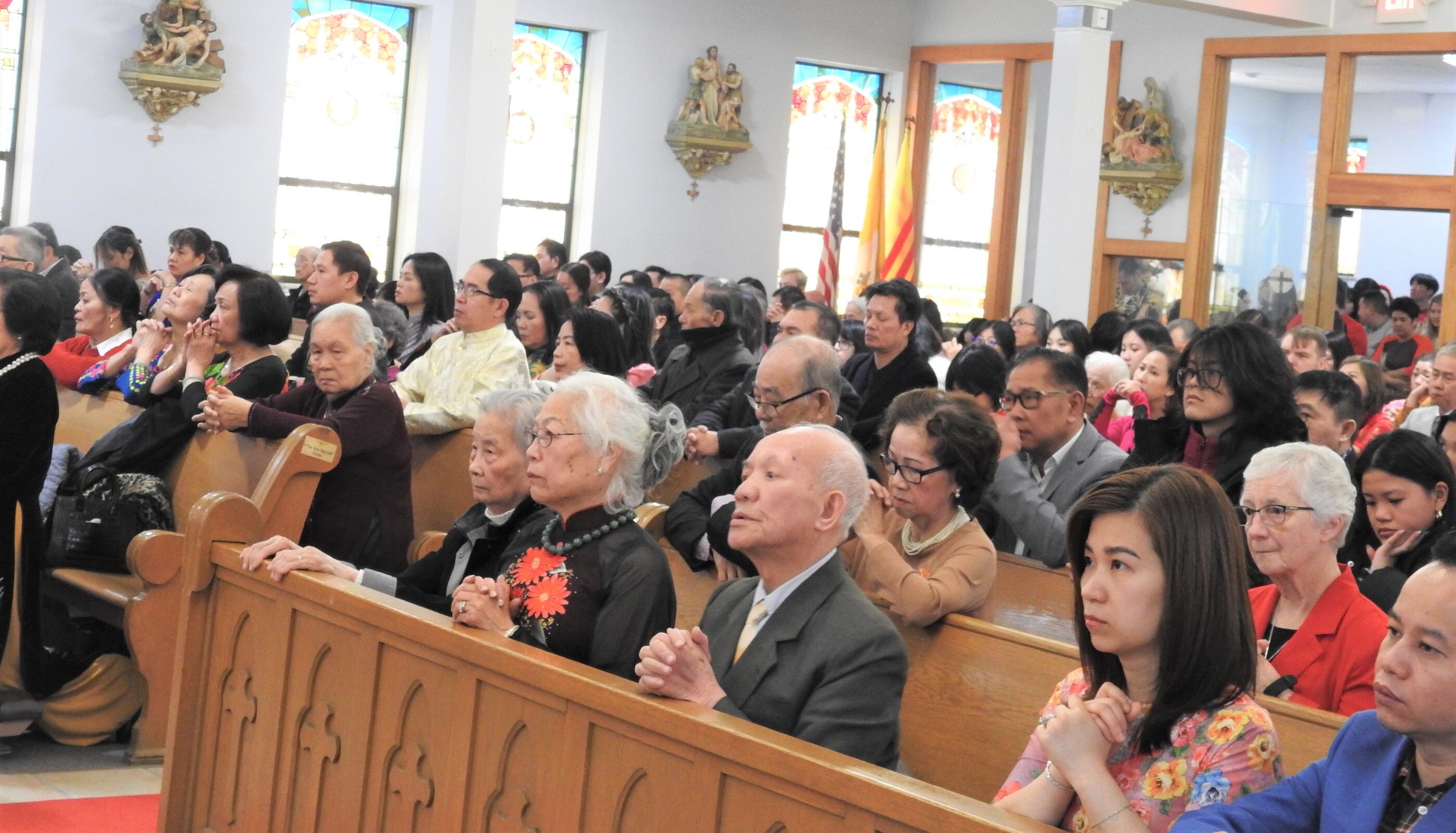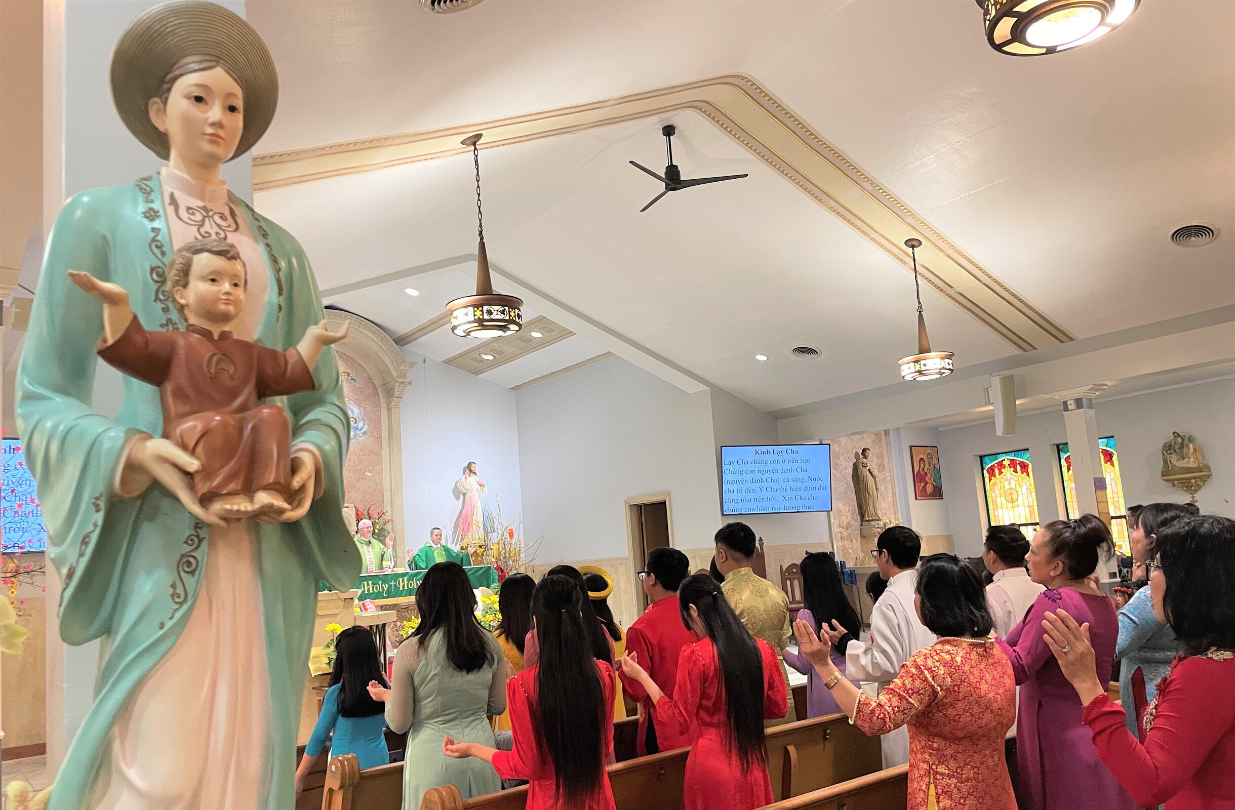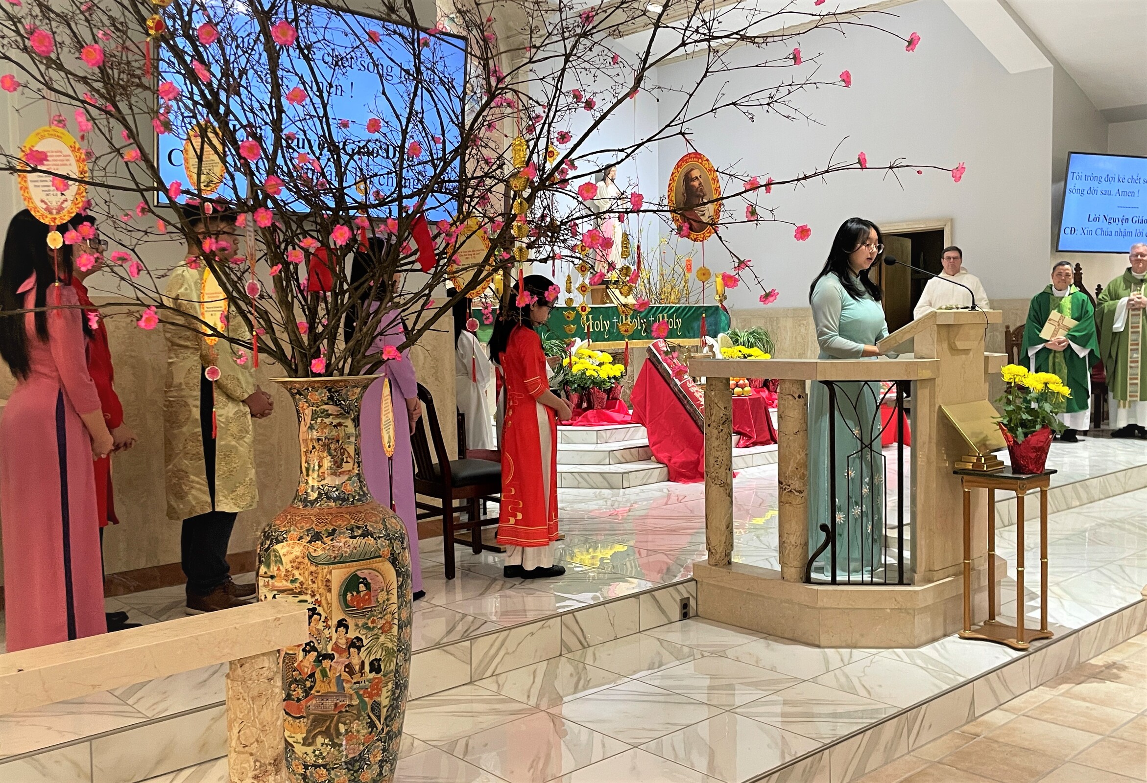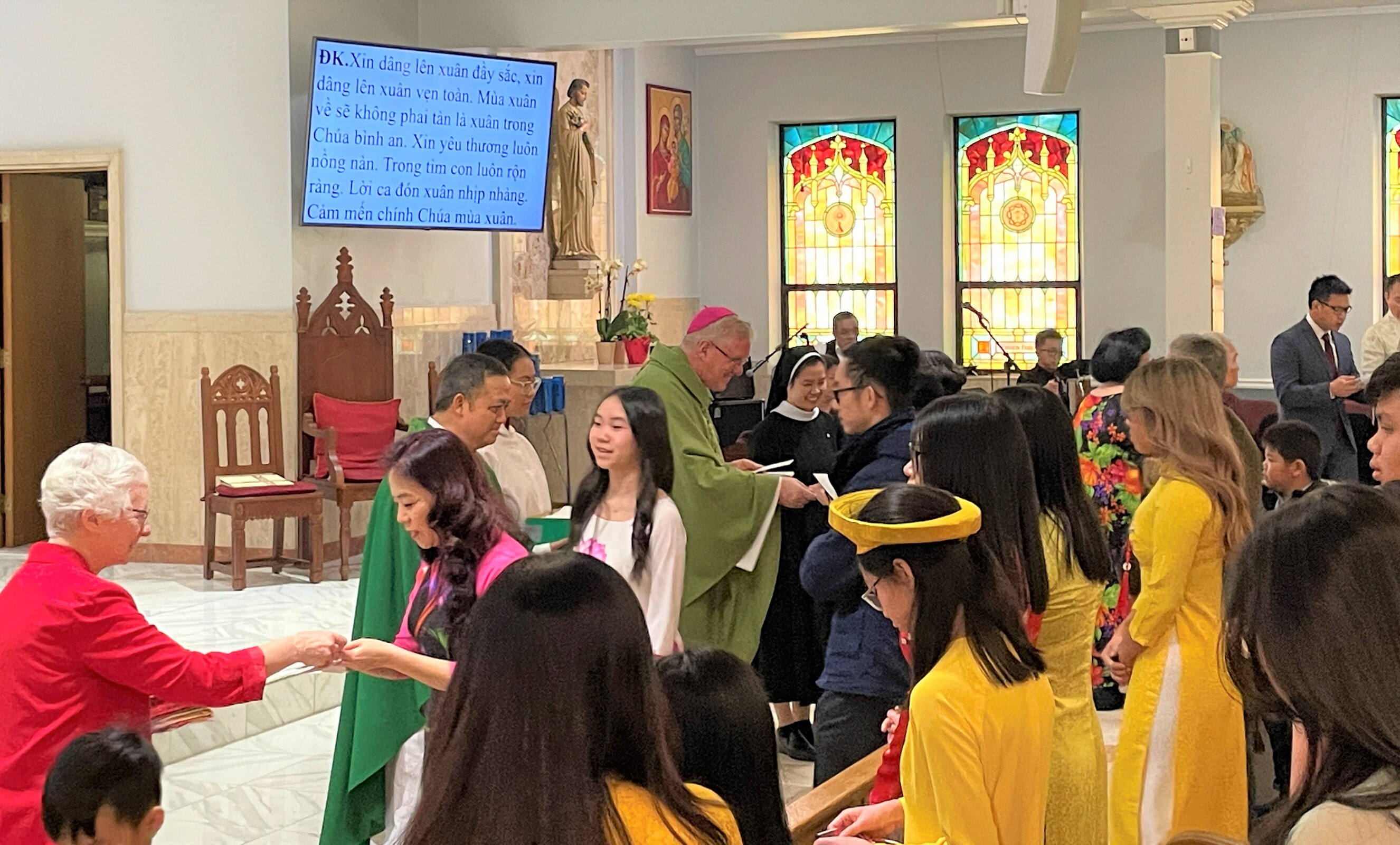 Auxiliary Bishop Michael Woost celebrated Mass for the Vietnamese community. The liturgy was in English and Vietnamese and incorporated some of the Vietnamese traditions, including the use of incense sticks, displays of fruit in front of the altar and cherry blossoms. Members of the congregation also received red envelopes of “lucky money” during the Mass.