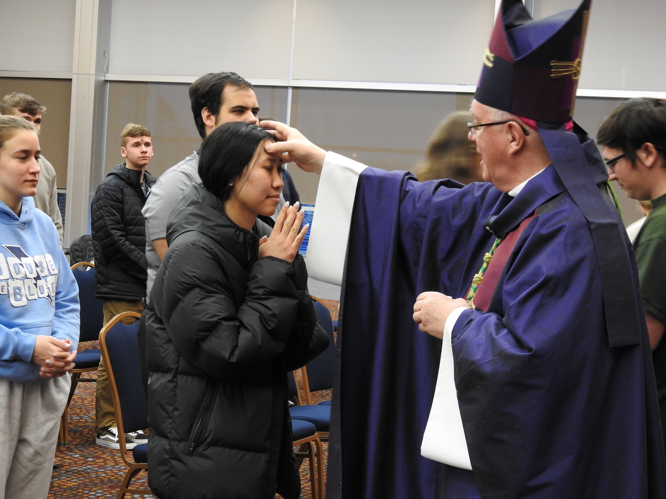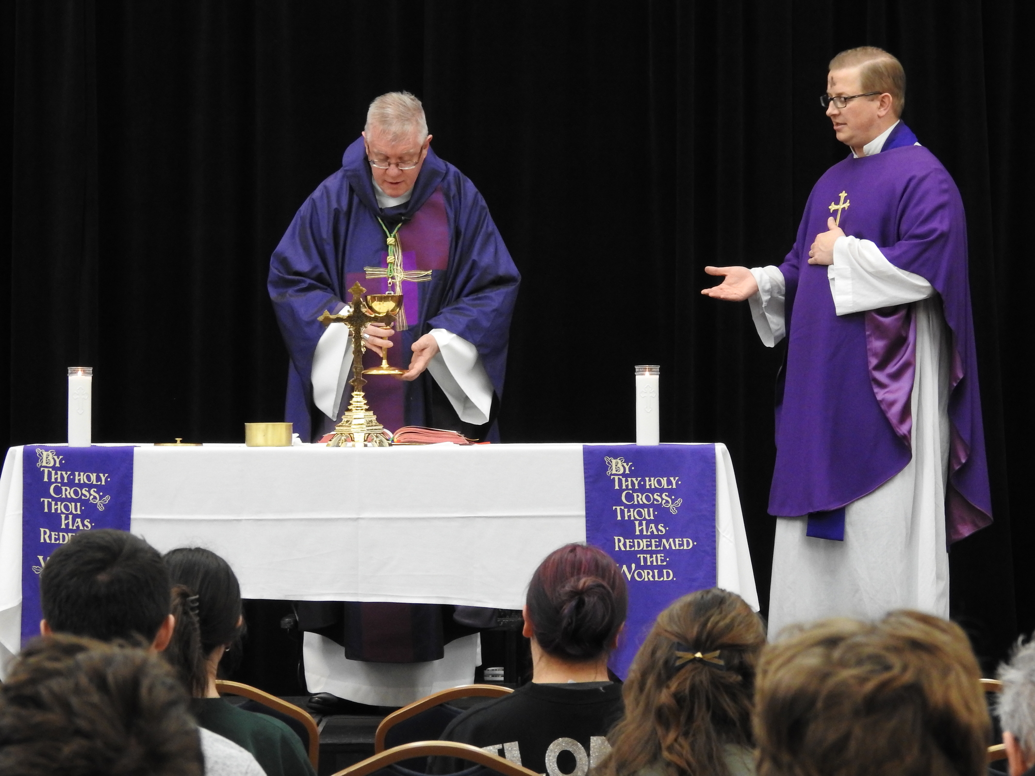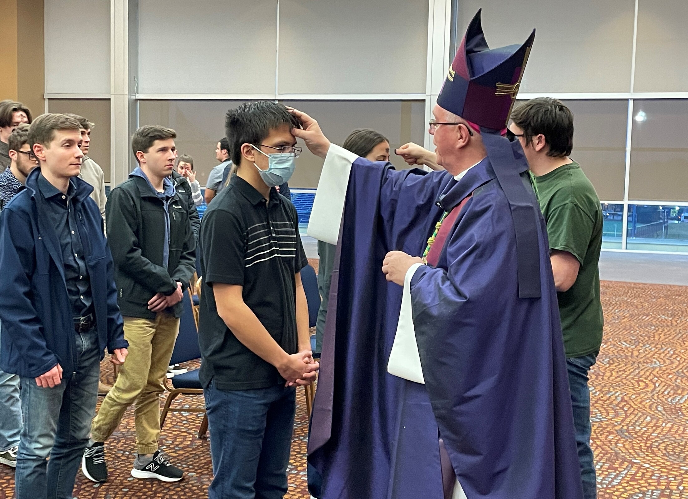 Father Chris Zerucha, the pastor of nearby St. Bernard and St. Mary parishes in downtown Akron, doubles as the Roo Catholic chaplain. He concelebrated the Ash Wednesday Mass with Bishop Woost.