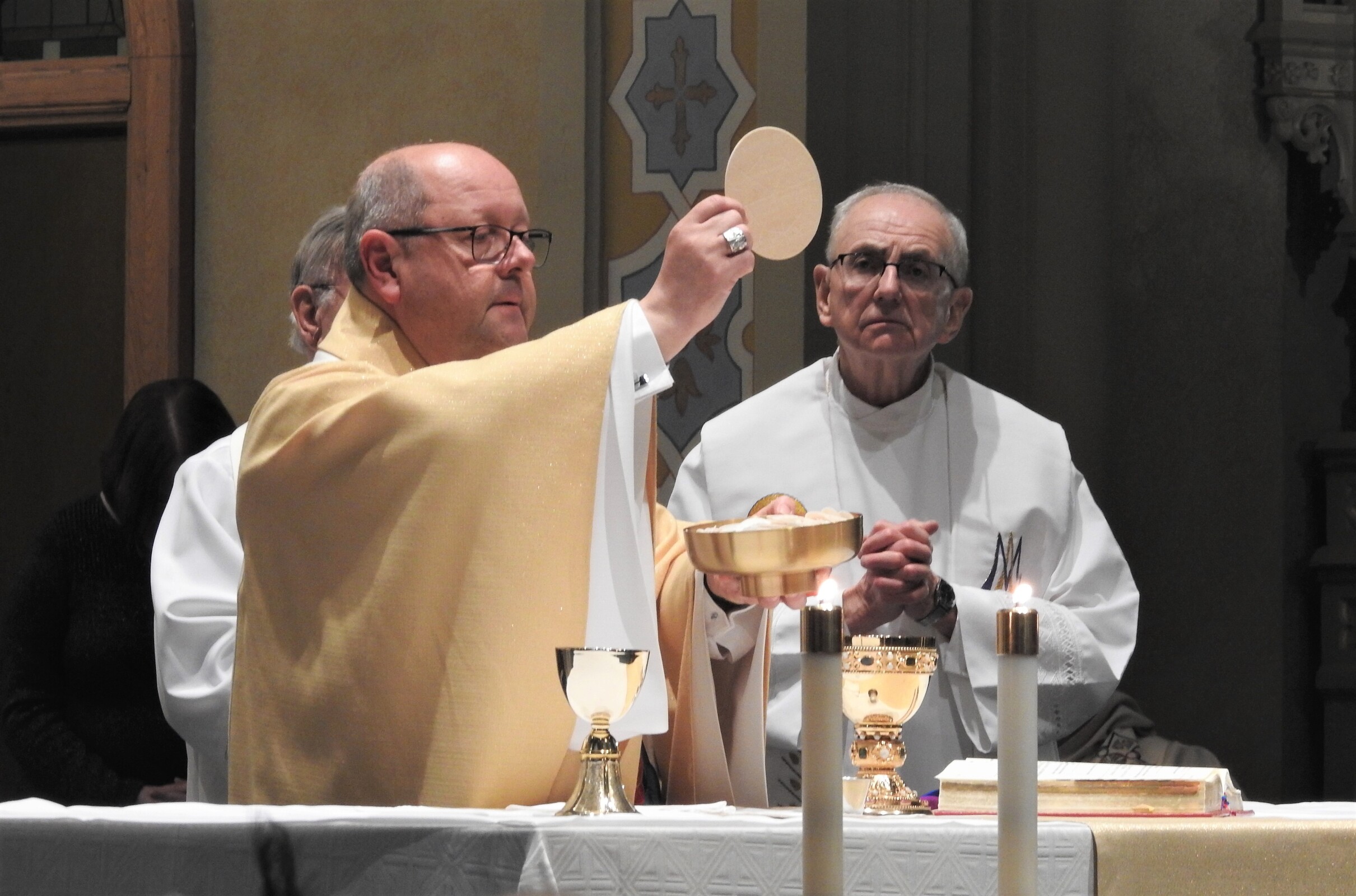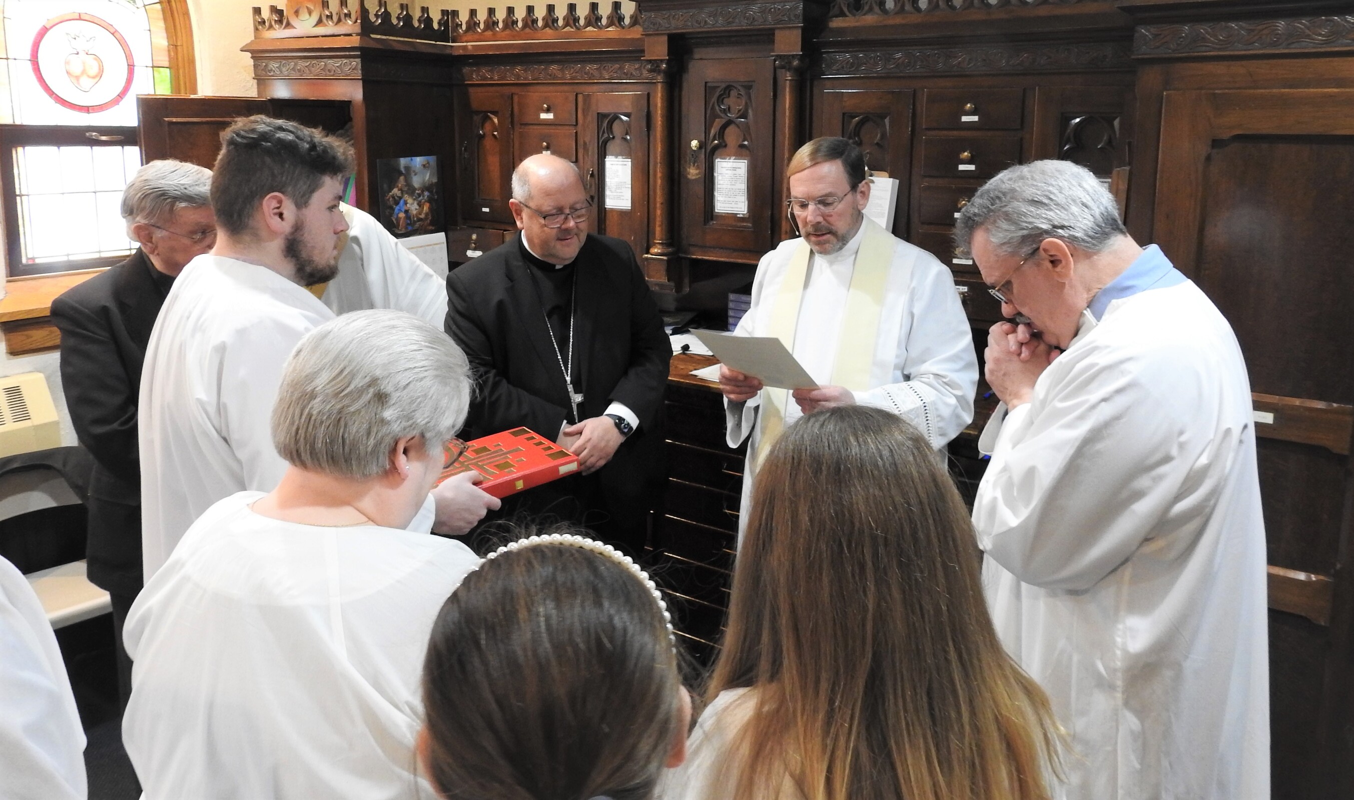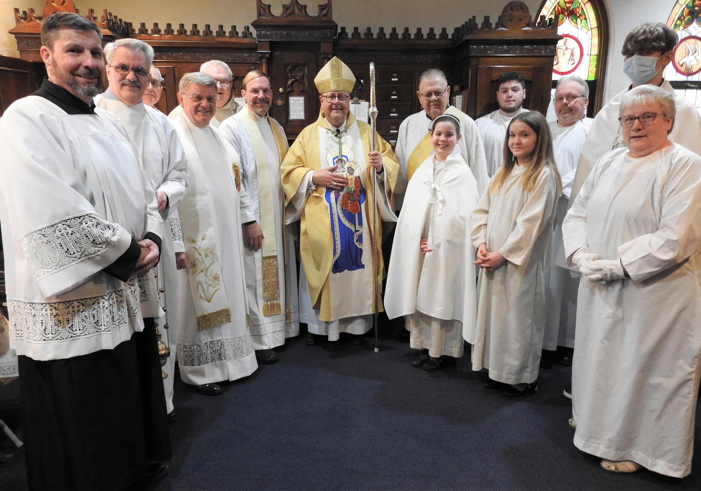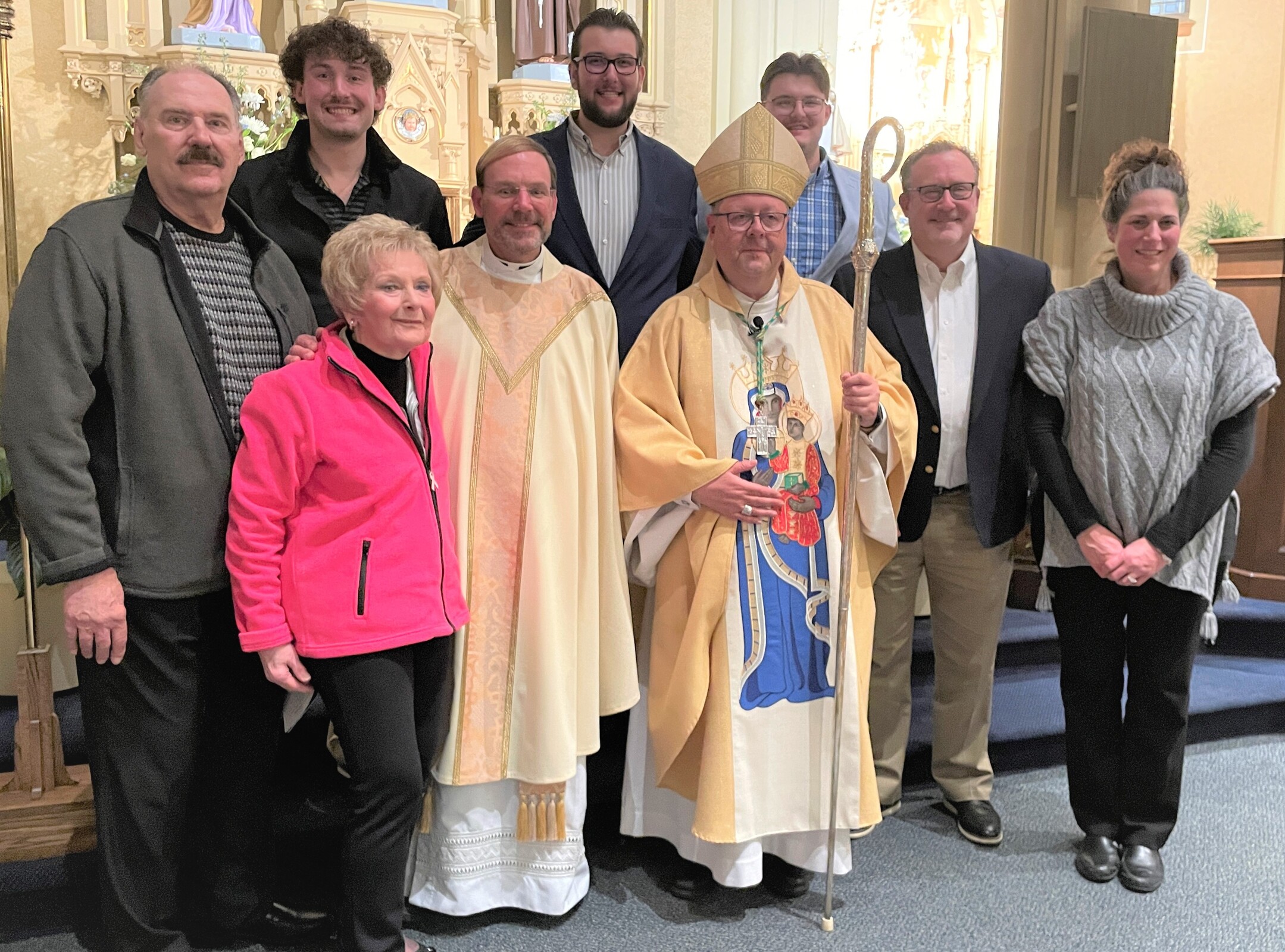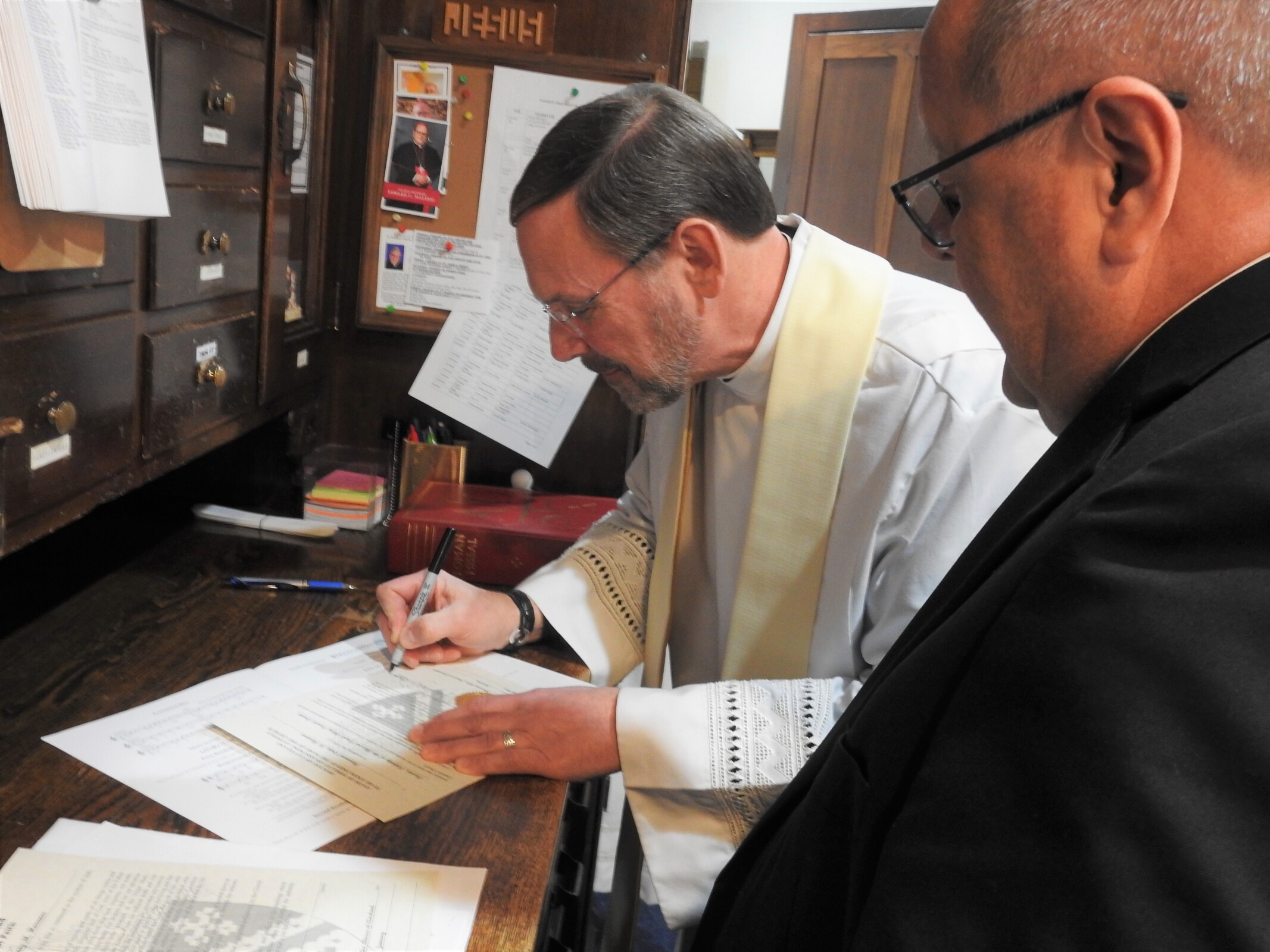 In the sacristy prior to Mass, Father Hovanec and the bishop signed the papers making his position as pastor official. He had been parish administrator since the retirement and death last summer of the previous pastor, Father Robert Glepko, who was remembered fondly at the Mass. Father Glepko’s chalice, which was bequeathed to the parish by his family, was used for the Mass.