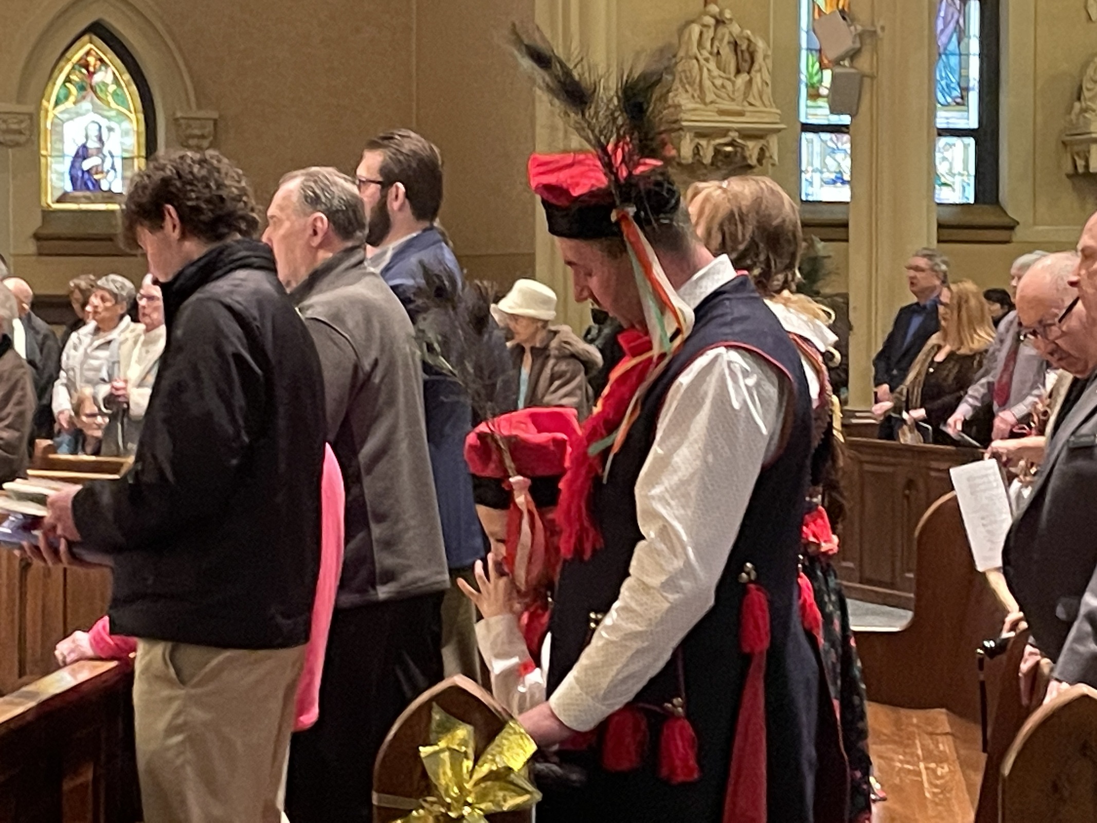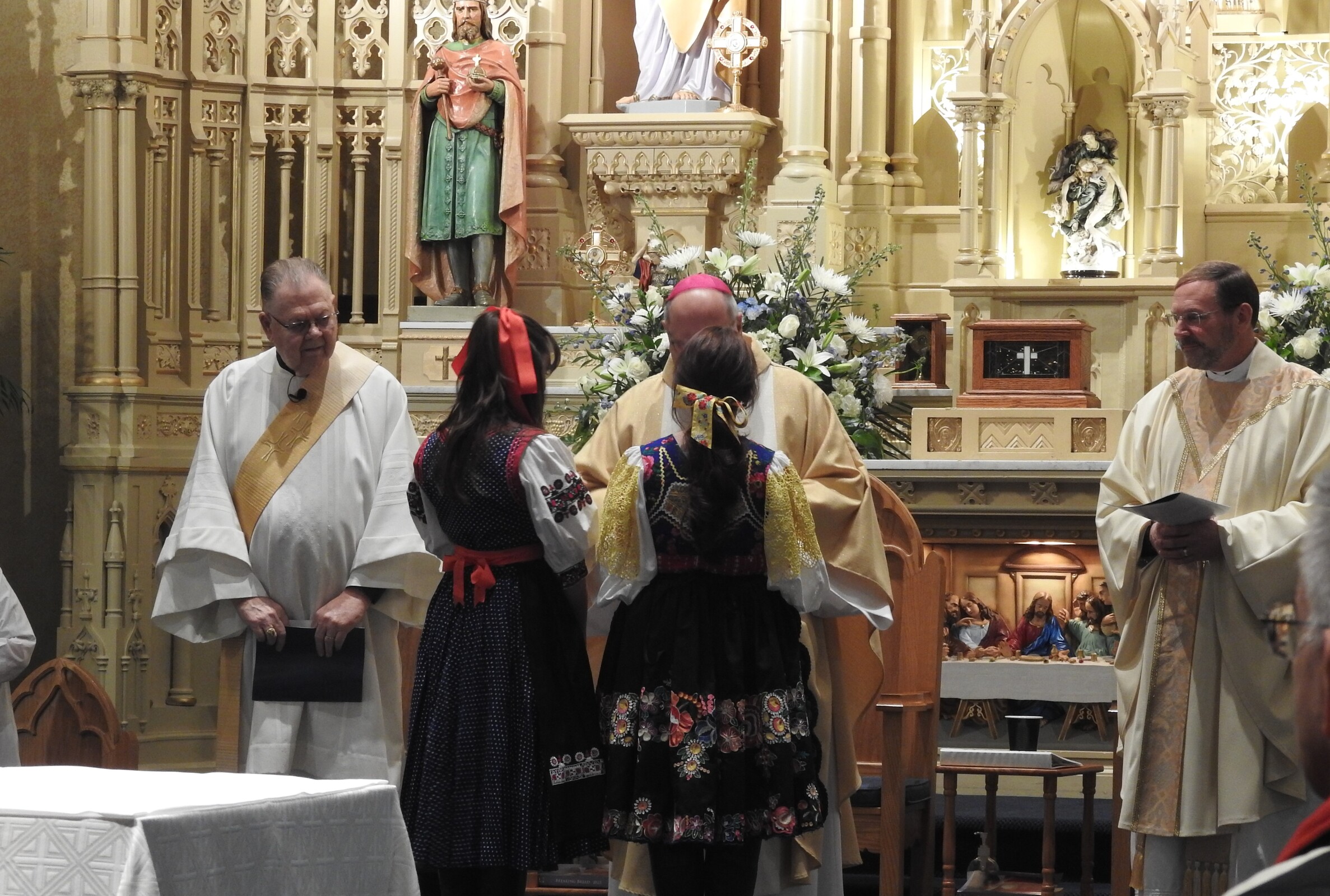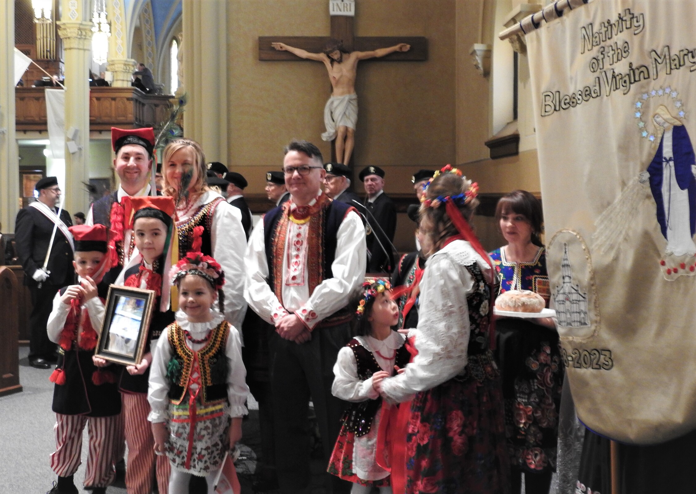 The parish’s Polish heritage was evident as representatives of the ethnic community processed into the church wearing their native garb. The bishop was presented with a loaf of bread and some salt, a traditional Polish welcome.