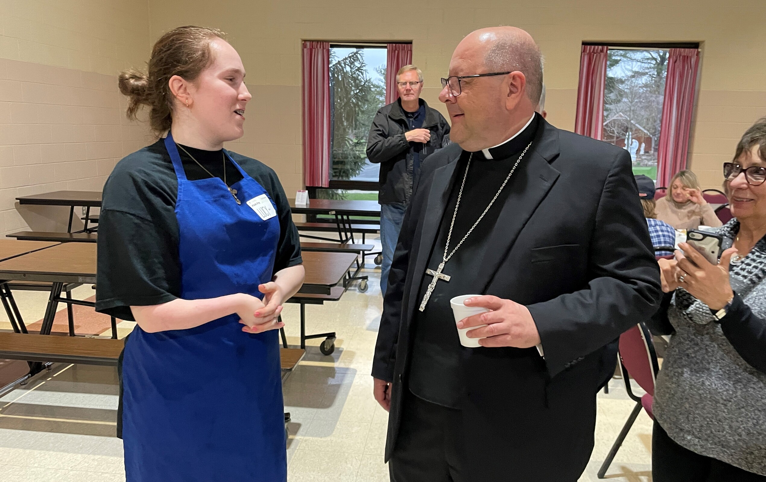 The bishop enjoyed a meal and mingled with the diners before heading to the church for Stations. The fish fry drew a good crowd, all of whom spoke highly about the food. The menu included homemade seafood chowder, fish, mussels, shrimp, fries, cheese pizza and a variety of desserts.
