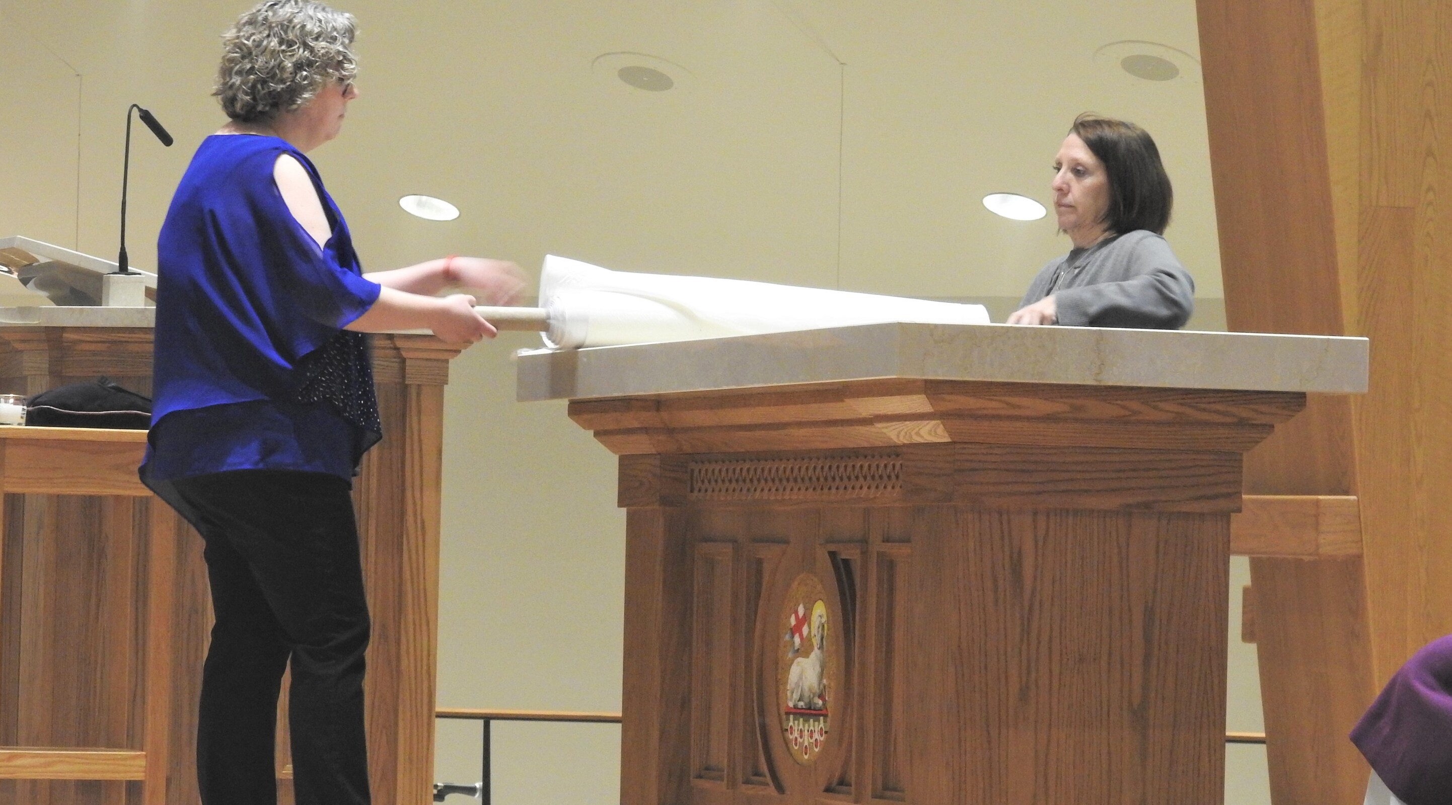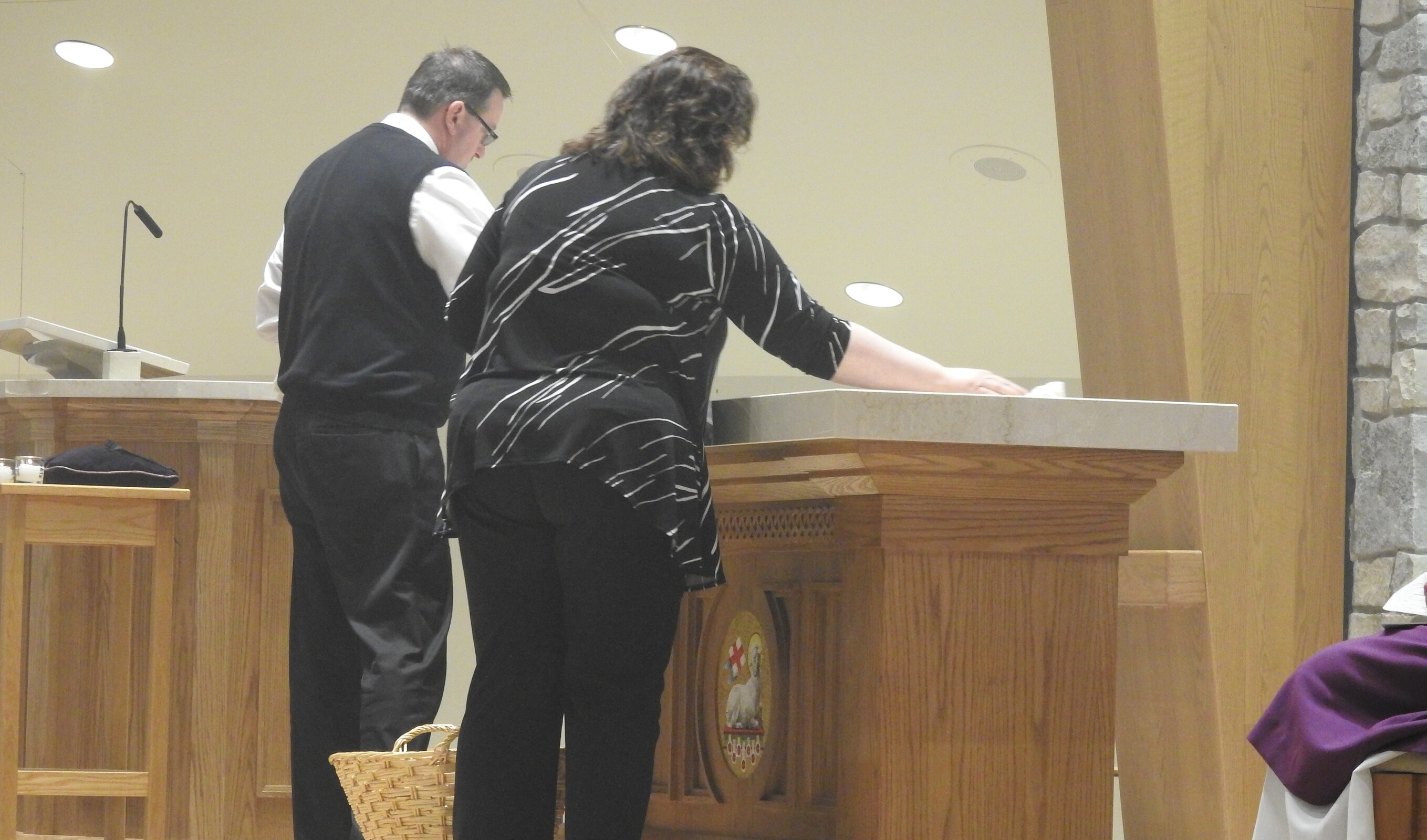 During the dedication, the bishop was joined at the altar by representatives of parish ministries who also helped spread the chrism. The bishop ensured the entire top of the altar was covered with the chrism before two people came to wipe it off. Then the altar was covered with a cloth and it was prepared for the liturgy. A small fire with incense also was lit on the altar during the dedication.