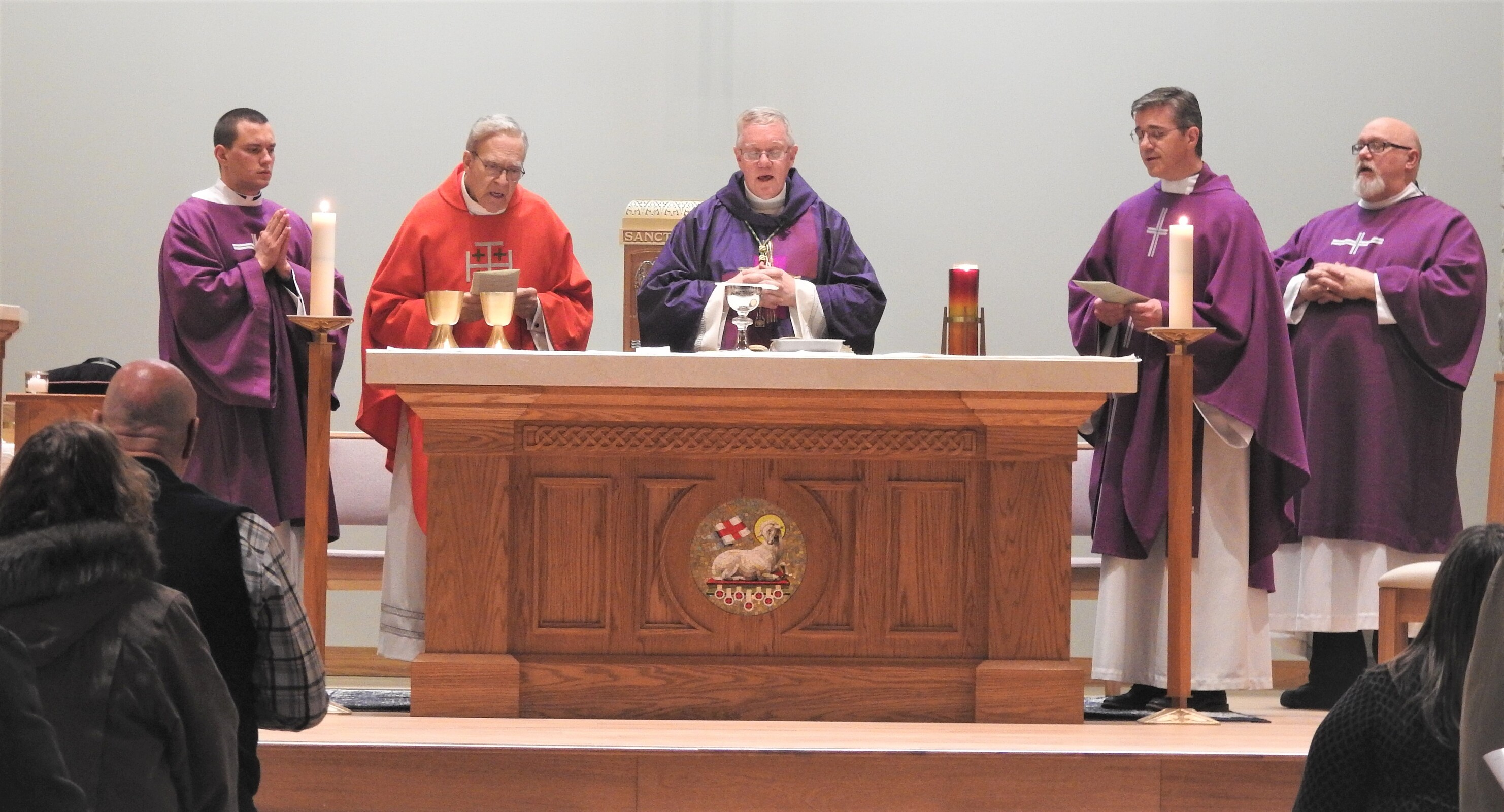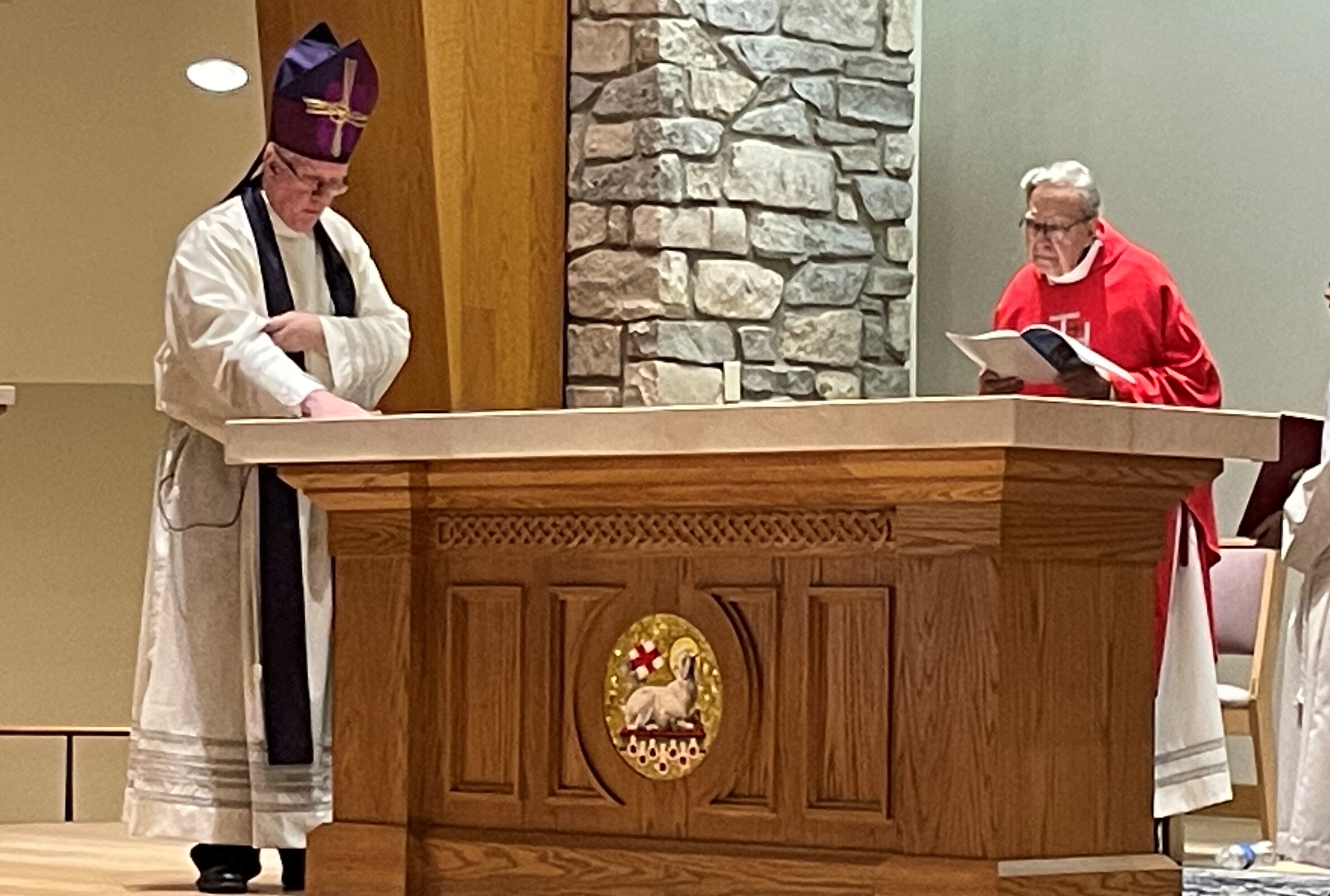 As the altar dedication proceeded, Father Mark Hollis presented the bishop with three saints’ relics to be inserted in the altar. Father Hollis began his priestly ministry 51 years ago at St. Brendan. Relics of Saints Thomas Beckett, Bernadette of Soubirous and John Vianney were inserted in the altar by Bishop Woost. Other relics were placed in the altar previously. The bishop explained that Father Hollis wore red vestments because he was carrying the relics of a martyr. The bishop, concelebrants and deacons were vested in the traditional Lenten purple.