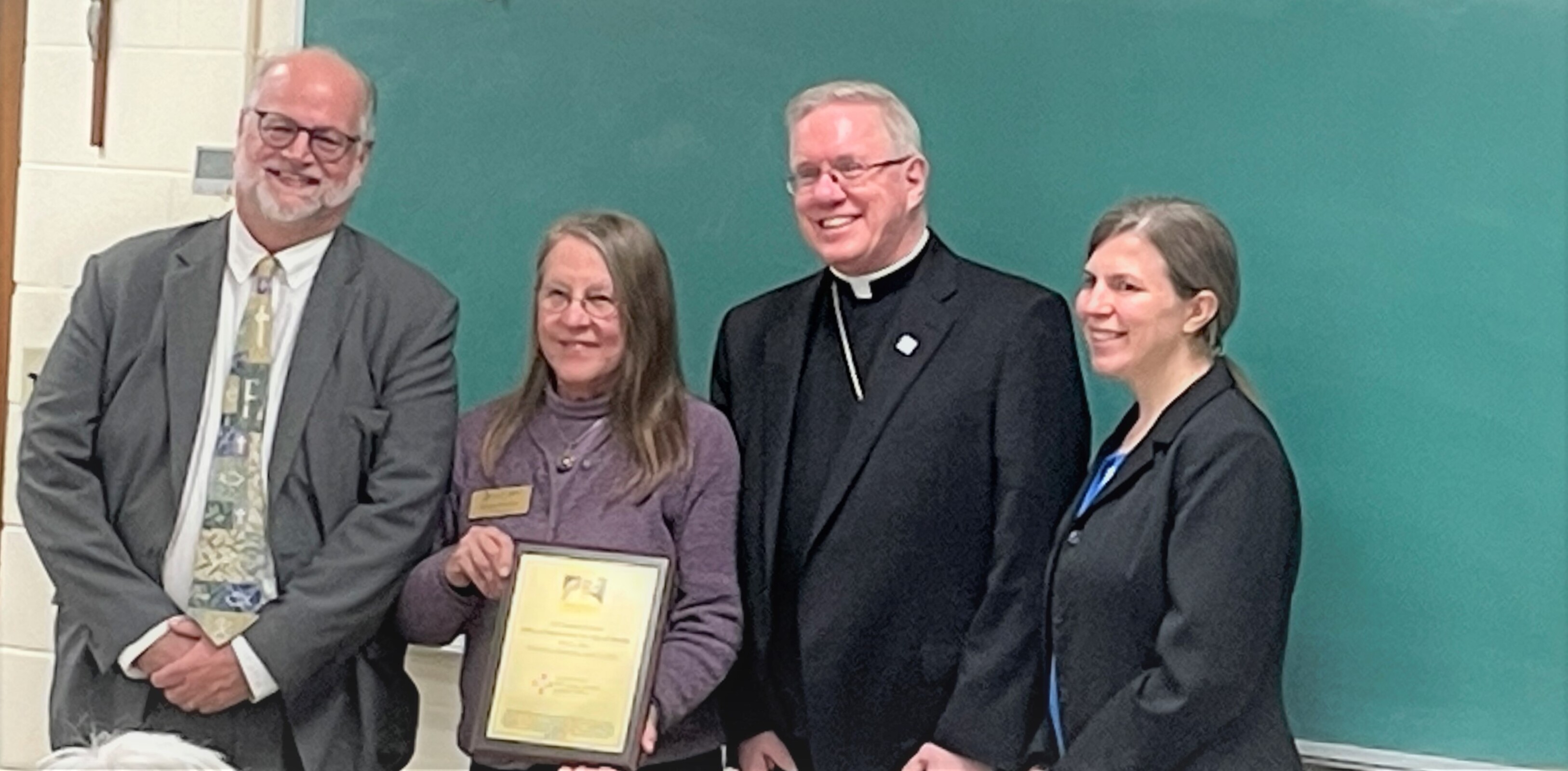 Sharon Kleppel, Lorain Catholic Commission board secretary, presented the Gert Wirscham Faithful Servant Award to the Sacred Heart Peace and Justice Committee. Wirscham, who died in 2015, was a longtime member of St. Mary Parish in Elyria and was devoted to social action and justice causes. She was a founding member and served many years on the Catholic Commission of Lorain County.