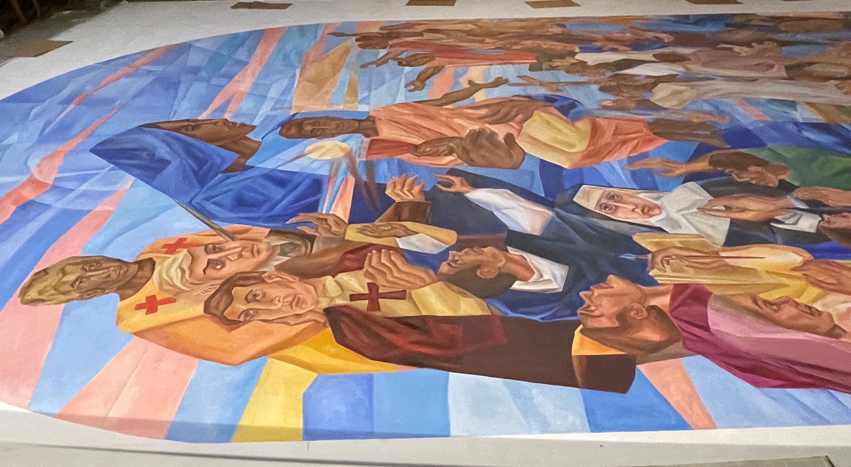 Mother Mary Thomas’ mural originally was commissioned by a parish in Philadelphia, Pennsylvania. However, the parish closed. She adapted the painting and efforts are underway to find a permanent home for it.