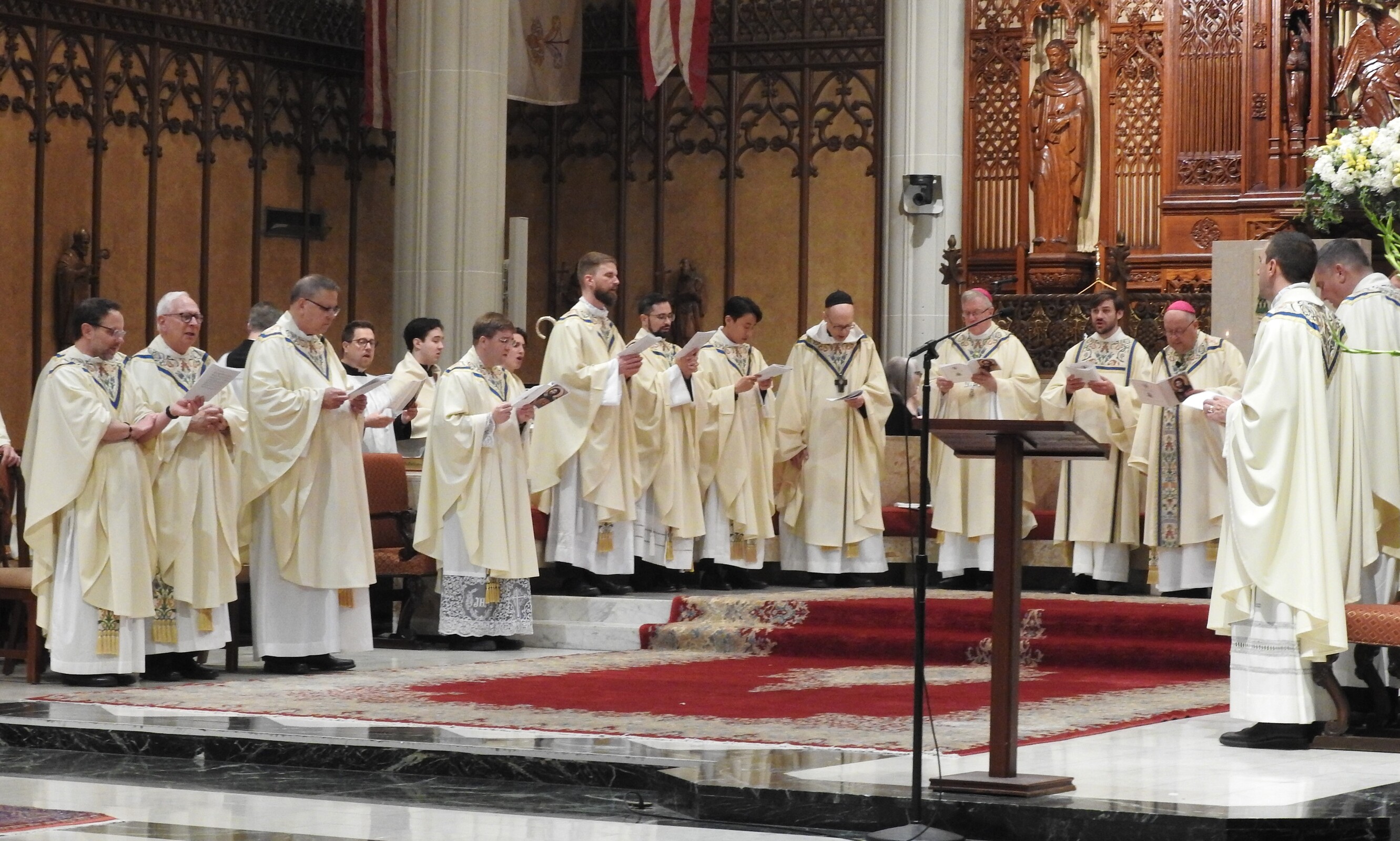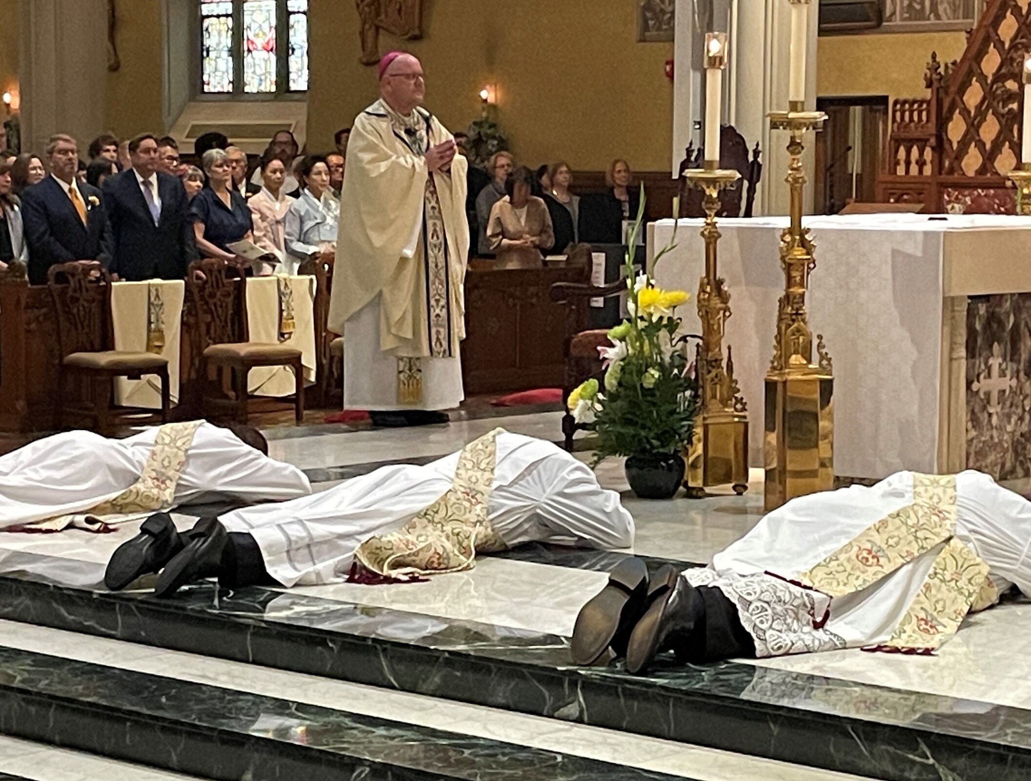The rite of ordination included election of the candidates, promise of the elect, the litany of supplication – during which the six men lay on the cathedral floor – laying on of hands, prayer of ordination, investiture with stole and chasuble, anointing of hands with sacred chrism and the fraternal kiss during which other priests at the Mass embrace each of the newly ordained.