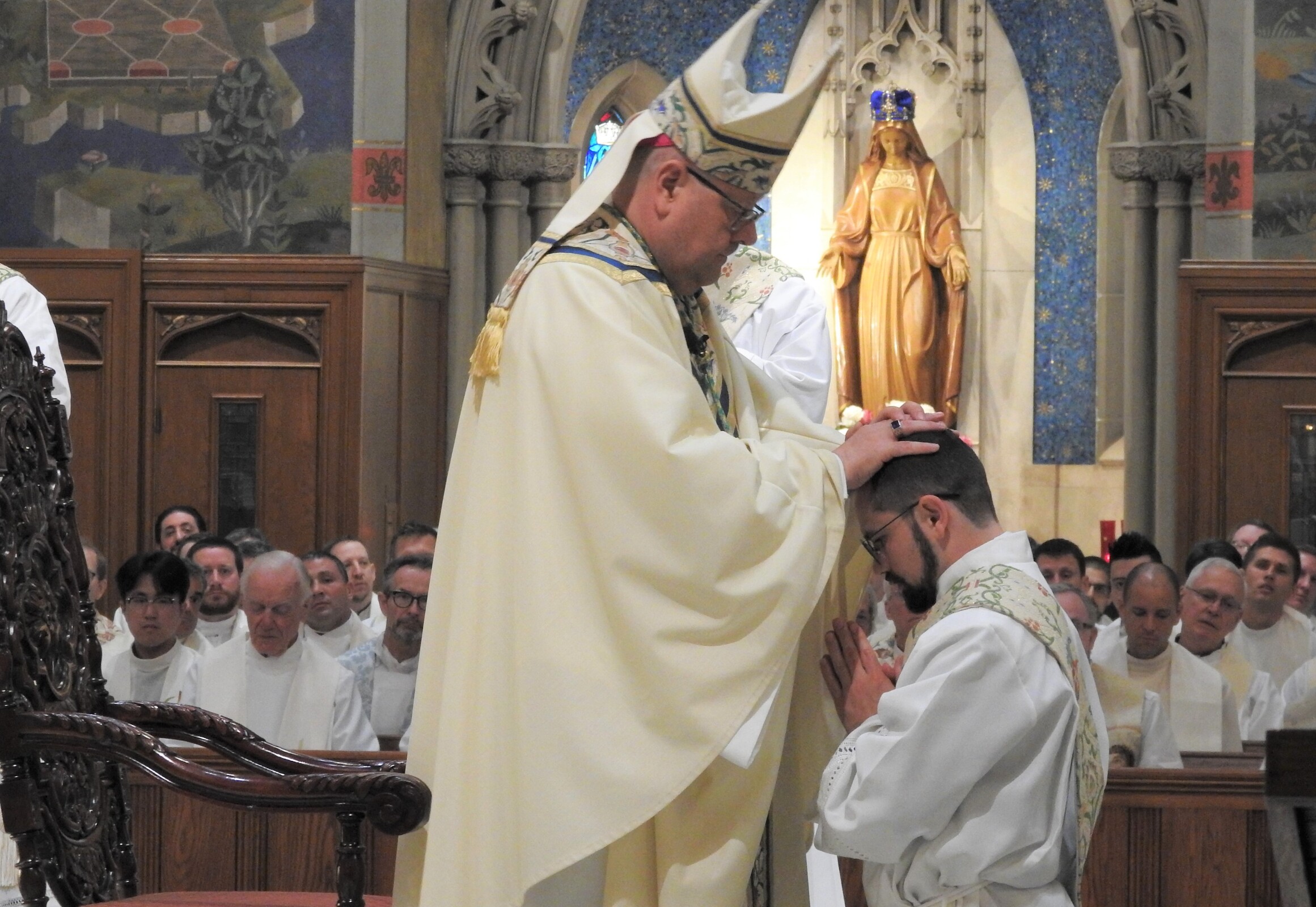 The bishop reminded the newly ordained that they were chosen by Christ to love him and his Church as priests. But he also cautioned them that like new fathers, there is much to learn. He encouraged them to seek help from experienced pastors, brother priests, deacons, staff, knowledgeable laypersons and women. “Of course, the best mother to listen to is Mary, who is the mother of priests,” he said, noting they should seek her advice and intercessory help, especially under her title of Mary, undoer of knots. “Try not to make too many knots of your own for her to untie. She’ll appreciate it,” he added.