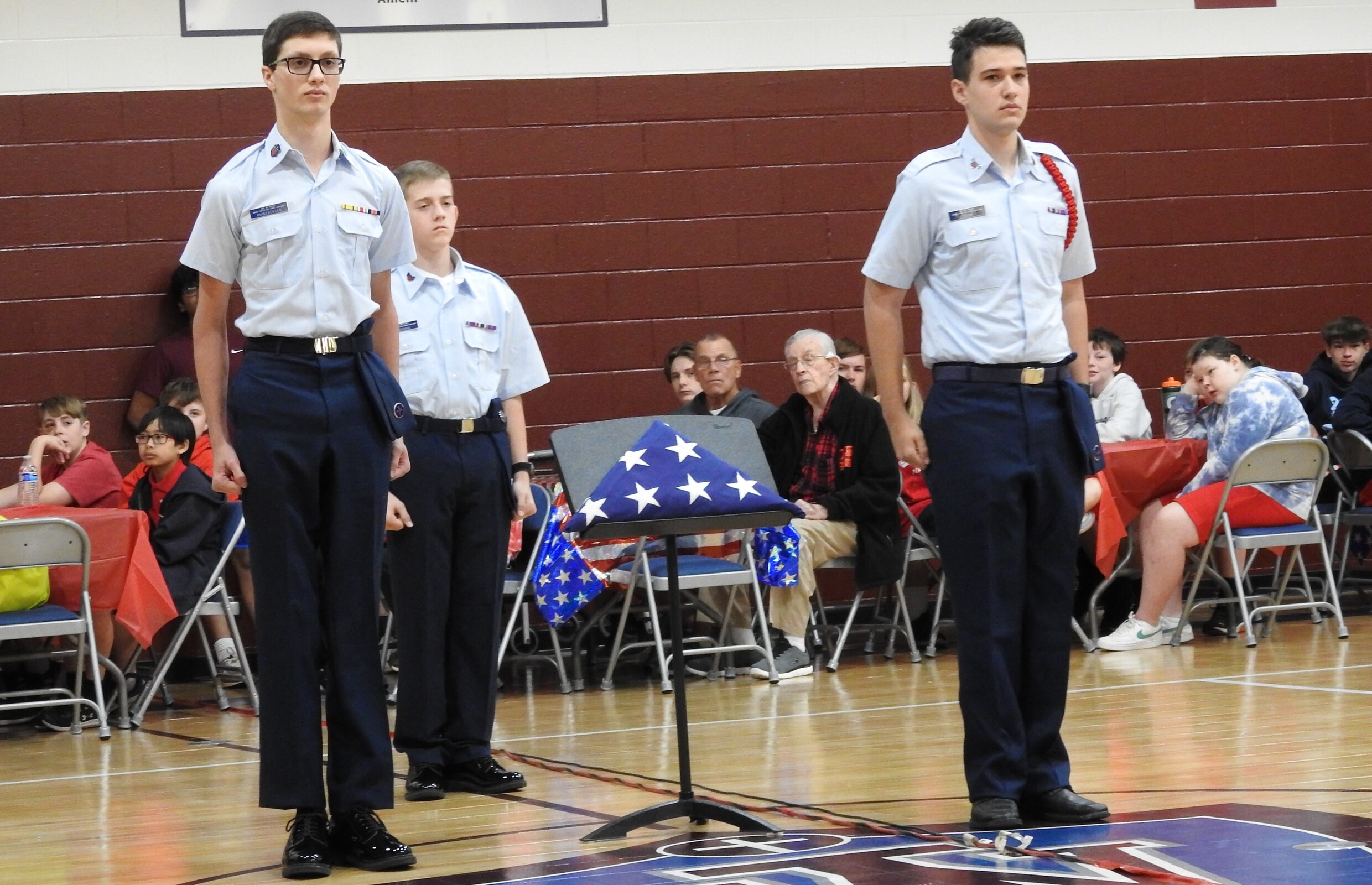 Student members of the Civil Air Patrol explained the 13-fold flag ceremony which takes place at military funerals. Three members of the group demonstrated the ceremony while a fourth explained each step. When finished, the flag resembles a tri-corner hat, which reminds us of those who first fought for our freedoms.