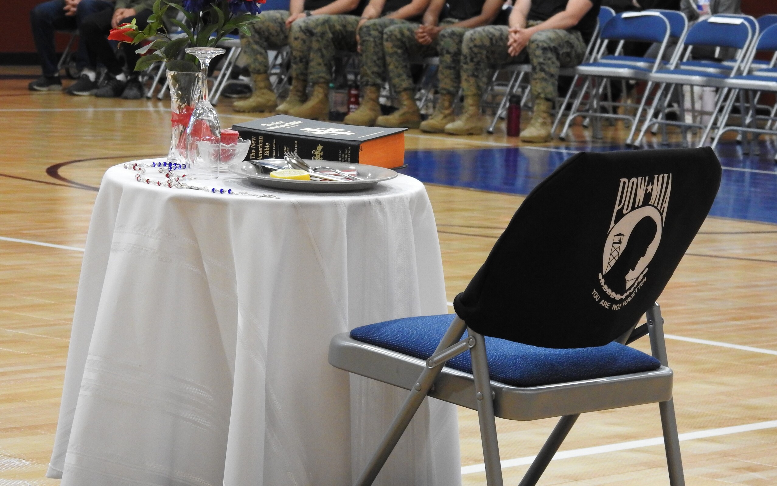 The second ceremony was the POW/MIA table – an empty table that is set in honor of the missing, prisoners of war and those missing in action. The small table is set with a series of symbolic items such as a rose, lemon slice, Bible, inverted glass and an empty chair on which a POW/MIA covering was placed.