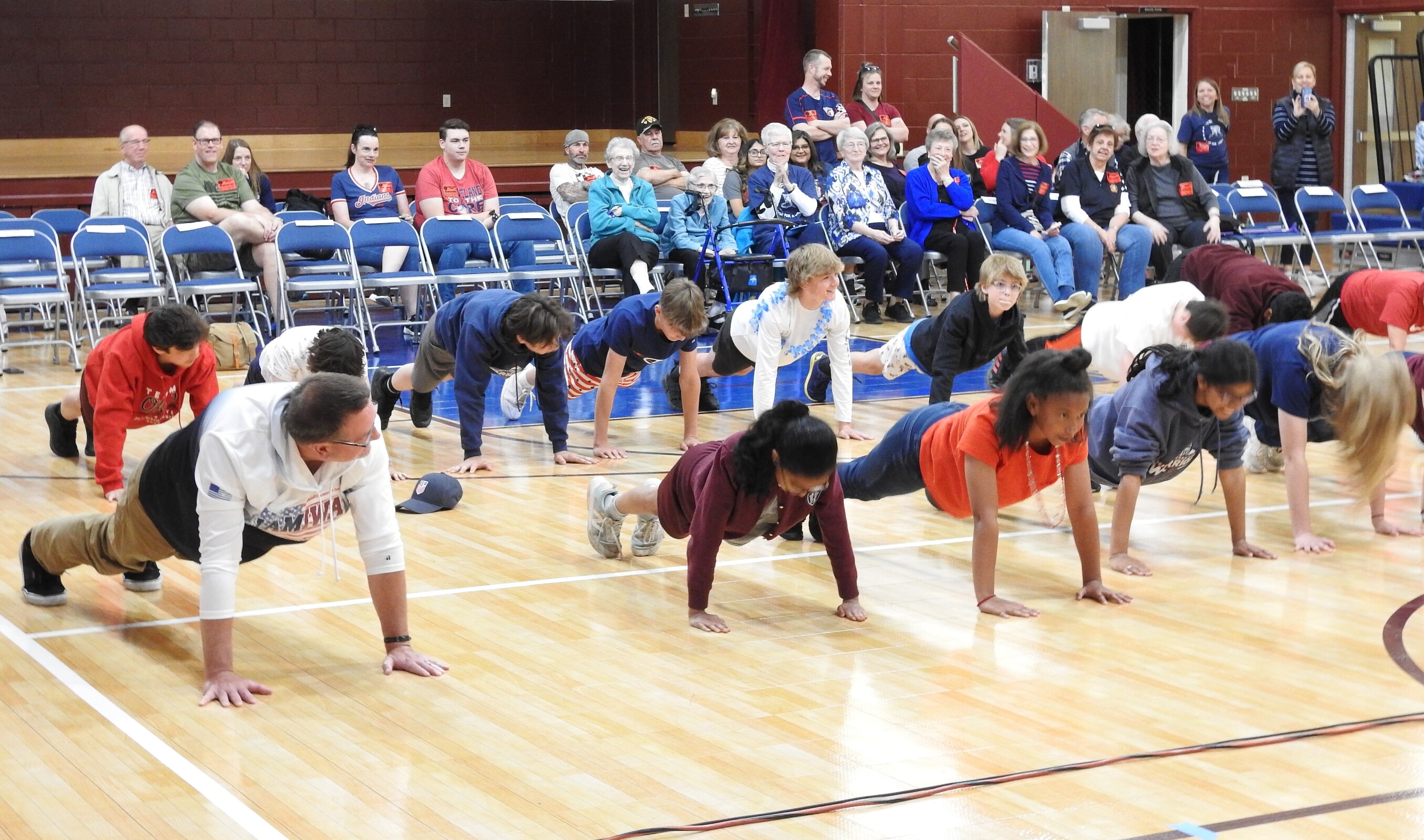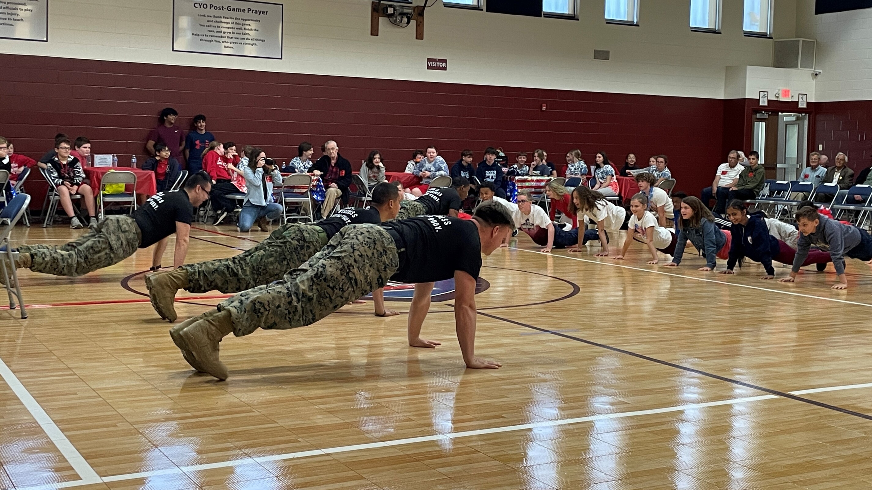 Then he promised they would do something more lighthearted. They discussed the symbolism of the Marine dress uniform colors and then he introduced some fellow Marines who demonstrated some of their physical fitness routines. Several students were chosen to participate in the demonstrations and there was a physical fitness competition that included the Marines, students and Mike Wisnor, IWA president. Winners received giveaways from the Marines.
