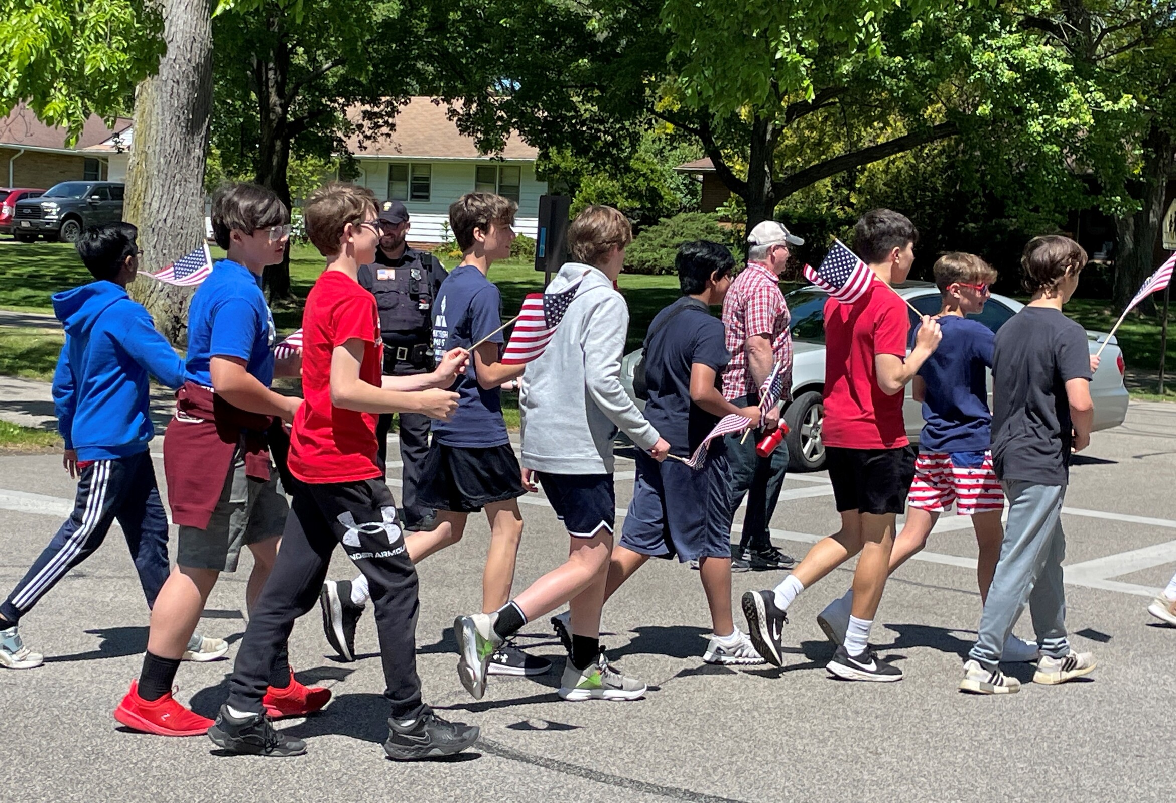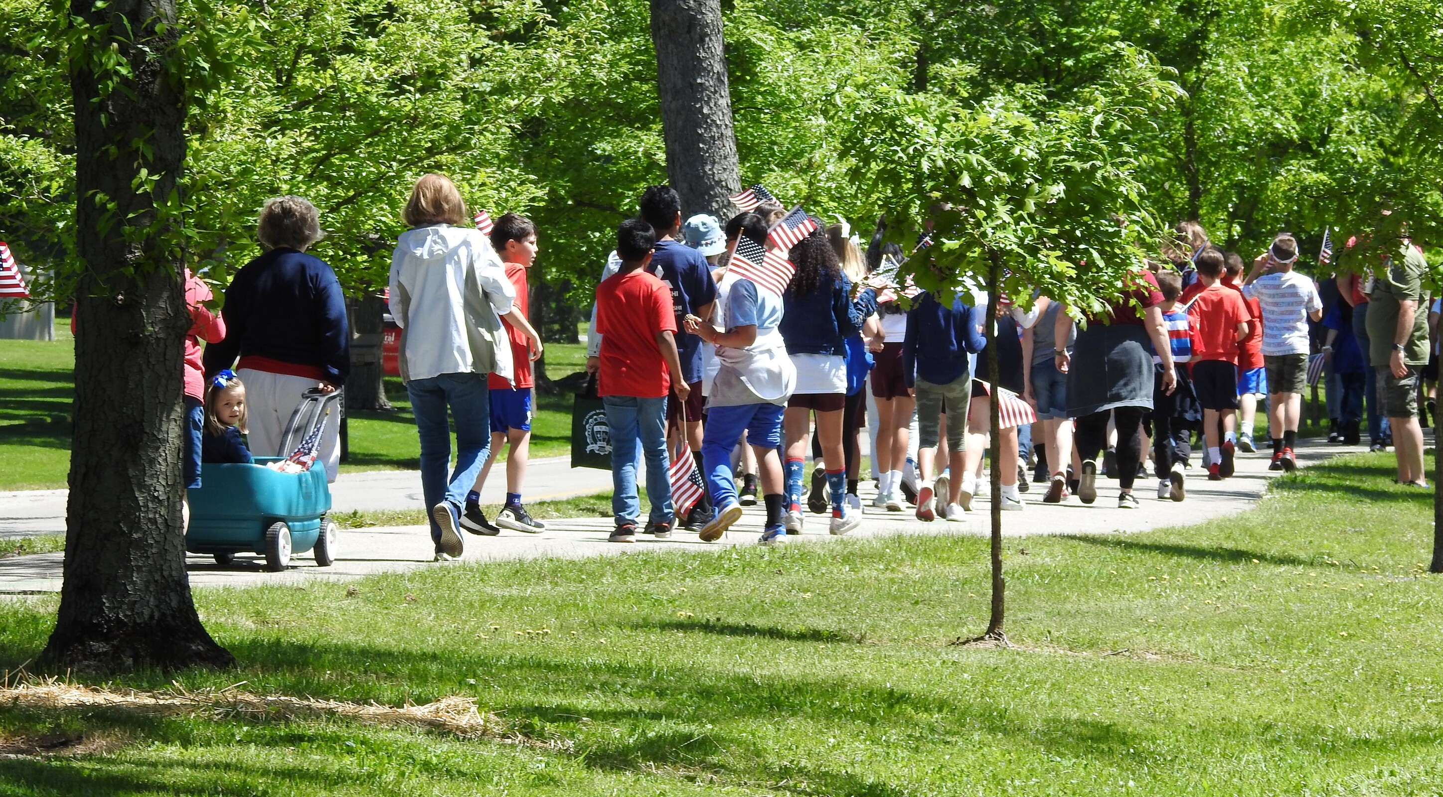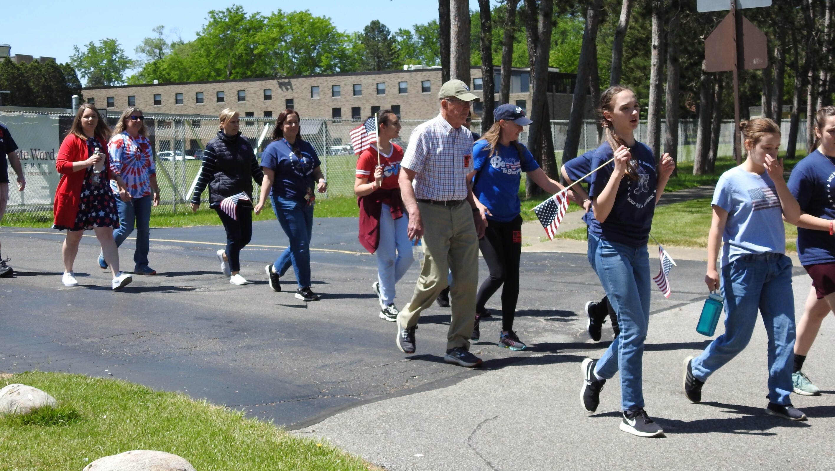 After lunch, they gathered in the parking lot and began a 5-mile walk through Parma Heights. The younger IWA students gathered along the driveway holding small American flags and cheered on the walkers as they began their hike along Big Creek Parkway. A Parma Heights police officer accompanied the group.
