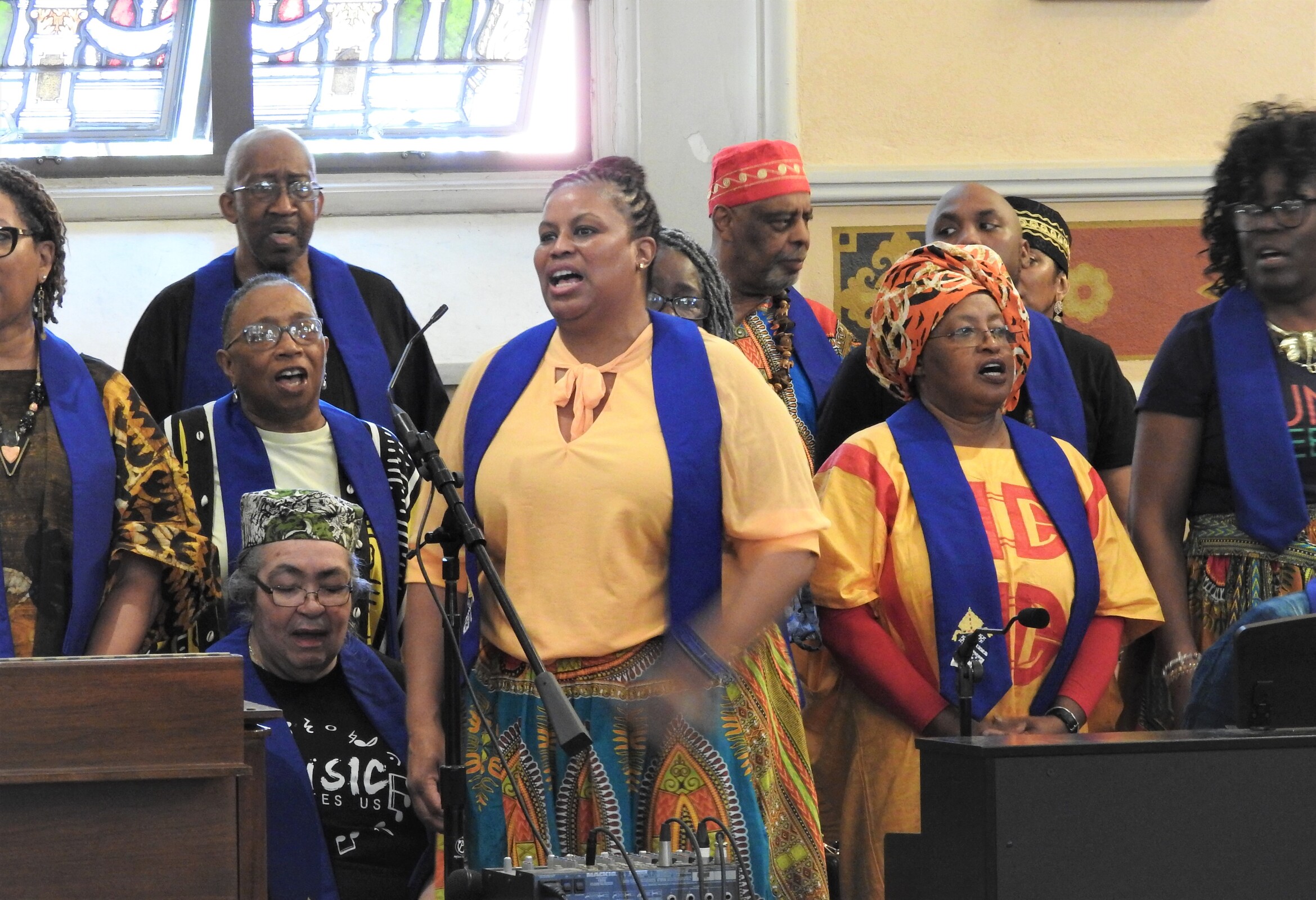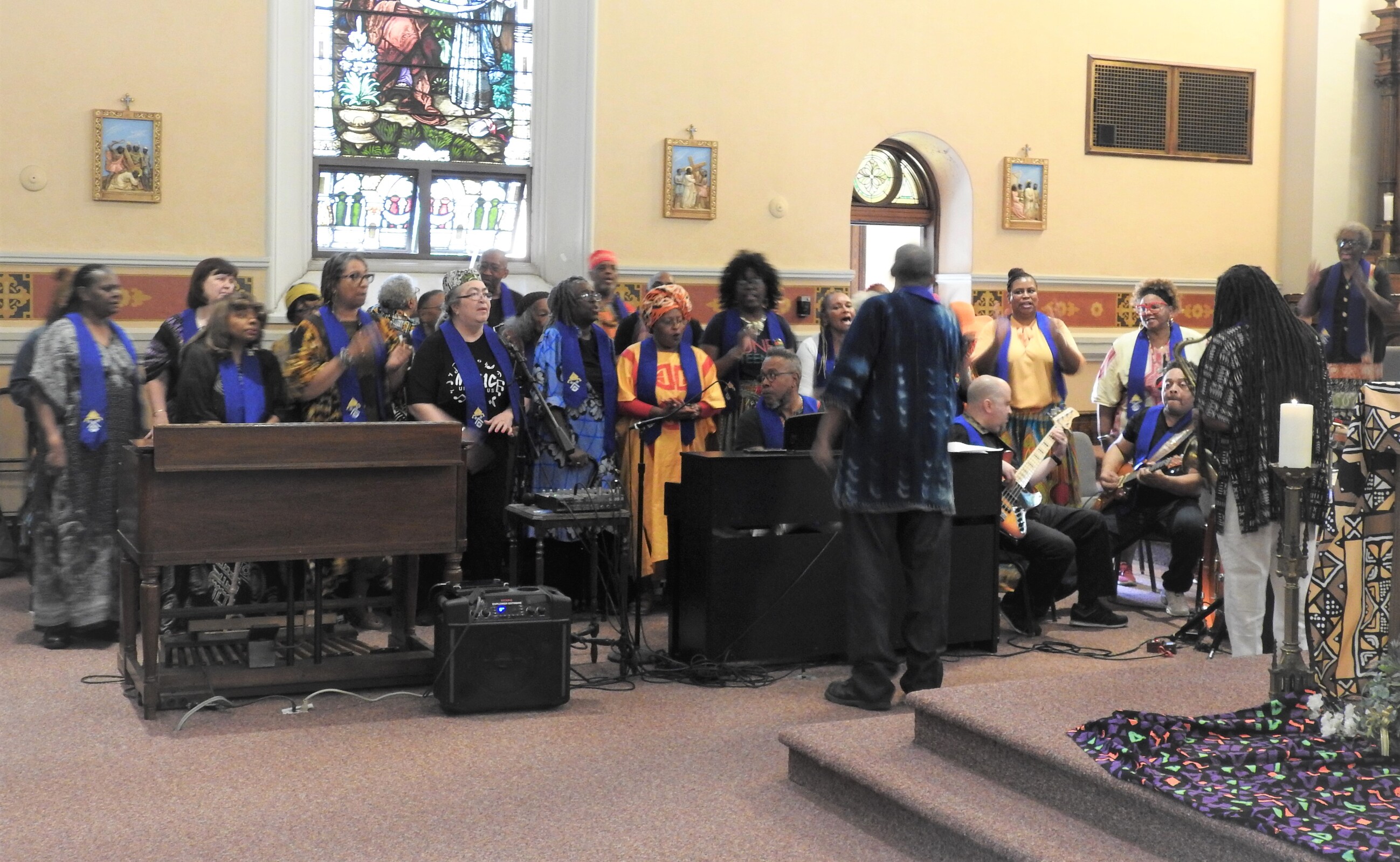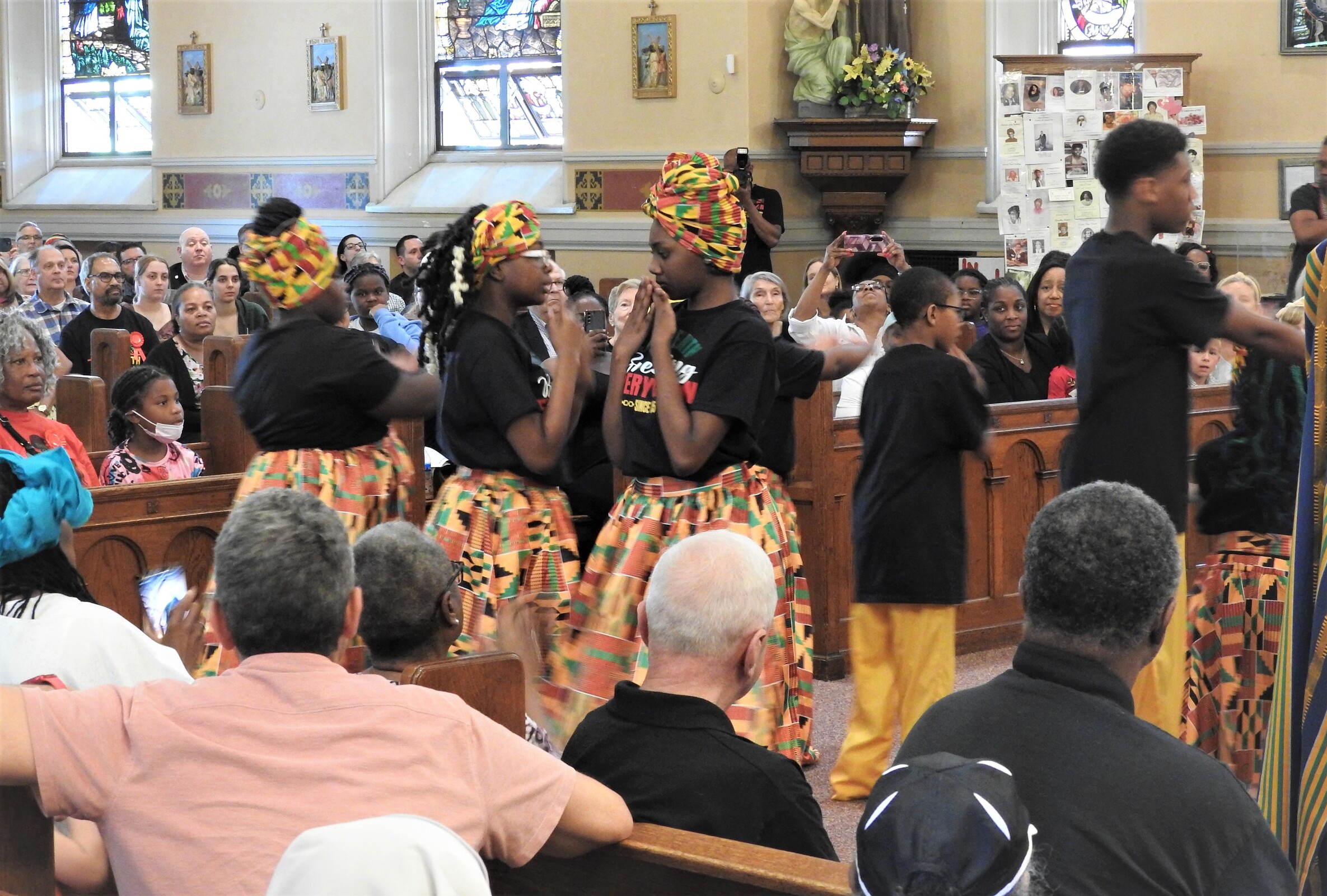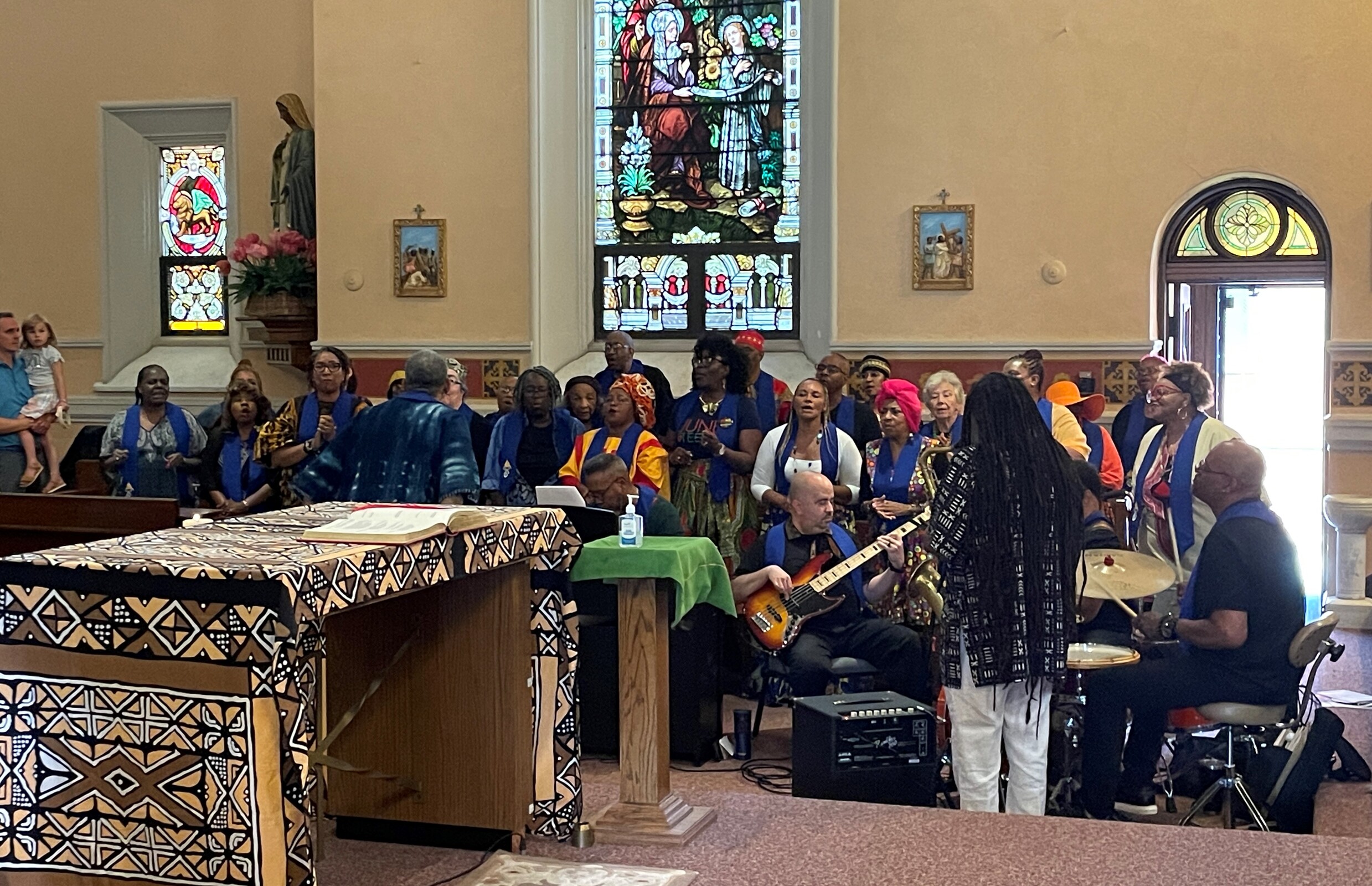 Faithful from across the area, many dressed in colorful clothing and others in special Juneteenth T-shirts, gathered in the church for Mass. The Diocesan Gospel Choir and musicians provided music and song for the liturgy.