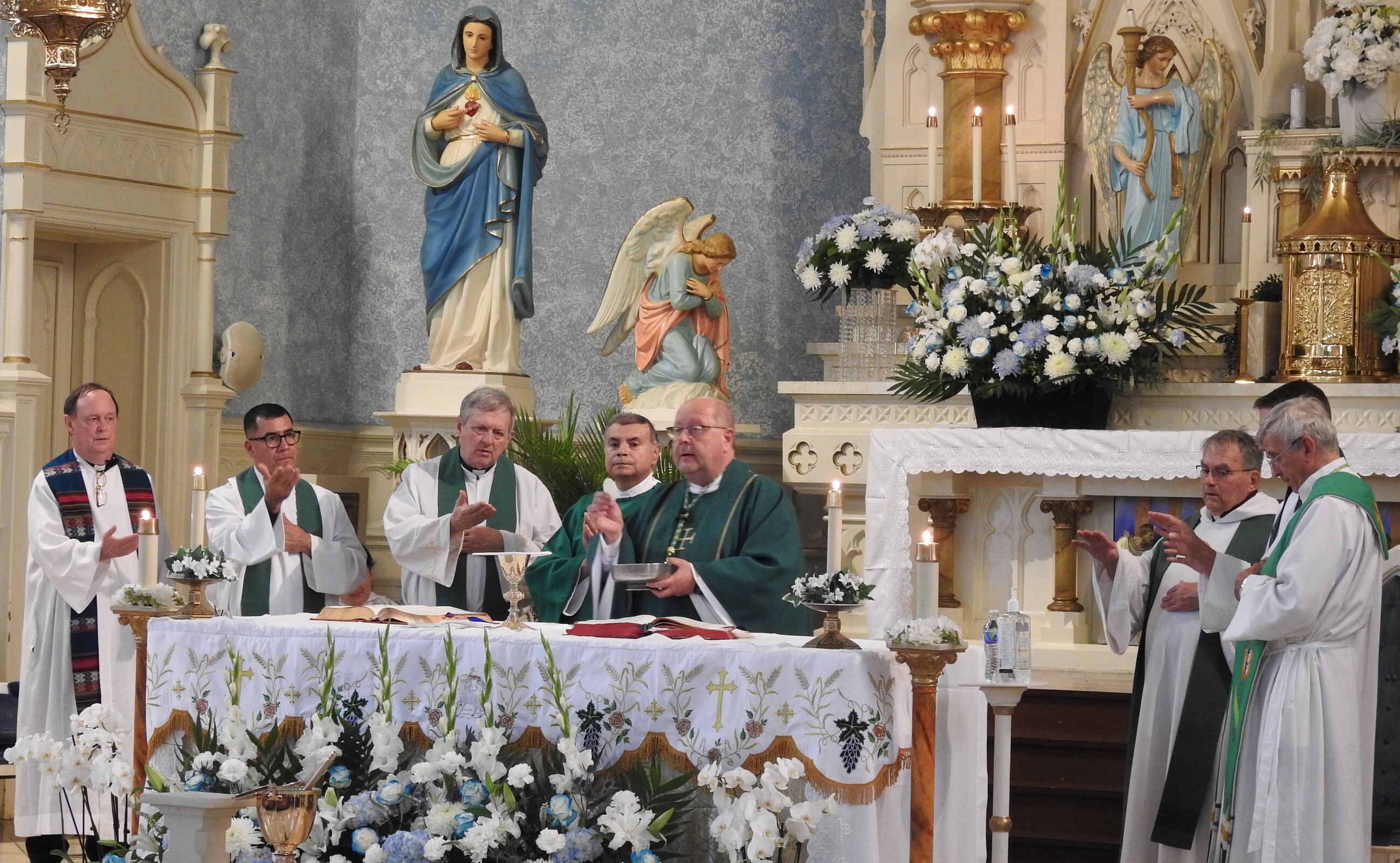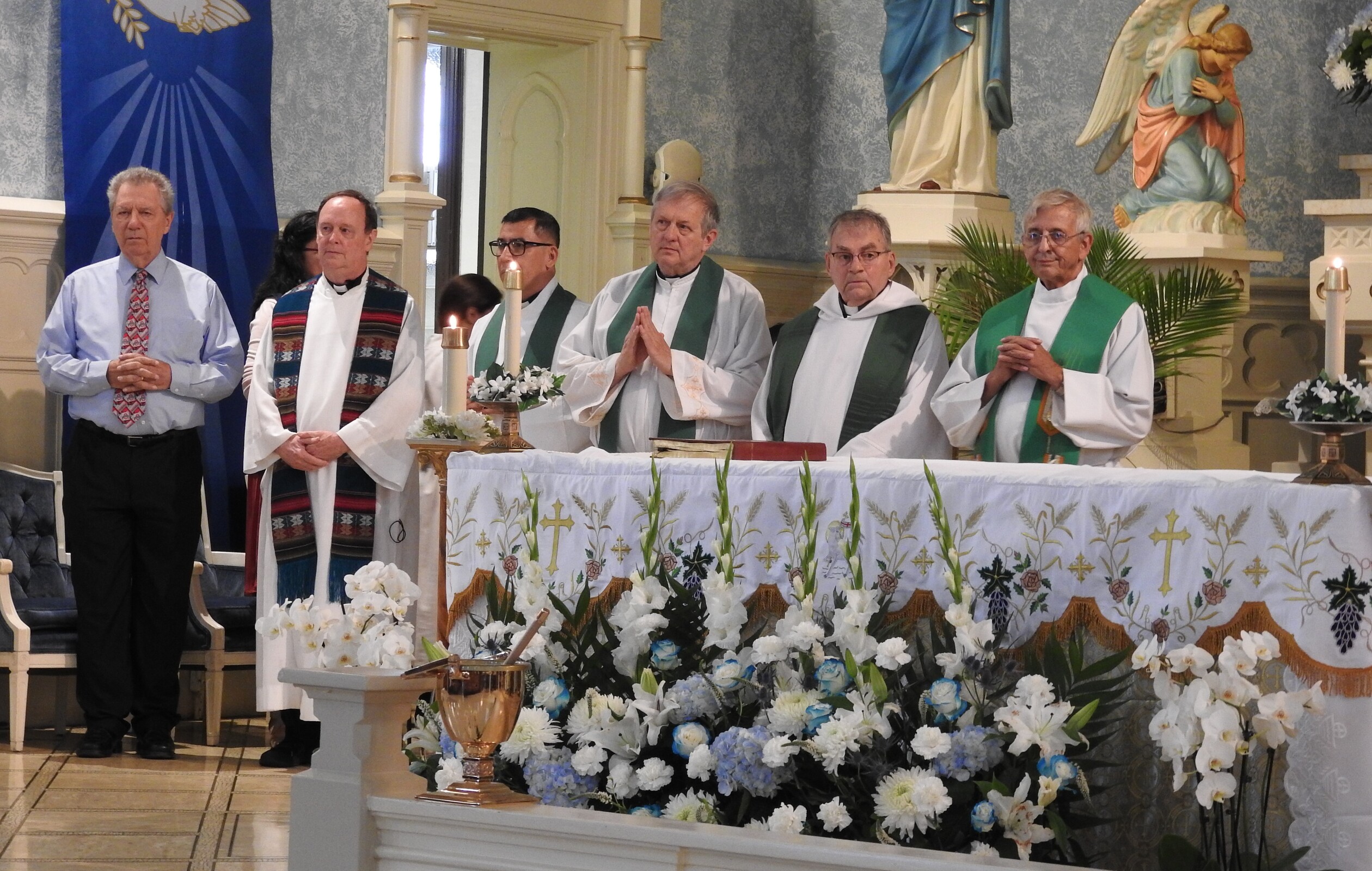 Bishop Edward Malesic celebrated the bilingual anniversary Mass. There were five concelebrants: Father Joe Callahan, OLL pastor; Msgr. Richard Antall, pastor of nearby Holy Name Parish; Father Robert Jasany, pastor of nearby St. John Nepomucene Parish; Father Tom Mahoney, a senior priest-retired who once served as parish administrator, and Father Hernandez Argueta, a priest from El Salvador who served with Father Callahan at the diocesan mission in El Salvador. Father Argueta traveled to Cleveland for the celebration.