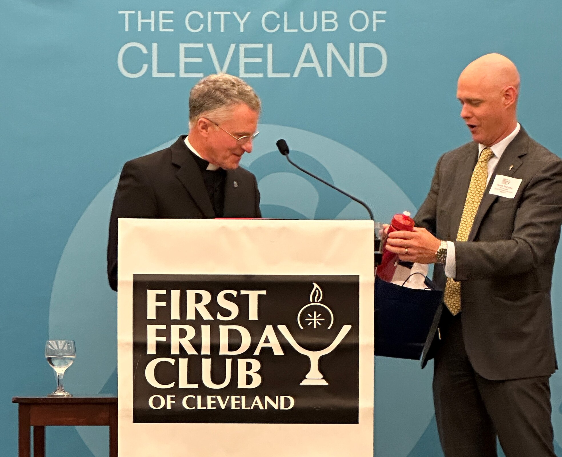 Patrick McCarthy, First Friday Club president, presented the archbishop with a reminder of home – a Cleveland Guardians baseball cap and a water bottle donated by Catholic Charities, Diocese of Cleveland.