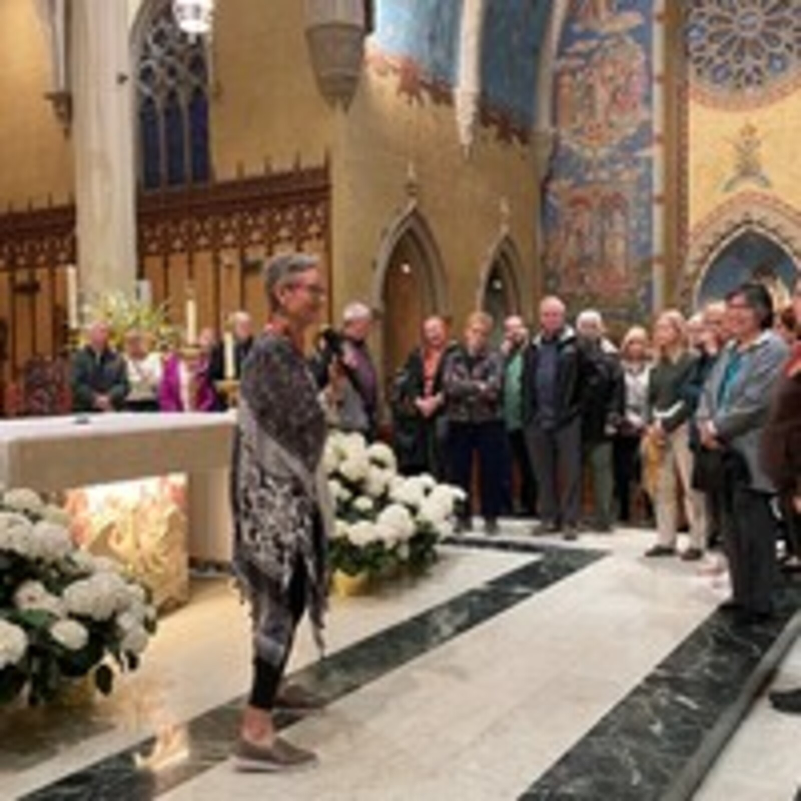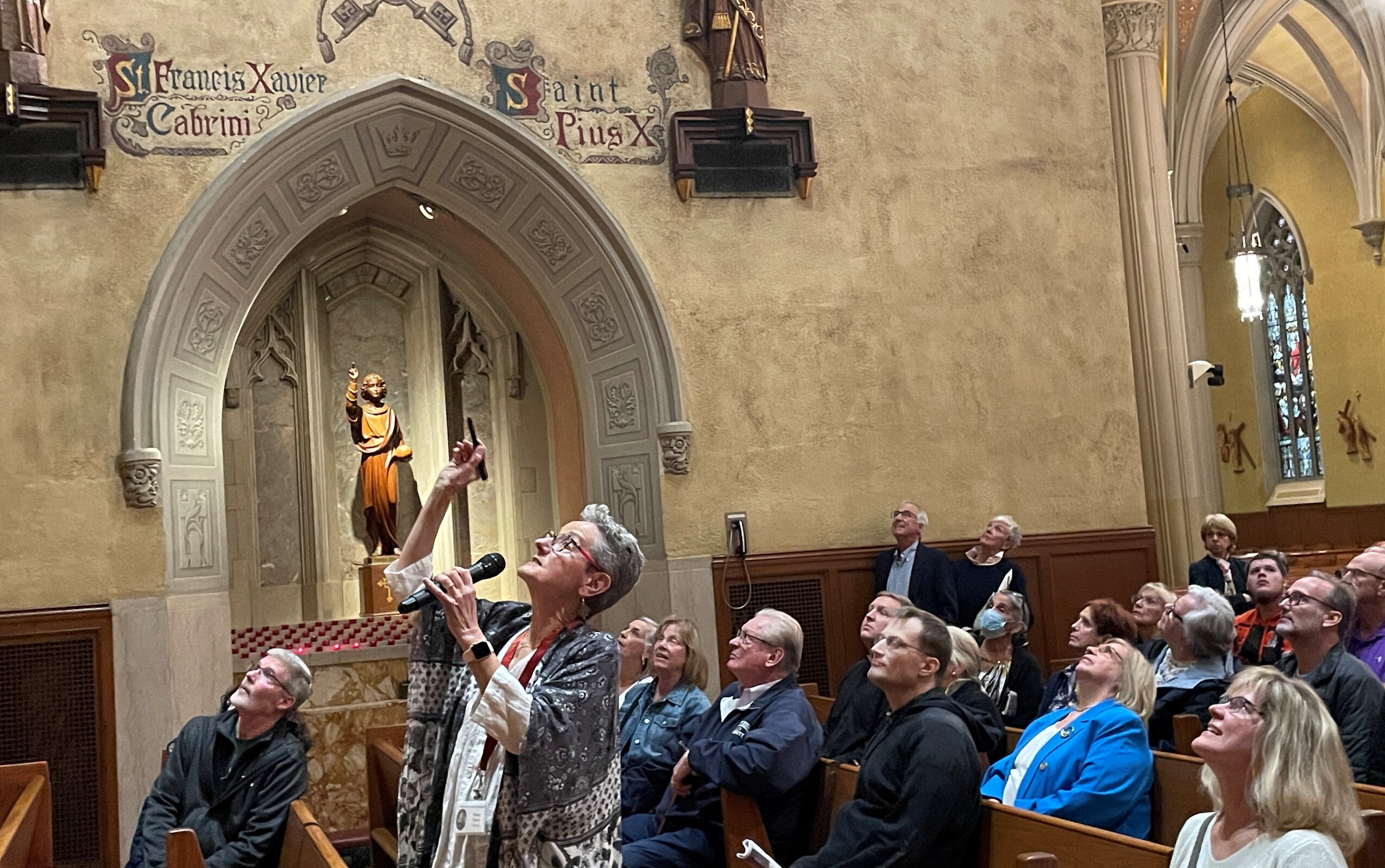 Diane Fusco, a longtime cathedral parishioner and docent, guided the visitors through the church and pointed out many interesting things as she briefed them on their history and significance. The cathedral is the bishop’s church, which is evident because the cathedra, or special seat used by the bishop, is located there.