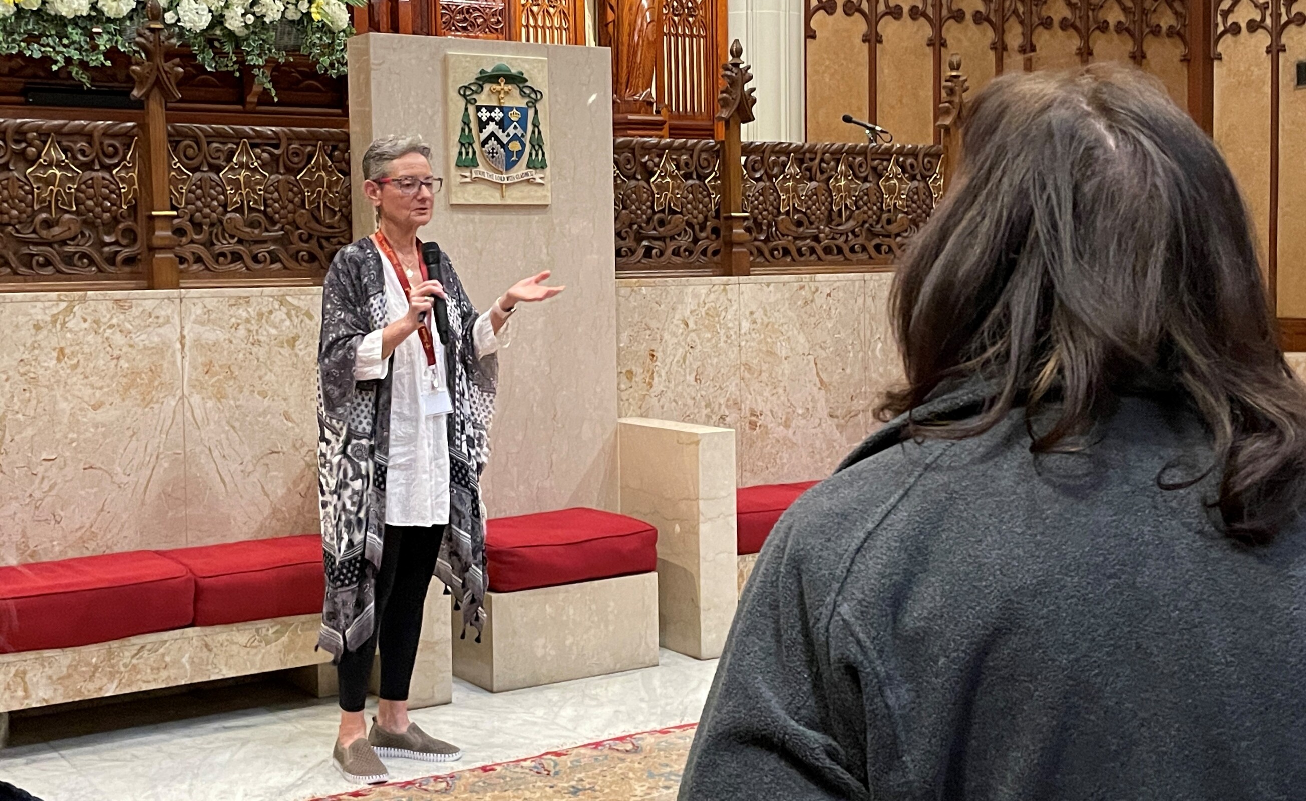Fusco took the group into the sanctuary and showed them the cathedra with seating for priests on both sides. She also pointed out Bishop Edward Malesic’s coat of arms that is affixed to the cathedra.