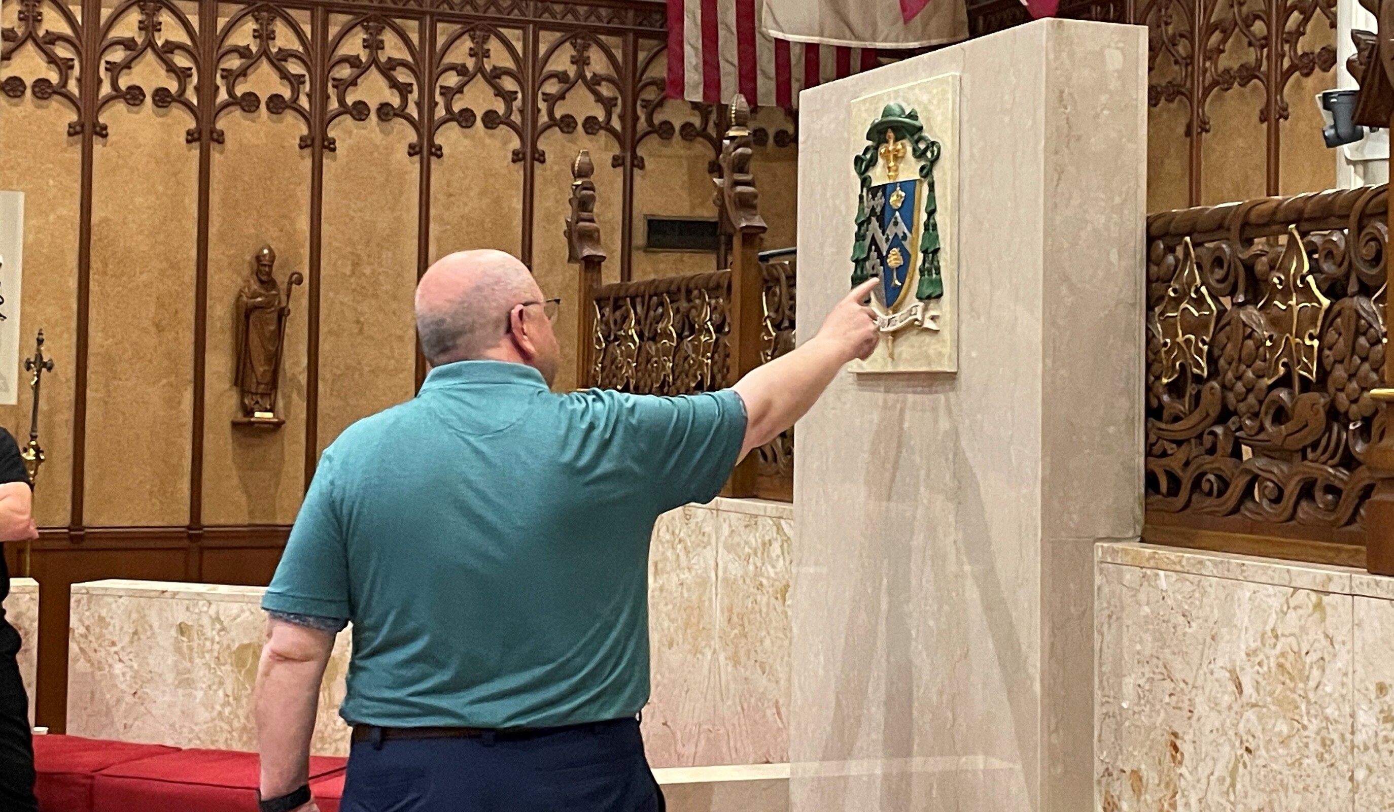 He took the students into the cathedral sanctuary and showed them the cathedra, the bishop’s chair, and explained his motto and coat of arms.