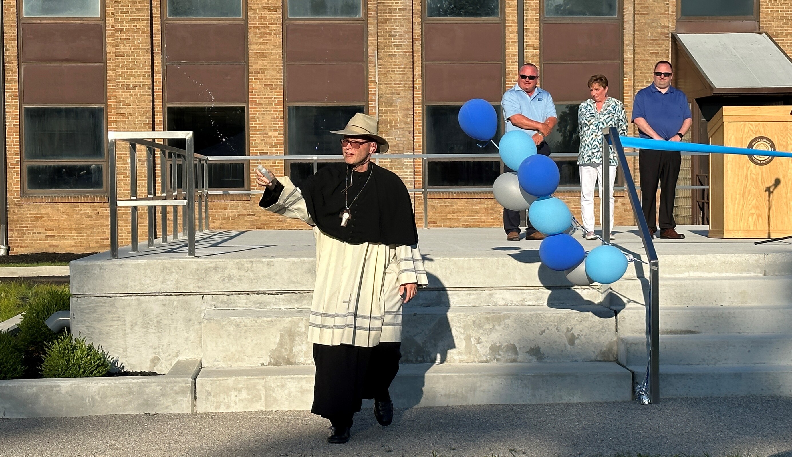 Abbot Gary Hoover, a 1974 BHS alumnus, blessed the Rufus Courtyard and sprinkled it with holy water before gathering with members of the Rufus family in prayer before they cut the ribbon on the new green space that connects the high school with the new atrium and St. Andrew Abbey.