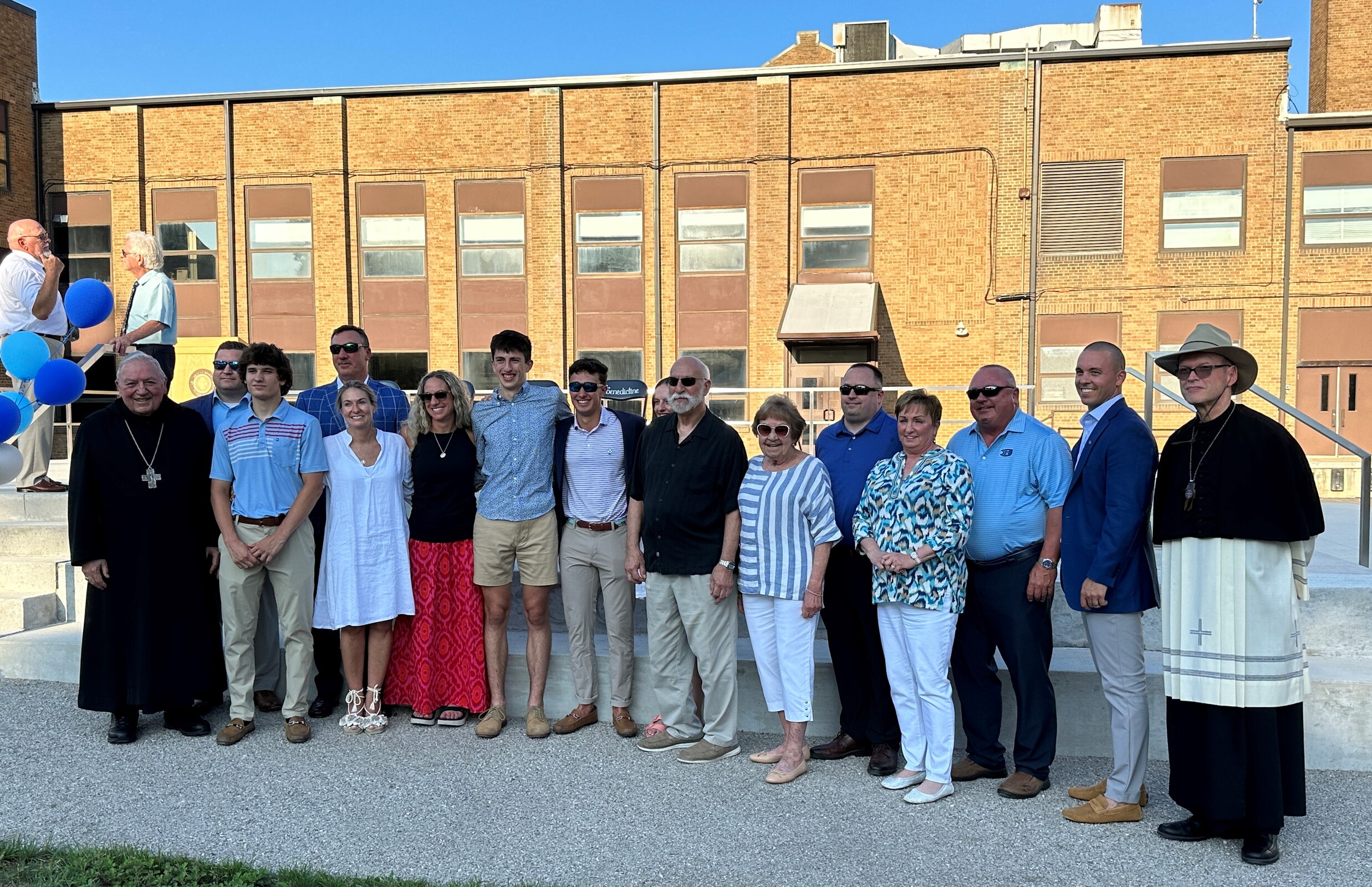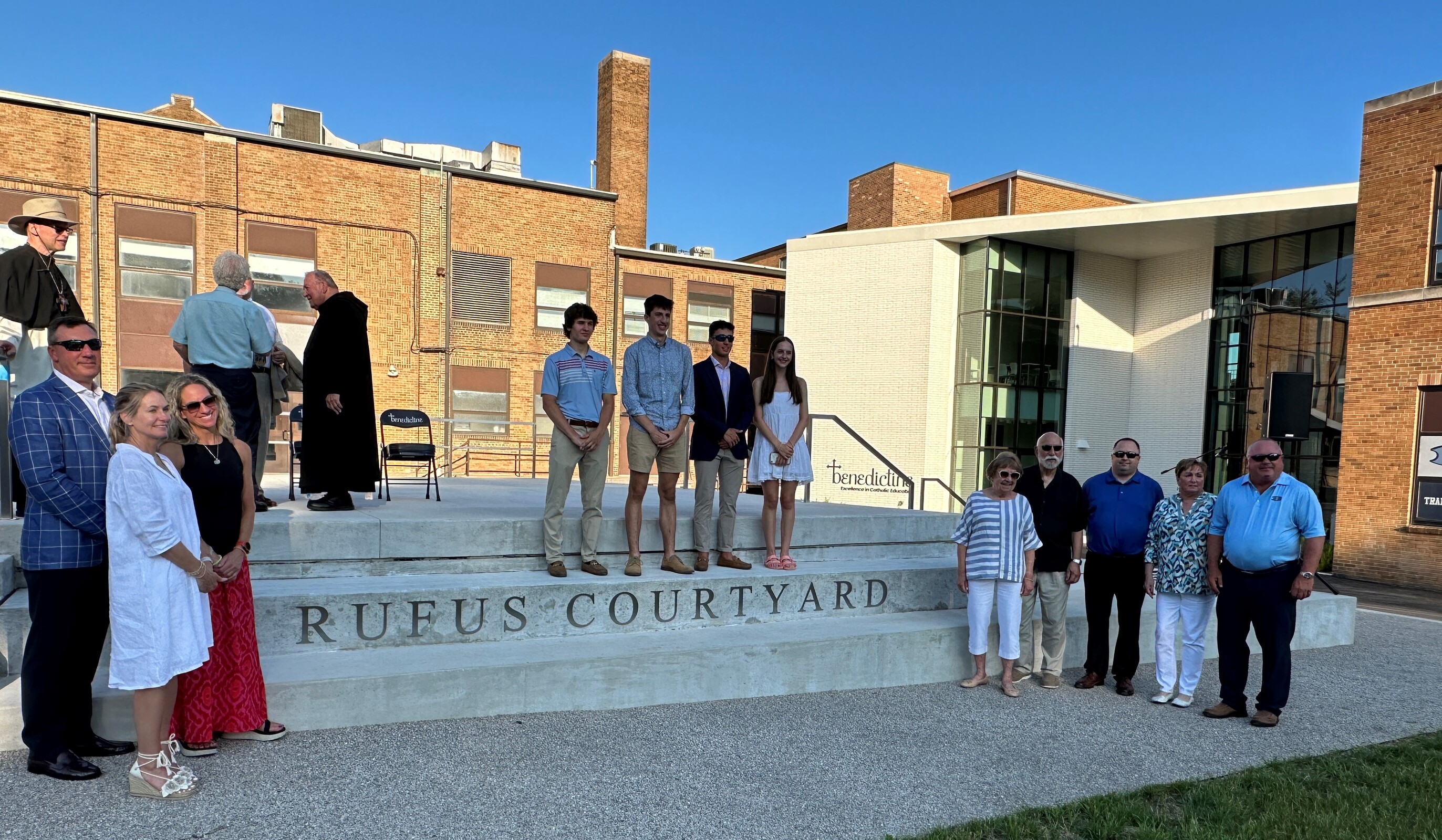 The Benedictine High School community gathered on July 27 for a special ceremony to bless and cut the ribbon for the new, recently completed Rufus Courtyard. The courtyard honors the late Joe Rufus, a longtime coach, athletic director and teacher at the school.