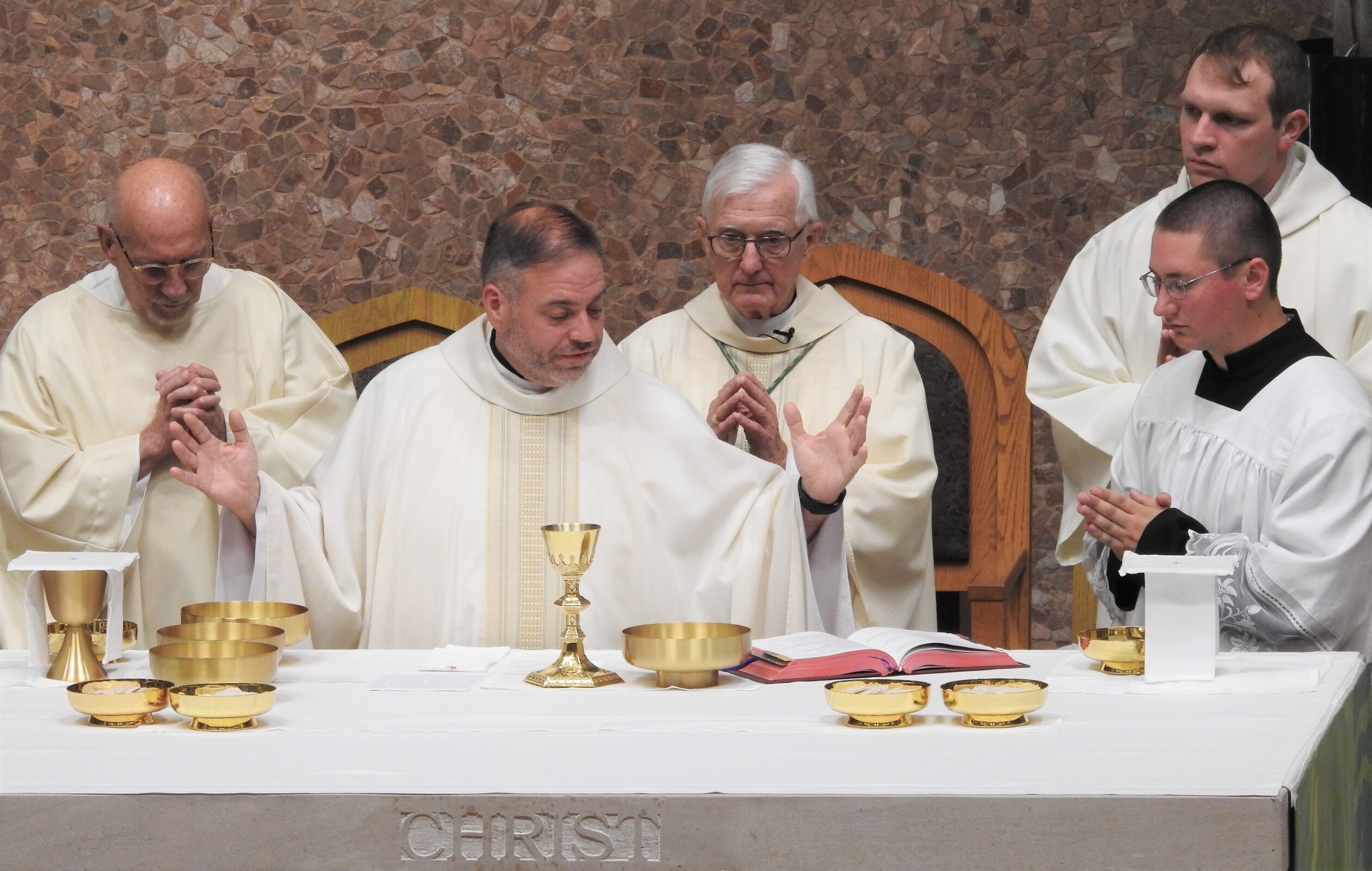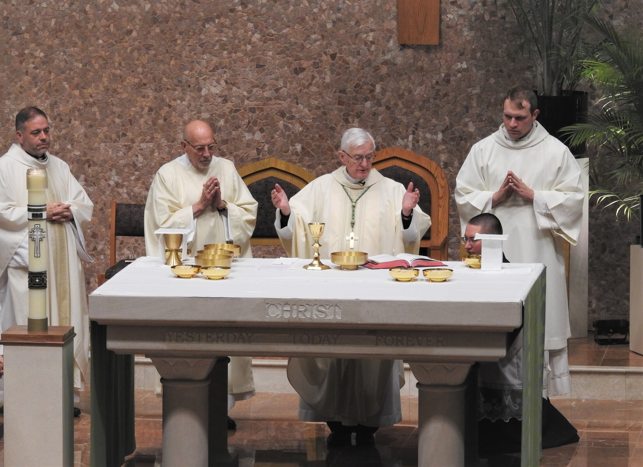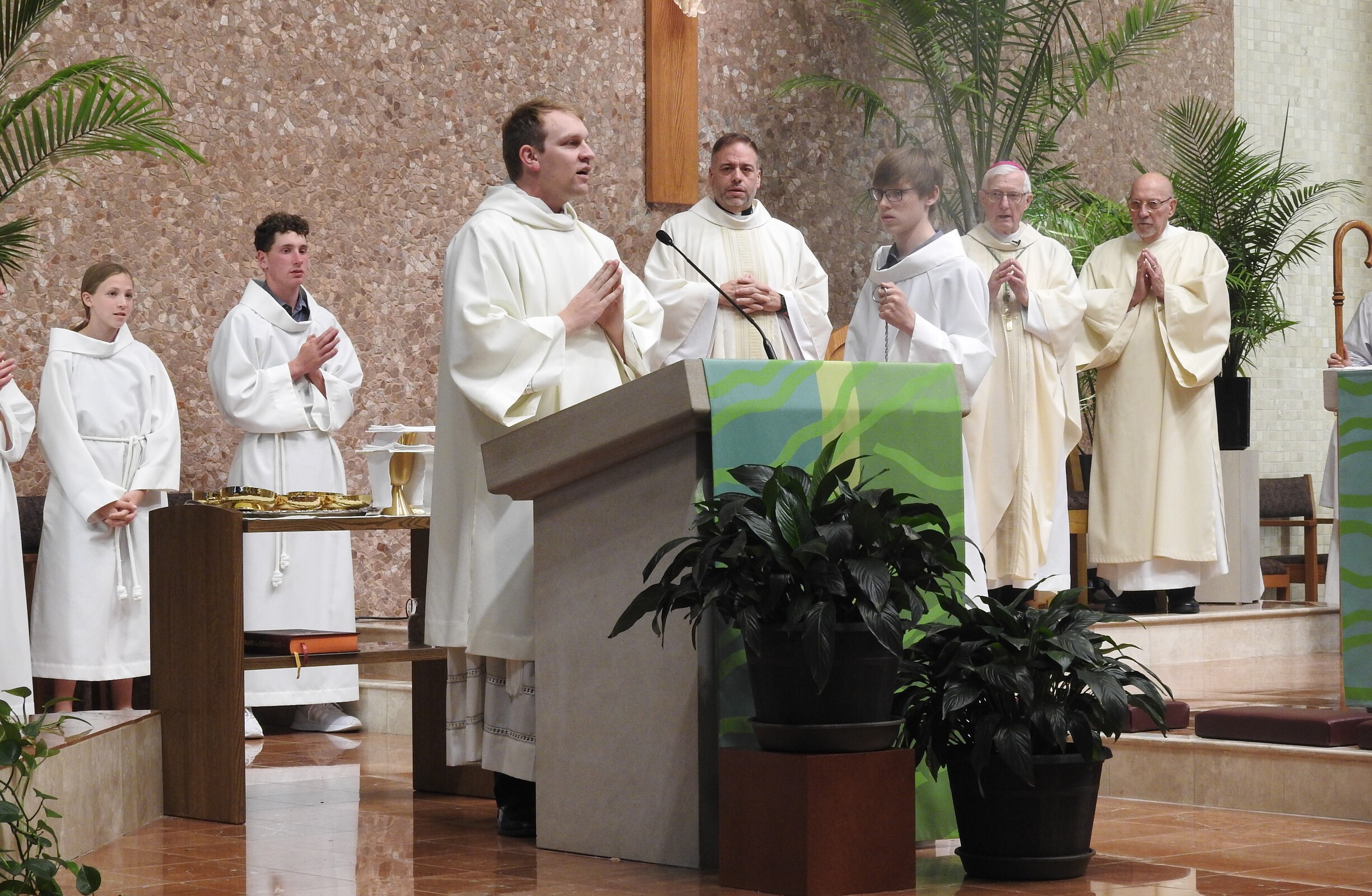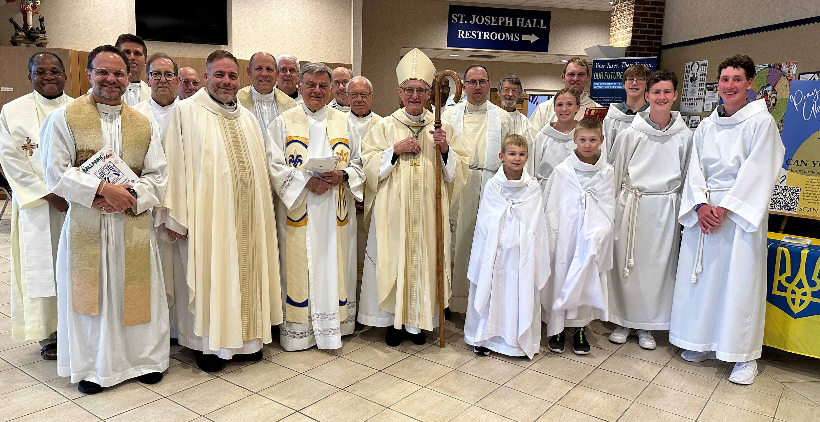 Bishop Martin Amos, retired bishop of Davenport, Iowa and a son of the diocese, was the celebrant. Homilist was Father Vince Hawk, pastor of Holy Trinity and St. Mary of the Immaculate Conception parishes in Avon. About a dozen priests from nearby parishes concelebrated the liturgy.