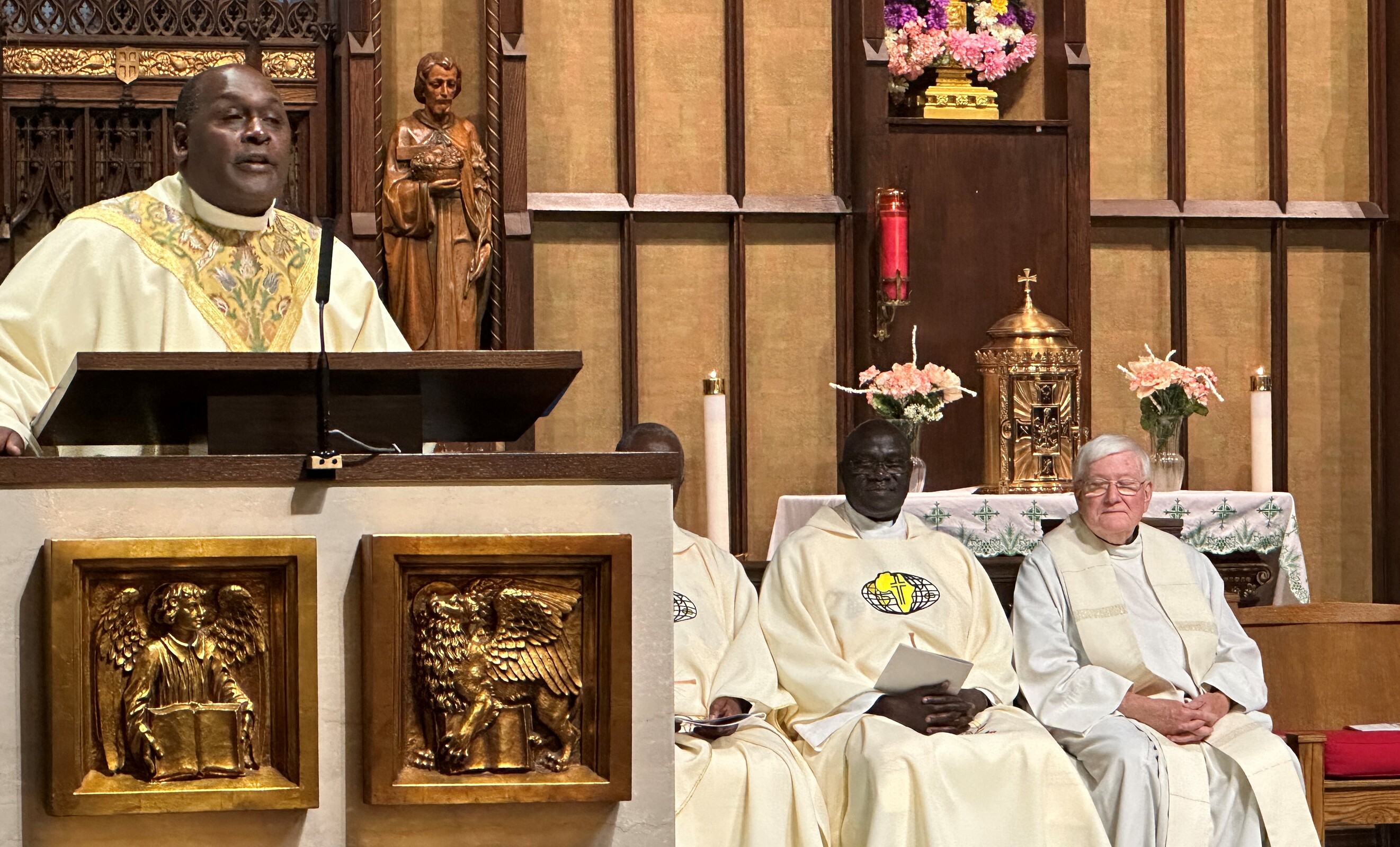 “This is the day the Lord has made. Let us rejoice and be glad in it,” Father Byarugaba said as he began his homily. He credited three groups of people for their help in his ministry: his parents, his superiors in the Apostles of Jesus and the bishop for making his appointment. Unfortunately, Father Byarugaba’s mother was in poor health and was unable to travel and attend the installation Mass. Father Jonathan Zingales, pastor emeritus, also was unable to attend.