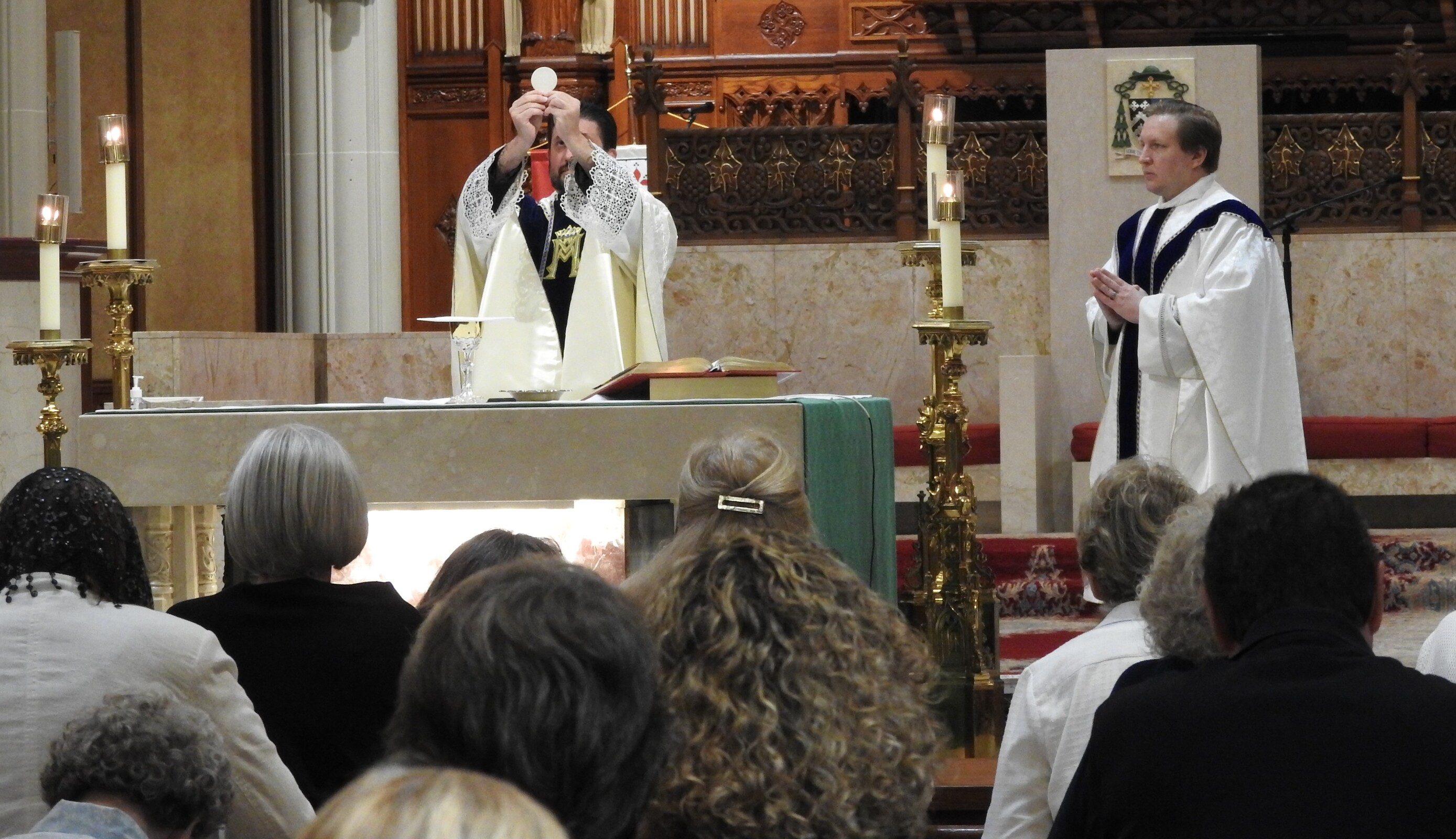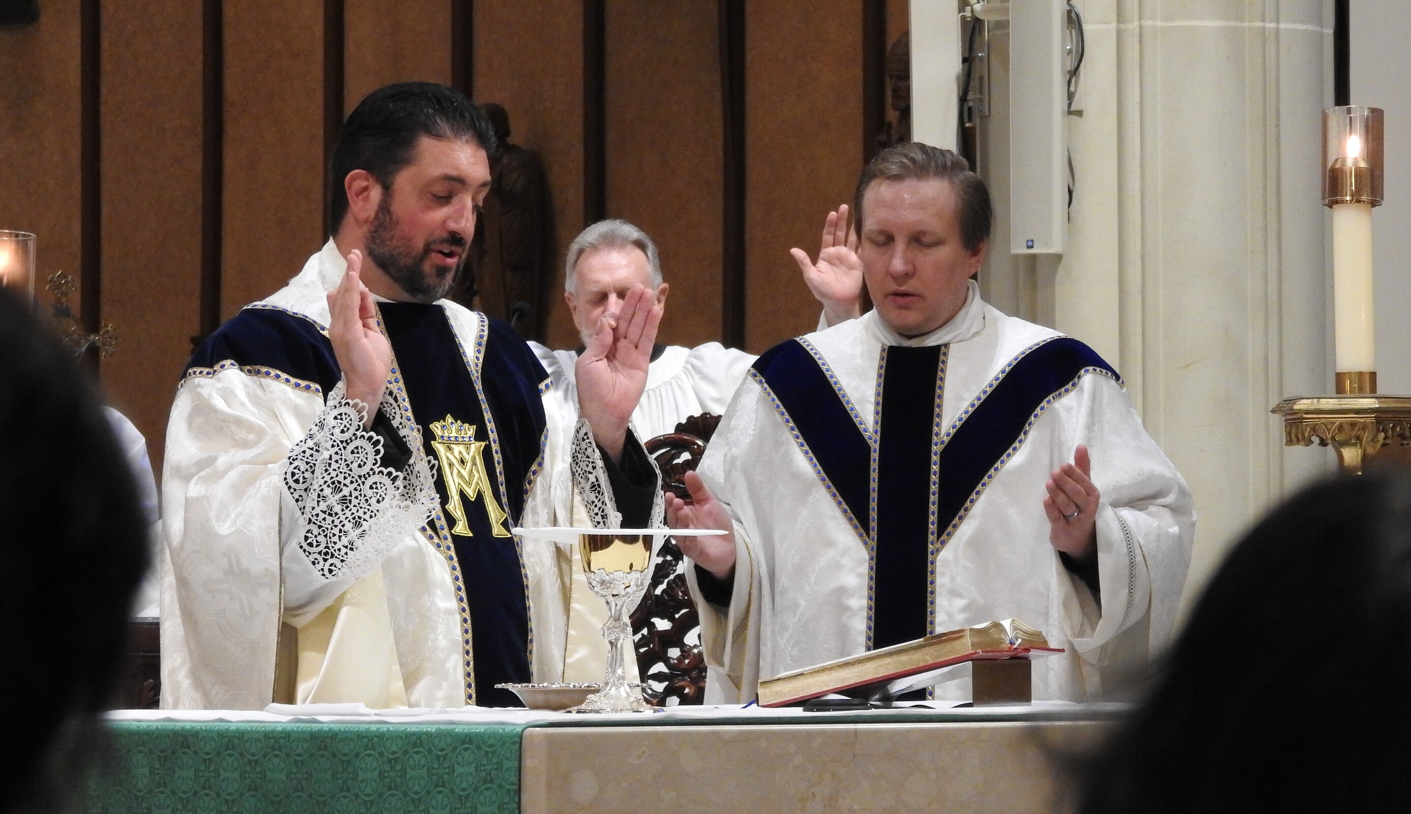 After returning to the cathedral, the Eucharist – in the monstrance – was returned to the altar and Father Estabrook led the congregation in the opening prayers and the rosary (joyful mysteries), followed by the collective consecration to Mary. The event concluded with benediction, the Eucharistic blessing, Divine Praises, concluding prayers and hymns.
