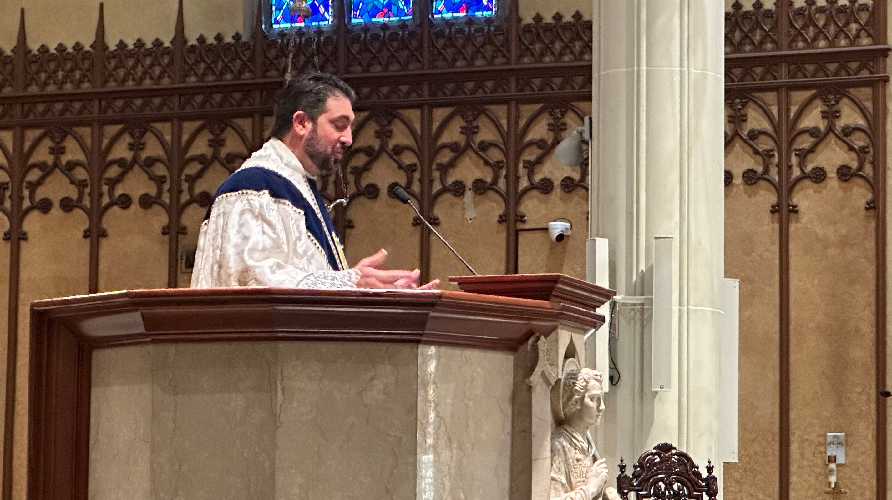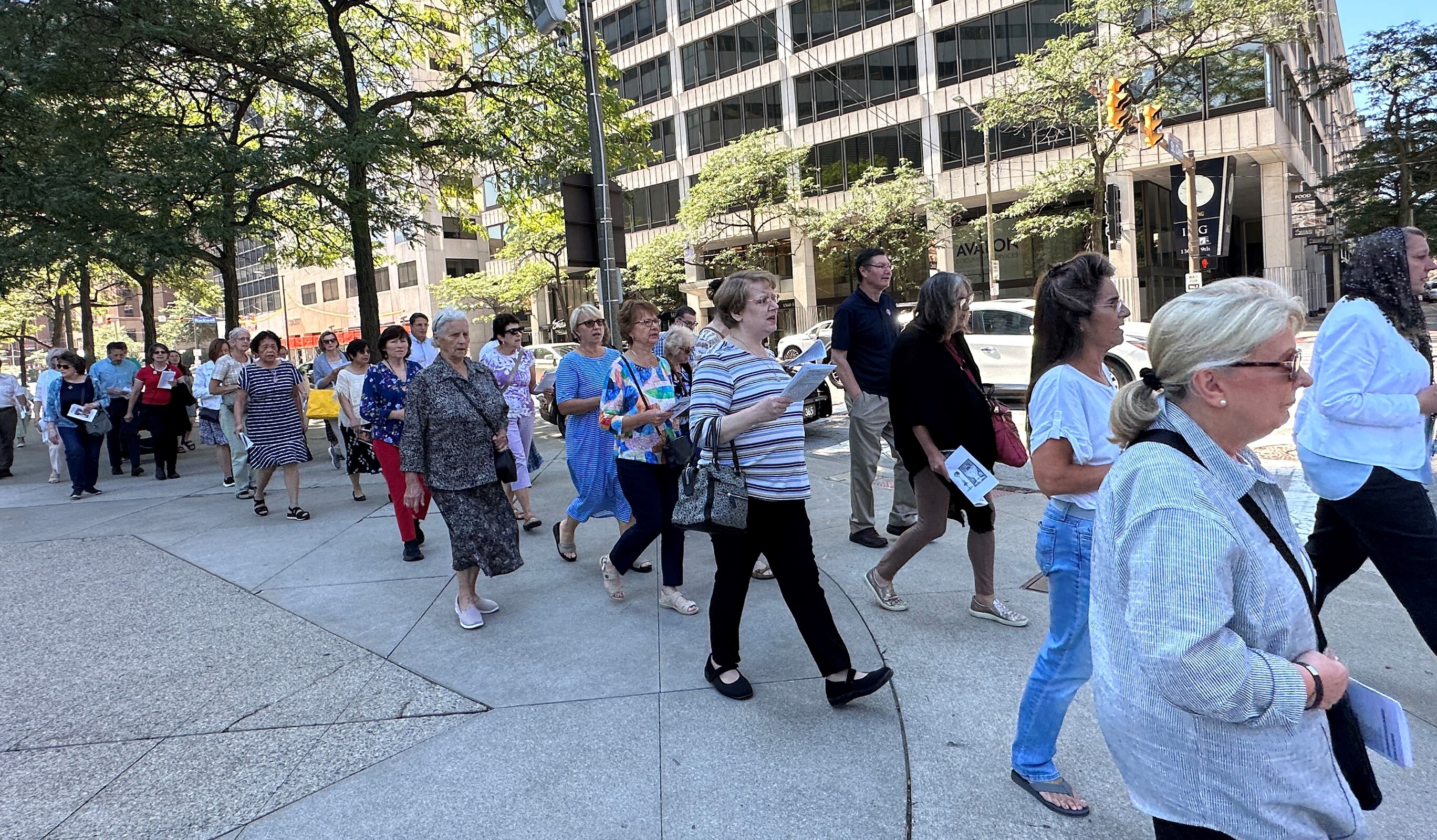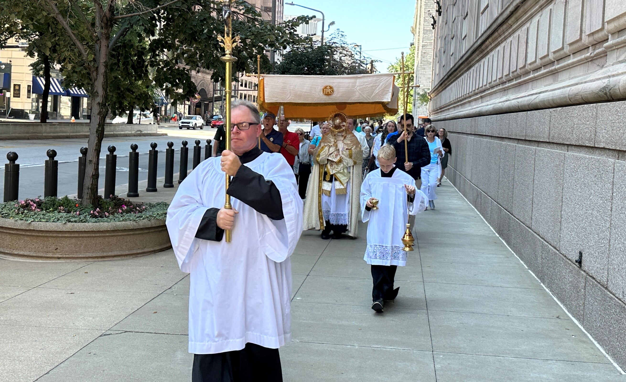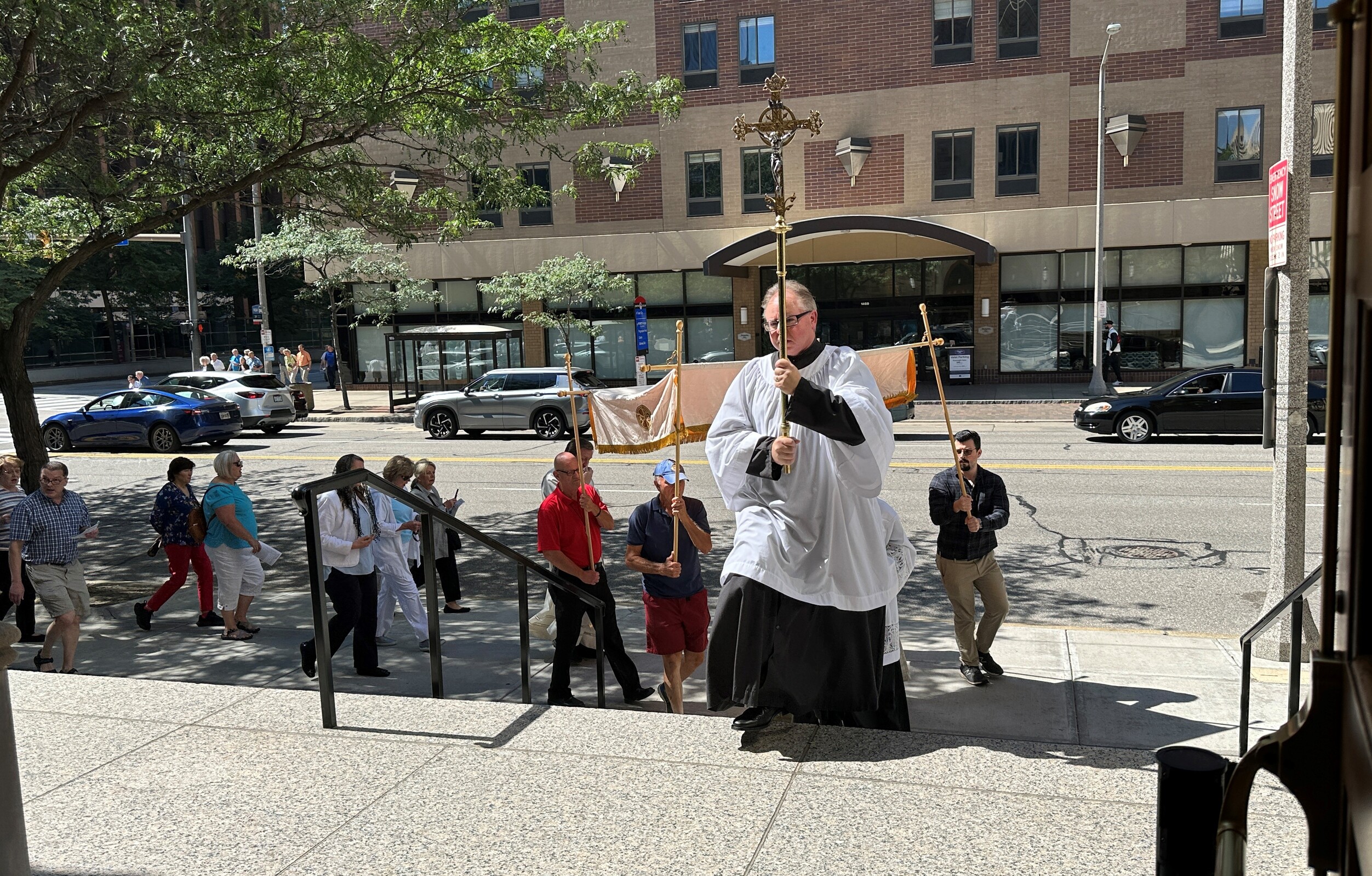 After Mass, the faithful followed Father Estabrook, who was carrying the Blessed Sacrament in a monstrance, Father Petkosek and the servers from the cathedral onto East Ninth Street, Lakeside Avenue, East Sixth Street, Superior Avenue and East Ninth back to the cathedral. Throughout the procession, the group prayed and sang.