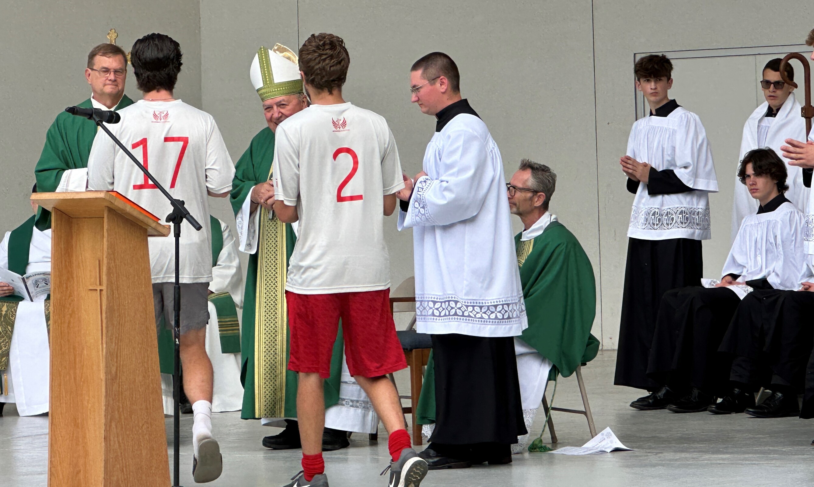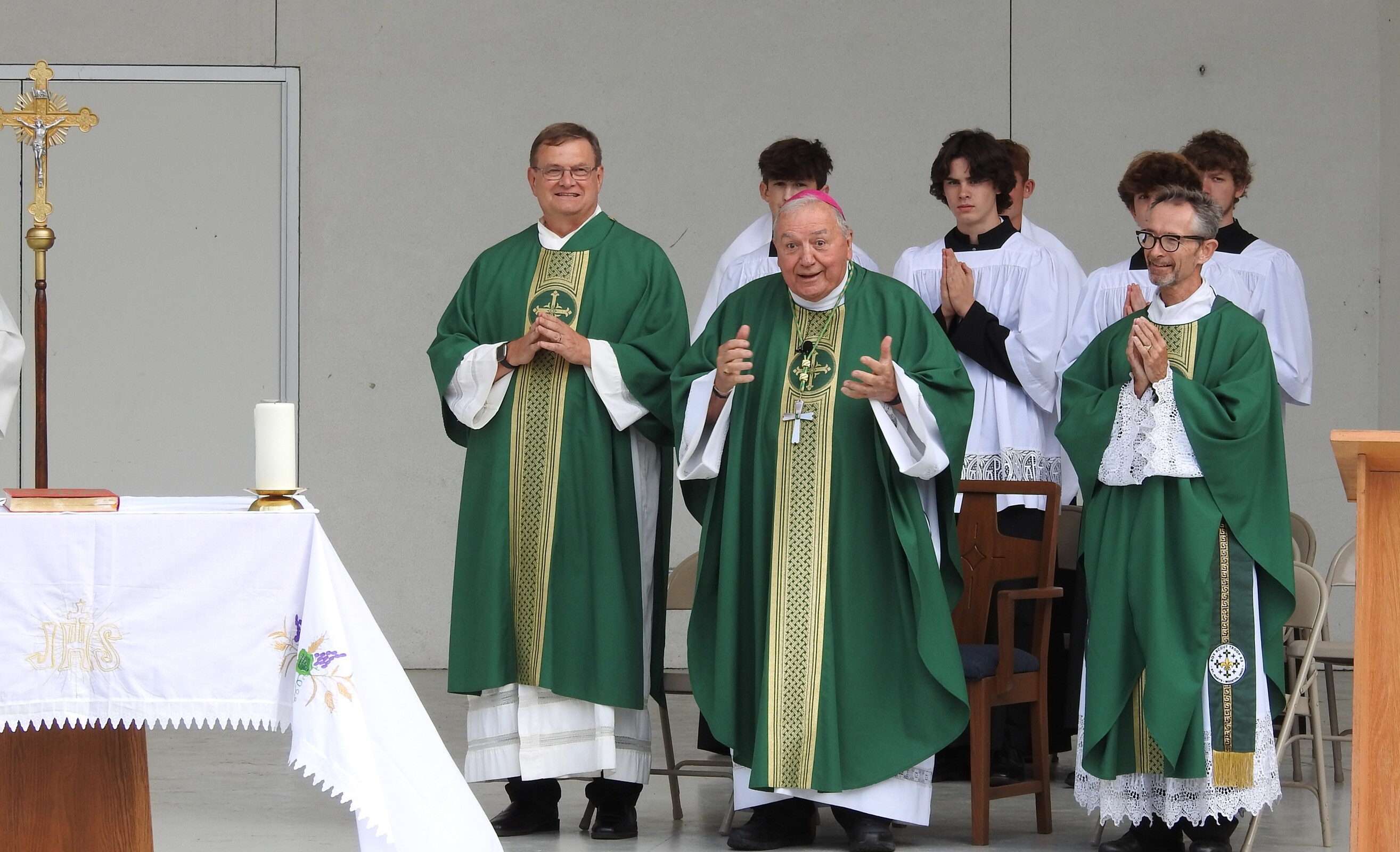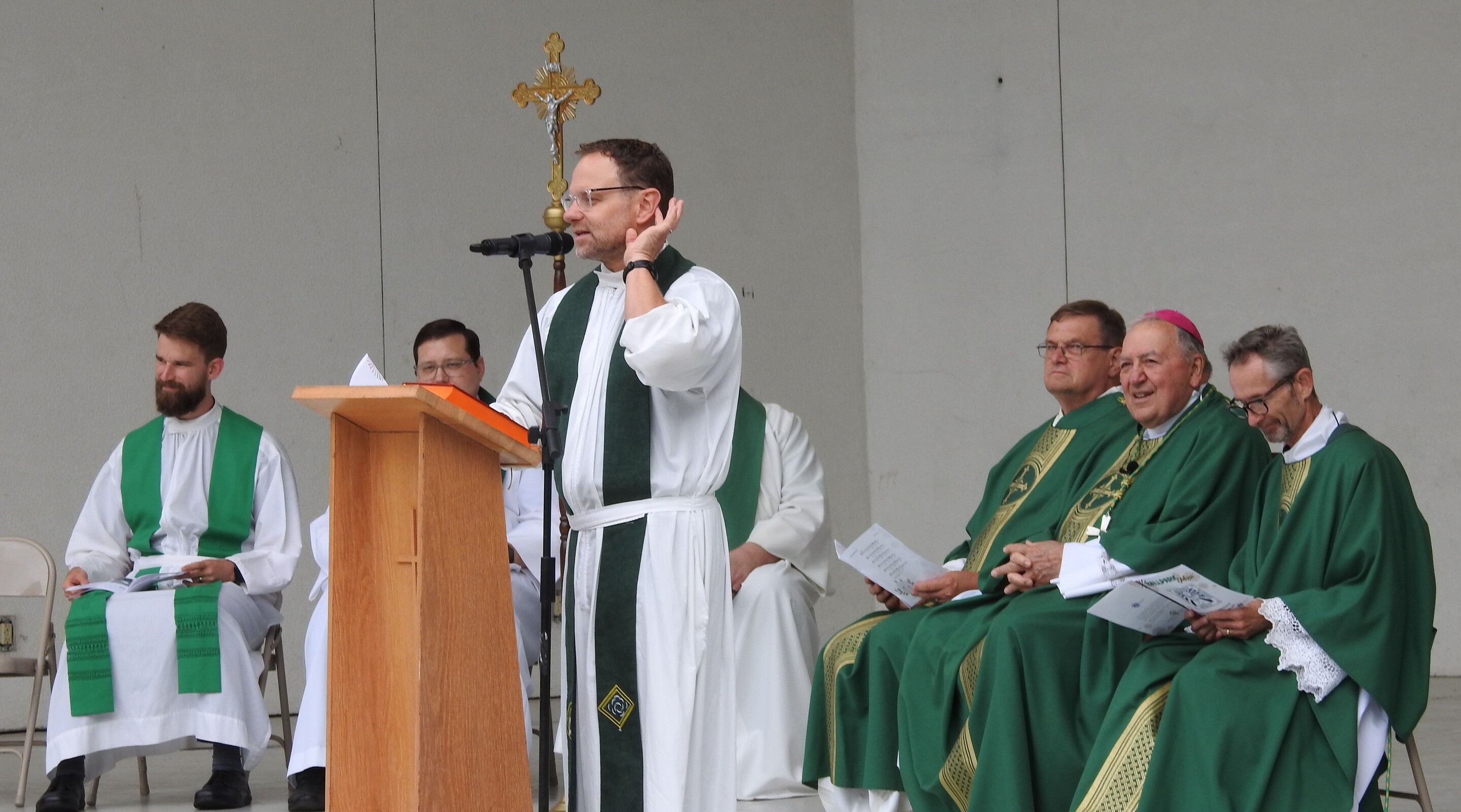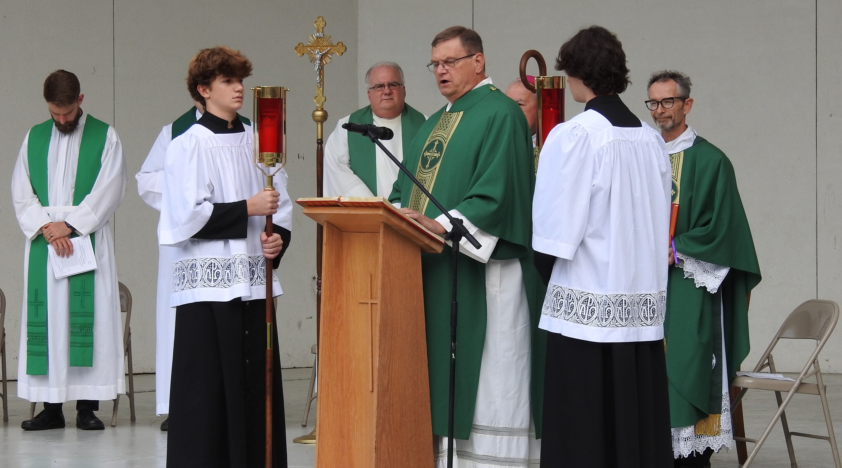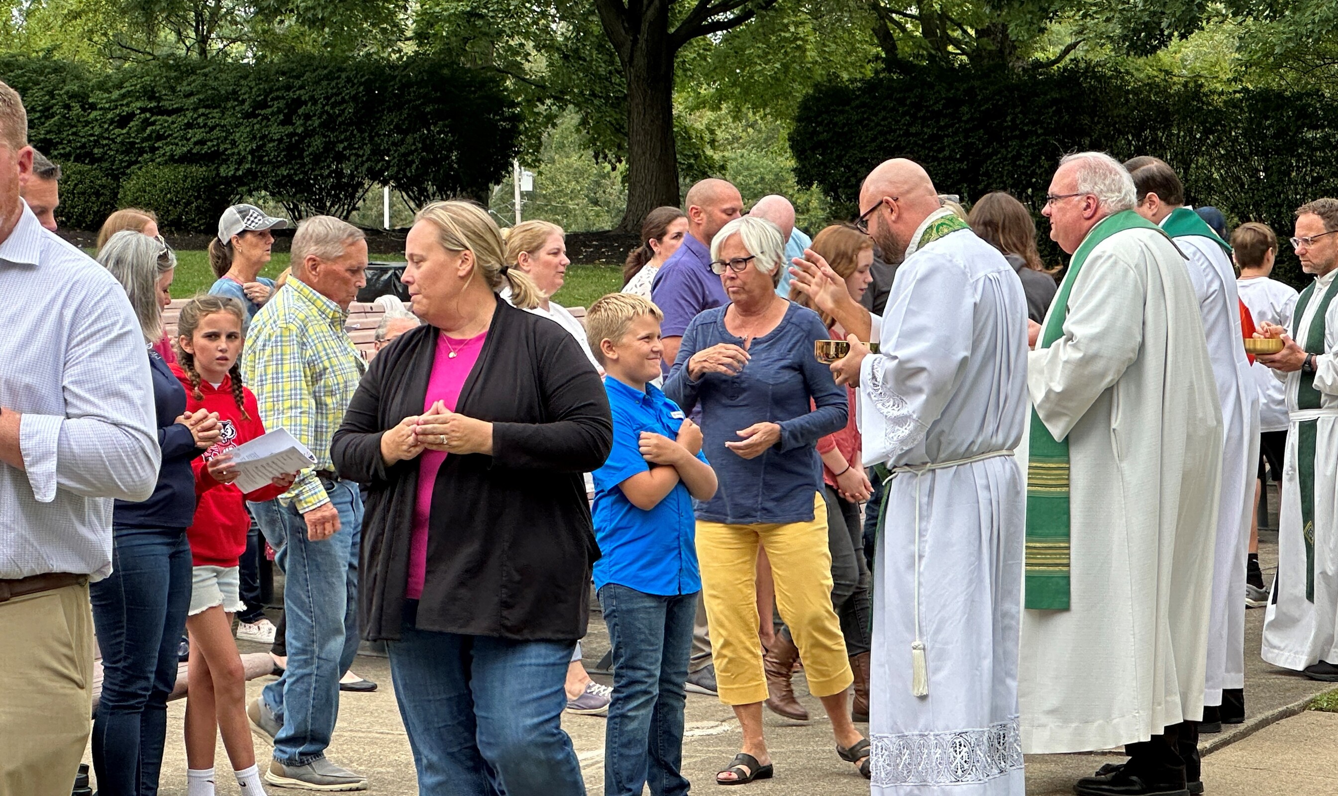 After celebrating their victory, the players and fans joined others around the corner from the baseball field as they gathered for Mass at the Guy Chase Myers Memorial Band Shell. About 250 people, including some from nearby parishes, attended the liturgy. Students from Ashland University’s Newman Ministry served as greeters and distributed worship booklets.