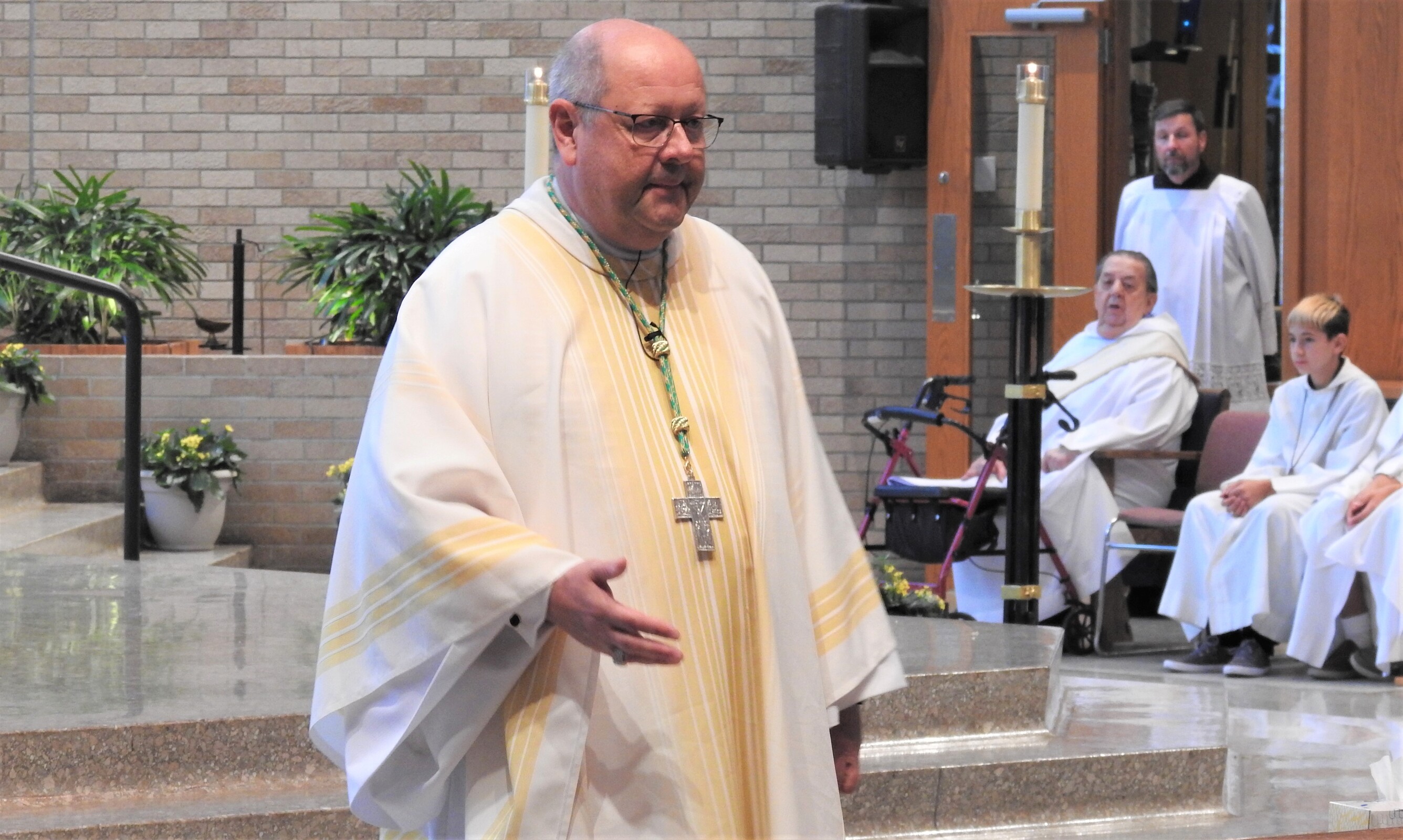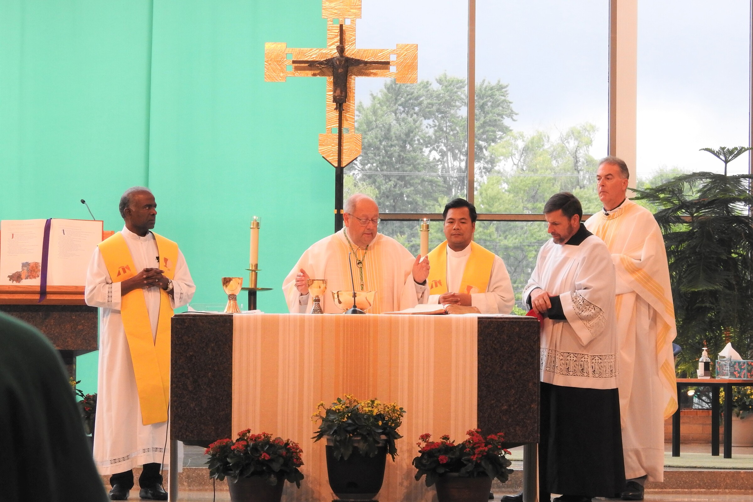 The bishop was joined by concelebrants Father John Thomas Lane, SSS, who is provincial superior, the parish pastor and a son of the parish, and two Blessed Sacrament priests. He offered a brief history of the parish, which was established Sept. 2, 1953 by Archbishop Edward Hoban. The archbishop purchased several acres of what had been farmland, used primarily strawberries and raspberries. He asked the Congregation of the Blessed Sacrament, which had been in the Diocese of Cleveland since 1931 and had a seminary nearby on Euclid Avenue in Cleveland, to administer the parish.