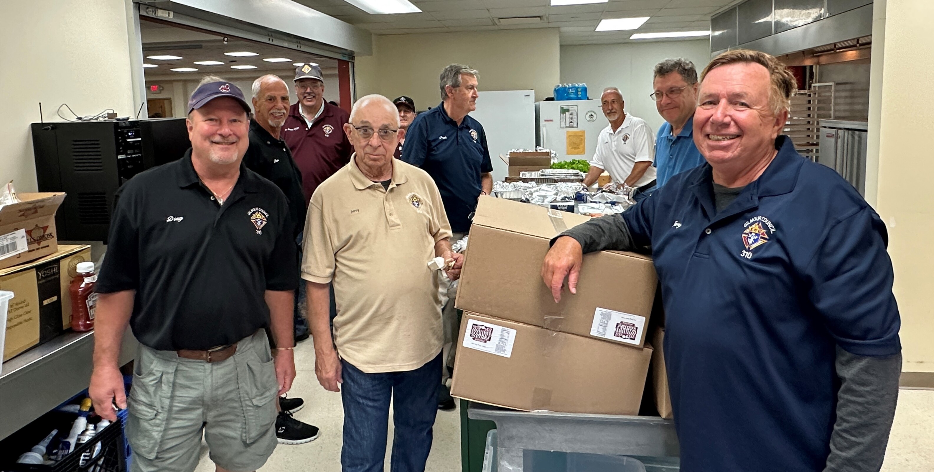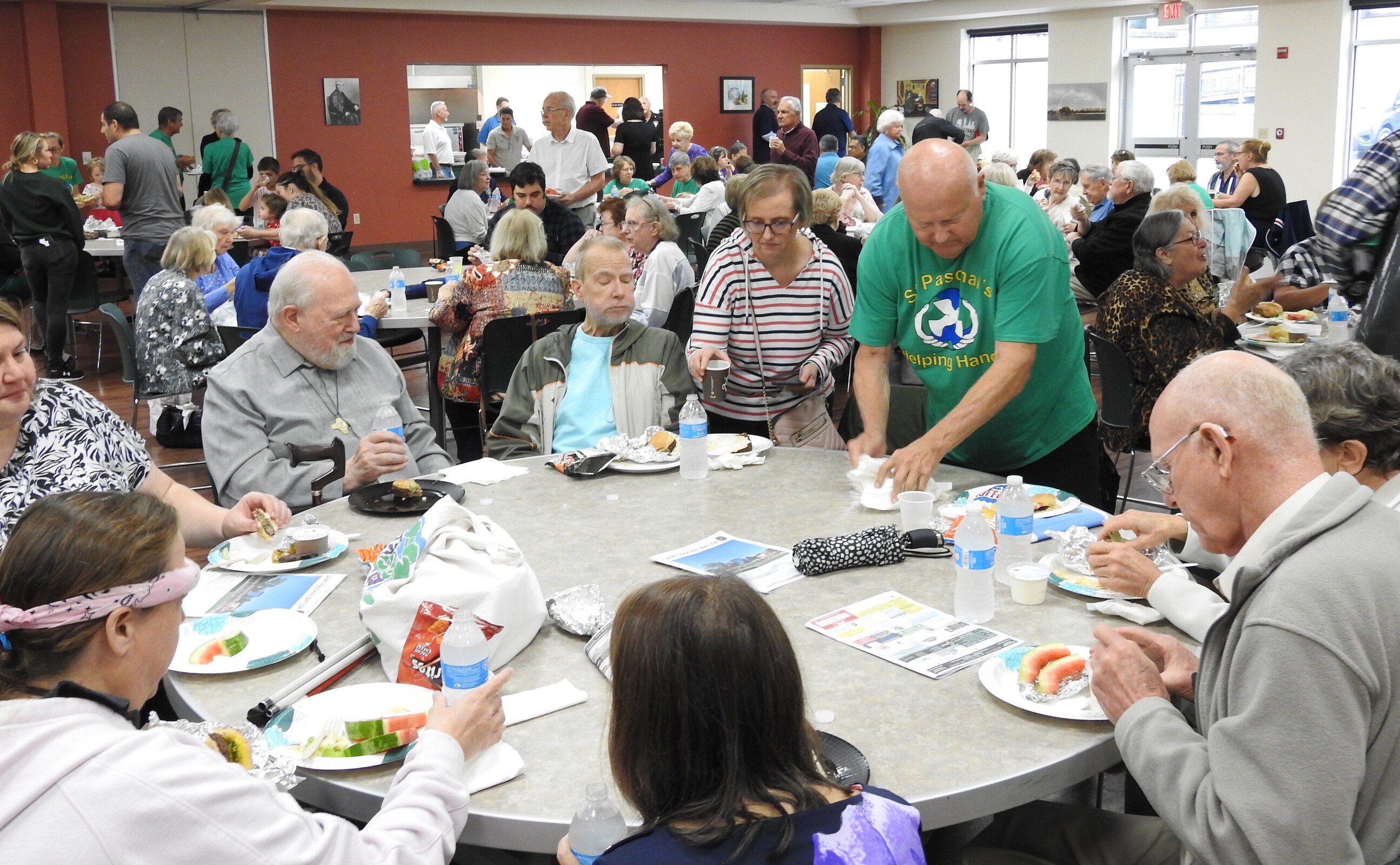 After Mass, the bishop spent some time visiting with parishioners at the parish picnic that was moved indoors by the rainy weather. Members of the Knights of Columbus staffed the grill and kitchen, providing burgers for the hungry crowd.