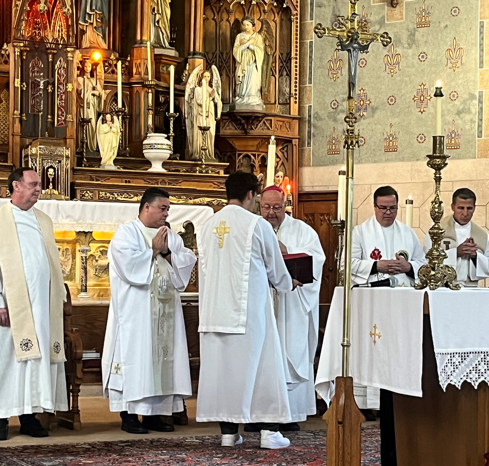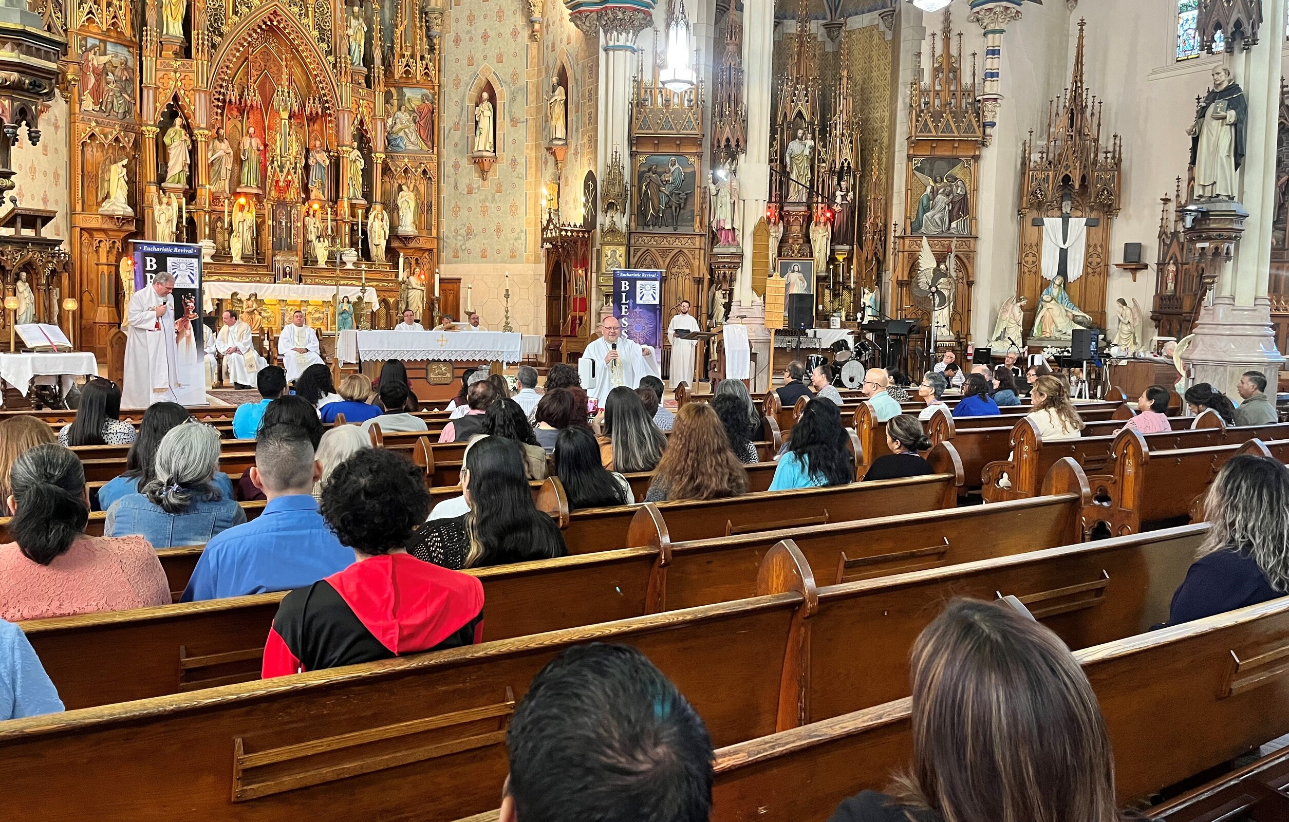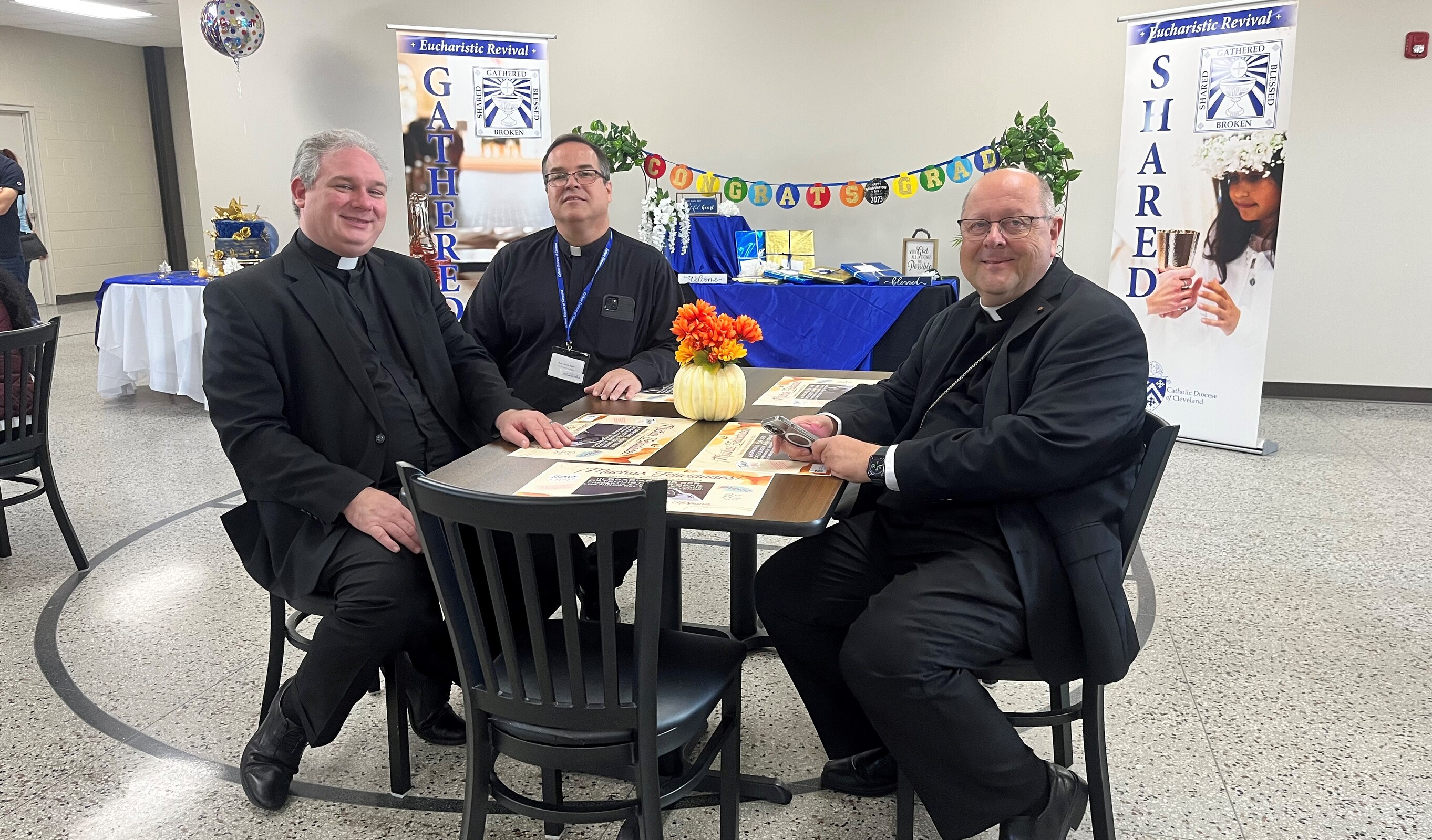 Bishop Edward Malesic was the celebrant and clergy from the seven Hispanic parishes in the eight-county diocese concelebrated, including Father Steve Vellenga, pastor of St. Mary Parish in Painesville; Father Joe Callahan, pastor, Our Lady of Lourdes Parish, Cleveland; Father Mark Riley, pastor, St. Michael the Archangel; Father Bill Thaden, pastor, Sacred Heart Chapel, Lorain and Father Francisco Garnica, pastor, Sagrada Familia Parish, Cleveland. Father Mike Stalla, coordinator for pastoral formation at Borromeo and Saint Mary seminaries, who also served at the diocesan mission in El Salvador, also concelebrated.