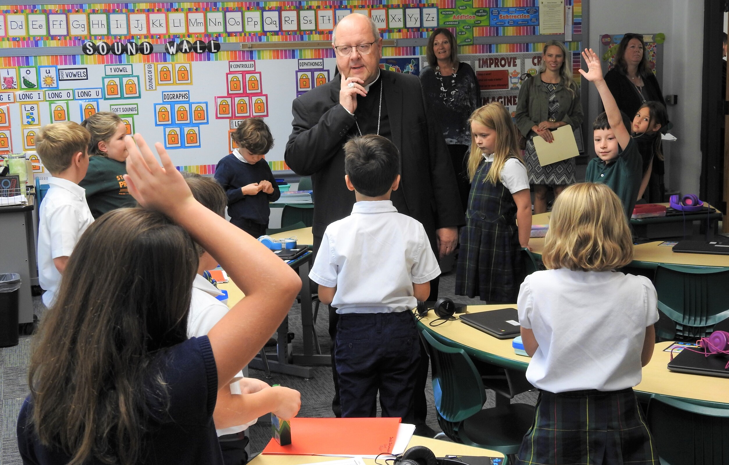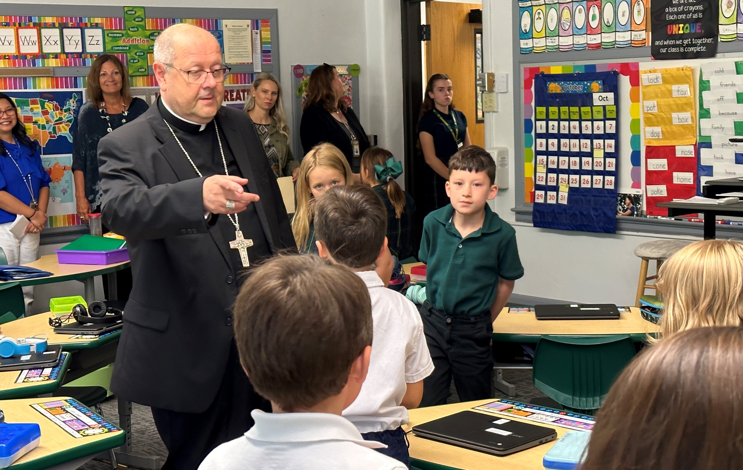 During the classroom visits, the bishop chatted with students about their favorite subjects, what they liked about school, prayer, the sacraments and other topics. He prayed with each classroom and offered a blessing before leaving.