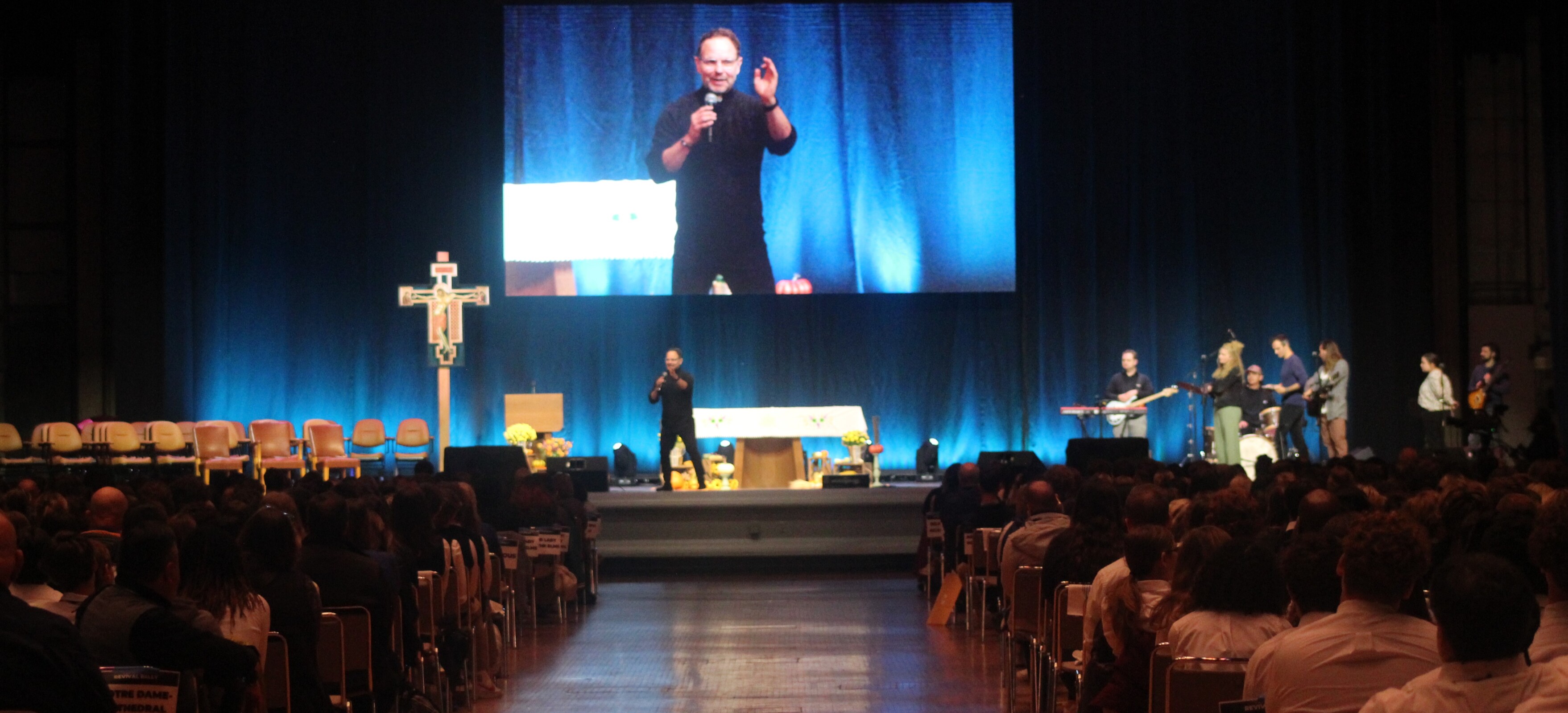 The day began with volunteers – including diocesan staff members and seminarians – greeting the students as they entered the hall. Catholic speaker Chika Anyanwu delivered a keynote address. In addition, there were videos, games, teen witness and praise and worship to begin the rally. Music was provided by Damascus Worship, a nationally known worship music group that includes some members from Cleveland. Students found a rally towel with an inspirational quote from Blessed Carlo Acutis on their chairs.