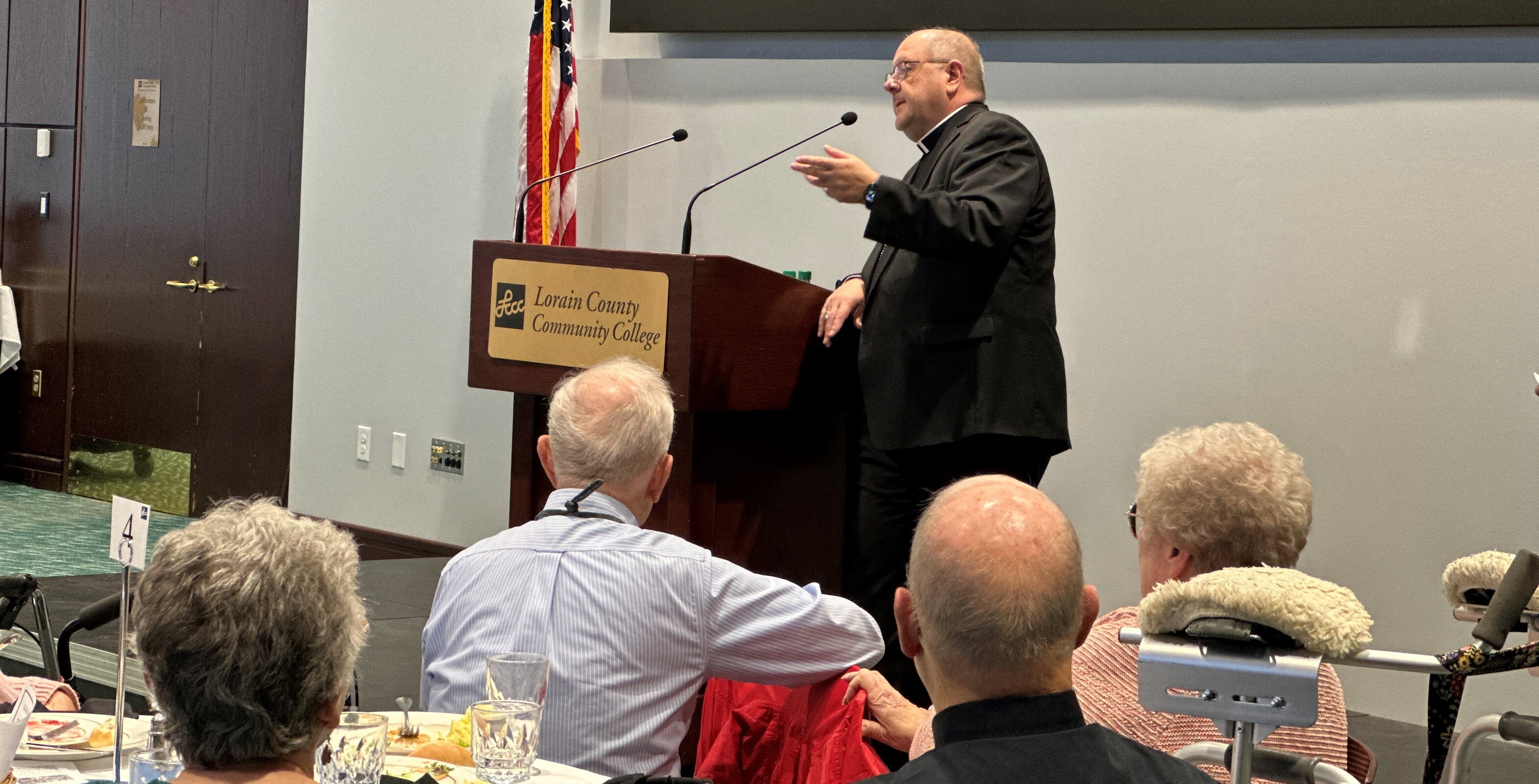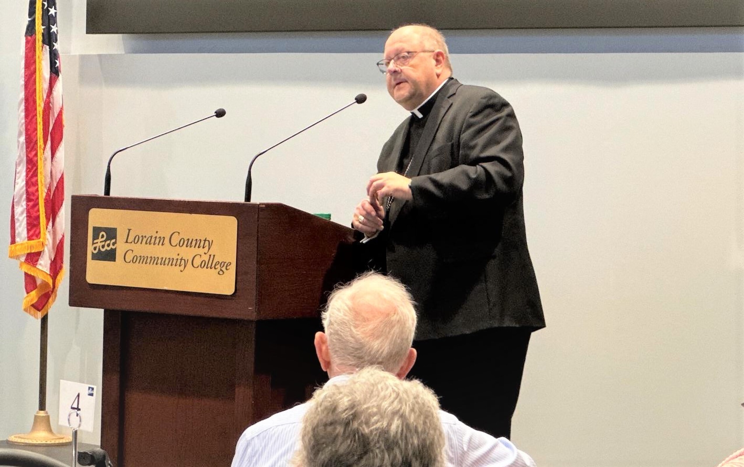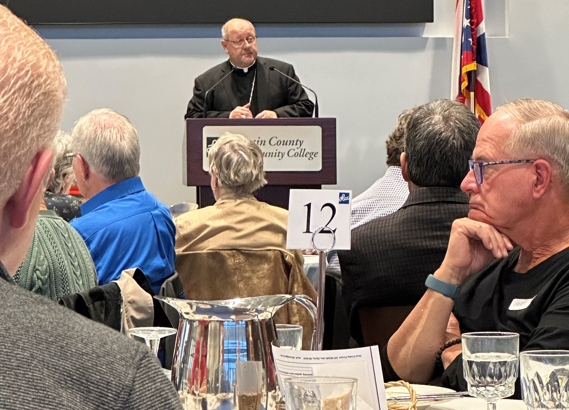 After a break of nearly two years, Bishop Edward Malesic returned on Nov. 3 to address the First Friday Forum of Lorain County.