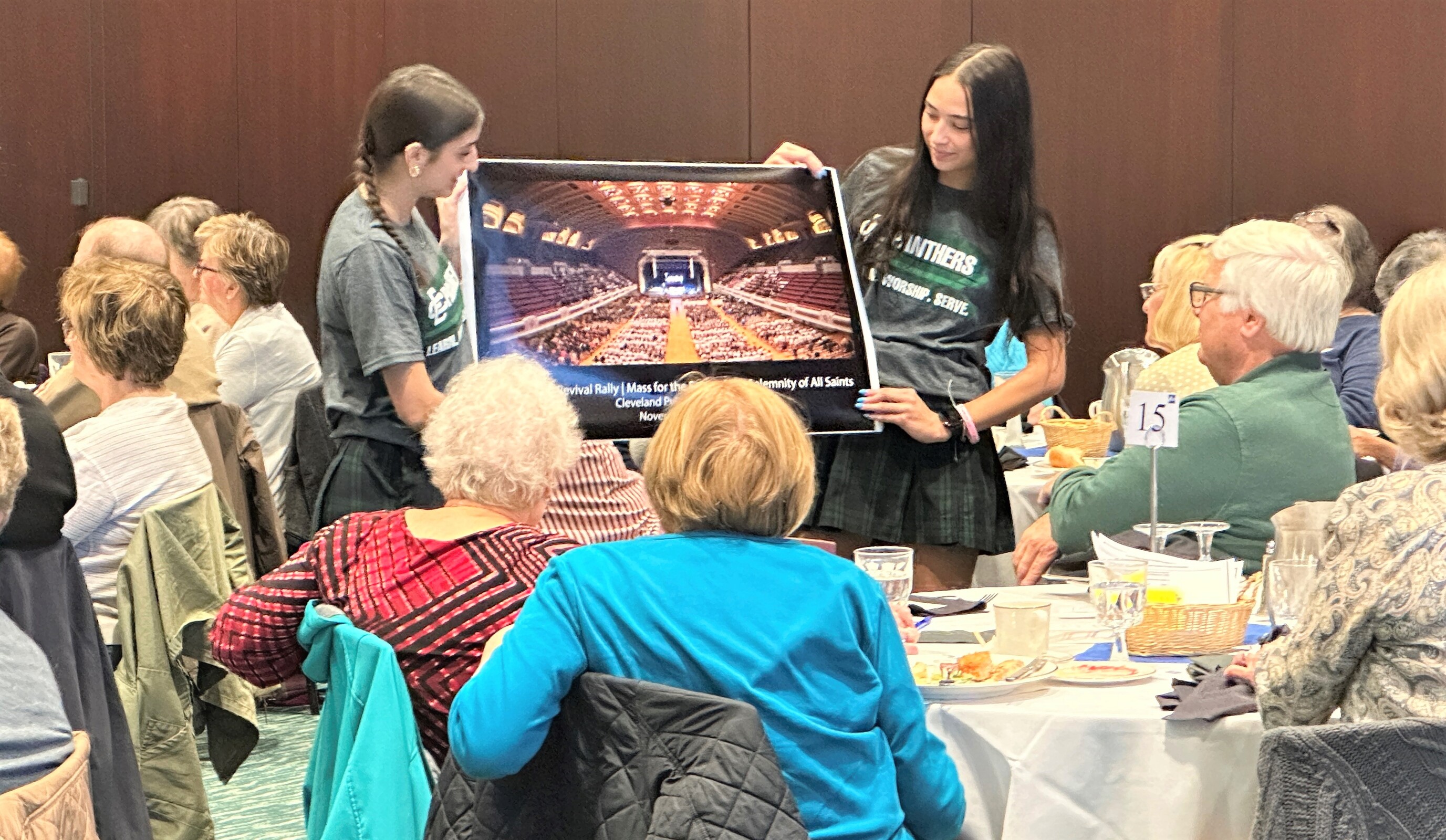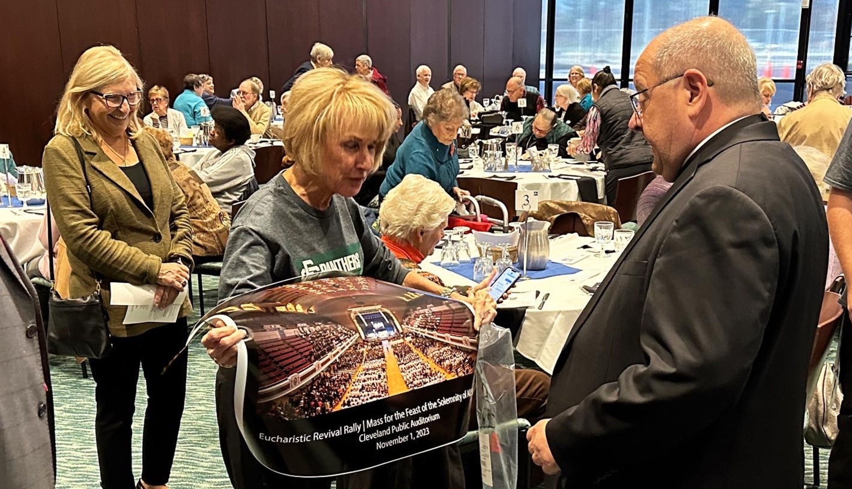 After his presentation, the bishop answered a few questions and took time to mingle with the audience and Elyria Catholic students. The young people showed him a photo from the diocesanwide Mass he celebrated the previous day (All Saints Day) in Cleveland Public Auditorium downtown. About 3,200 high school students from across the diocese attended the Eucharistic Revival Rally and Mass