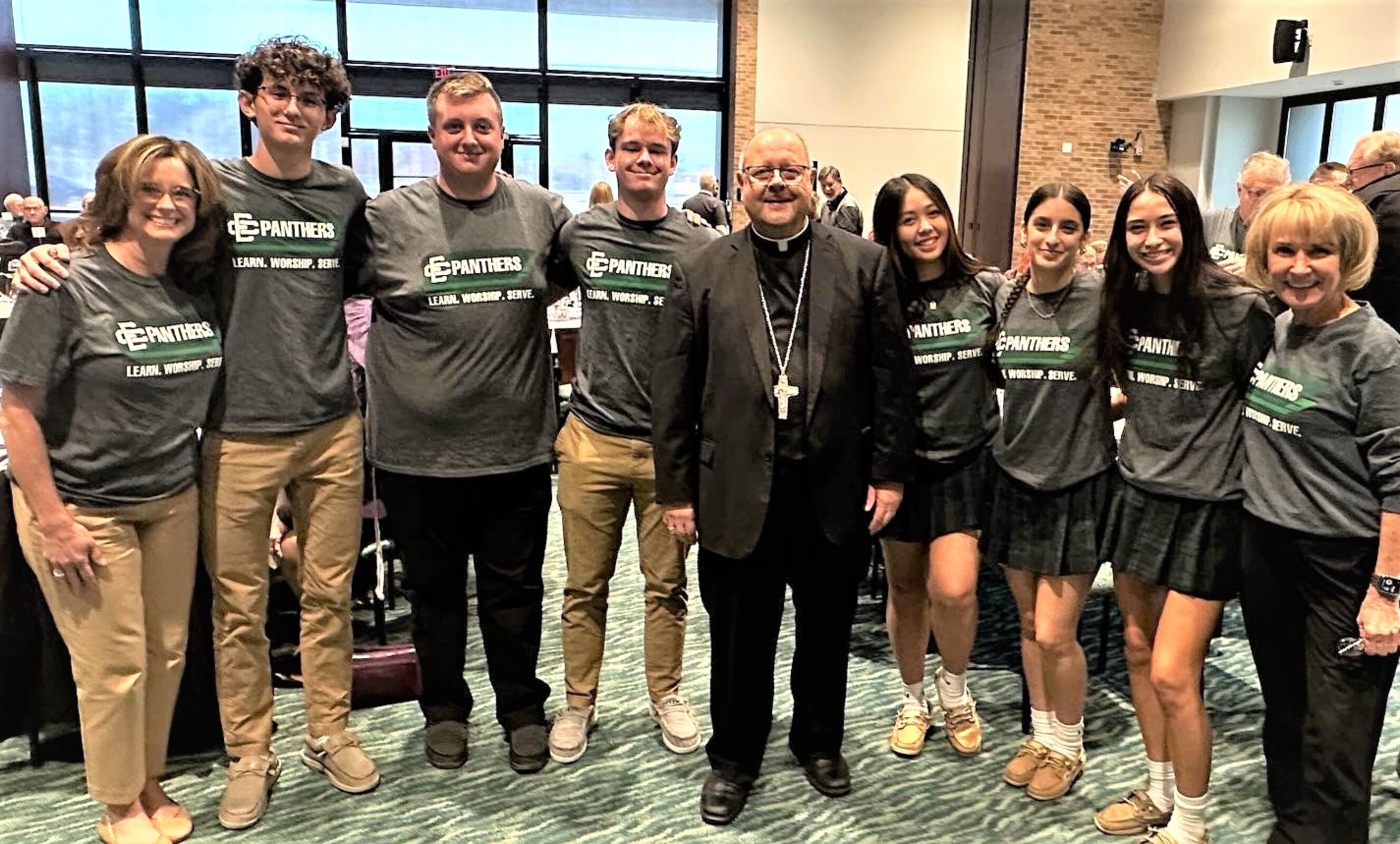 An enthusiastic crowd, including a contingent of students from Elyria Catholic High School, welcomed the shepherd of the Diocese of Cleveland. The bishop focused on six main topics: peace, the sanctity of life, vocations, Catholic education, the Eucharistic Revival and the diocese’s newly established grandparent ministry.