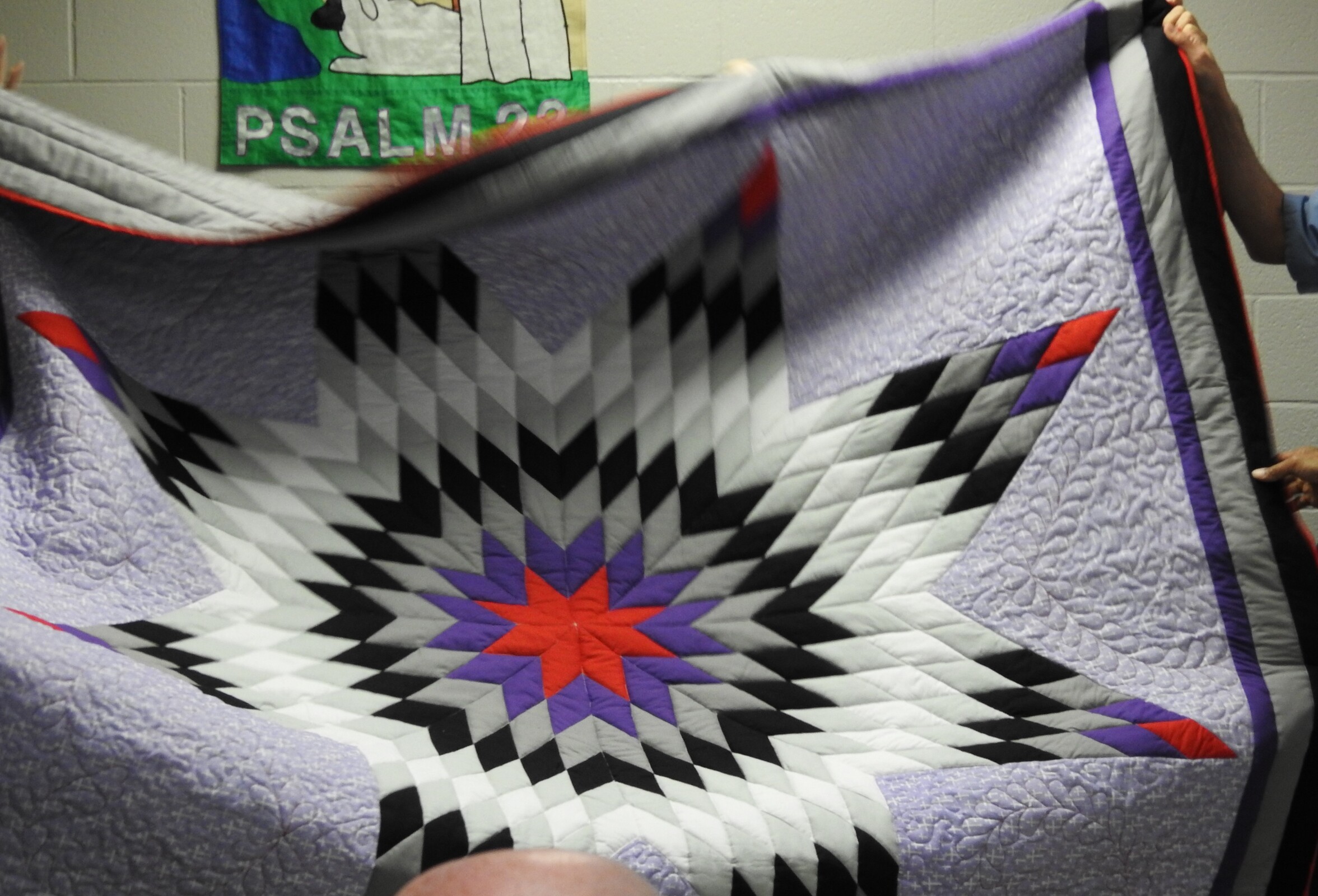 Sister Harwood was humbled when some of the tackers presented her with a beautiful quilt they made as a thank-you to her for her support of their efforts.