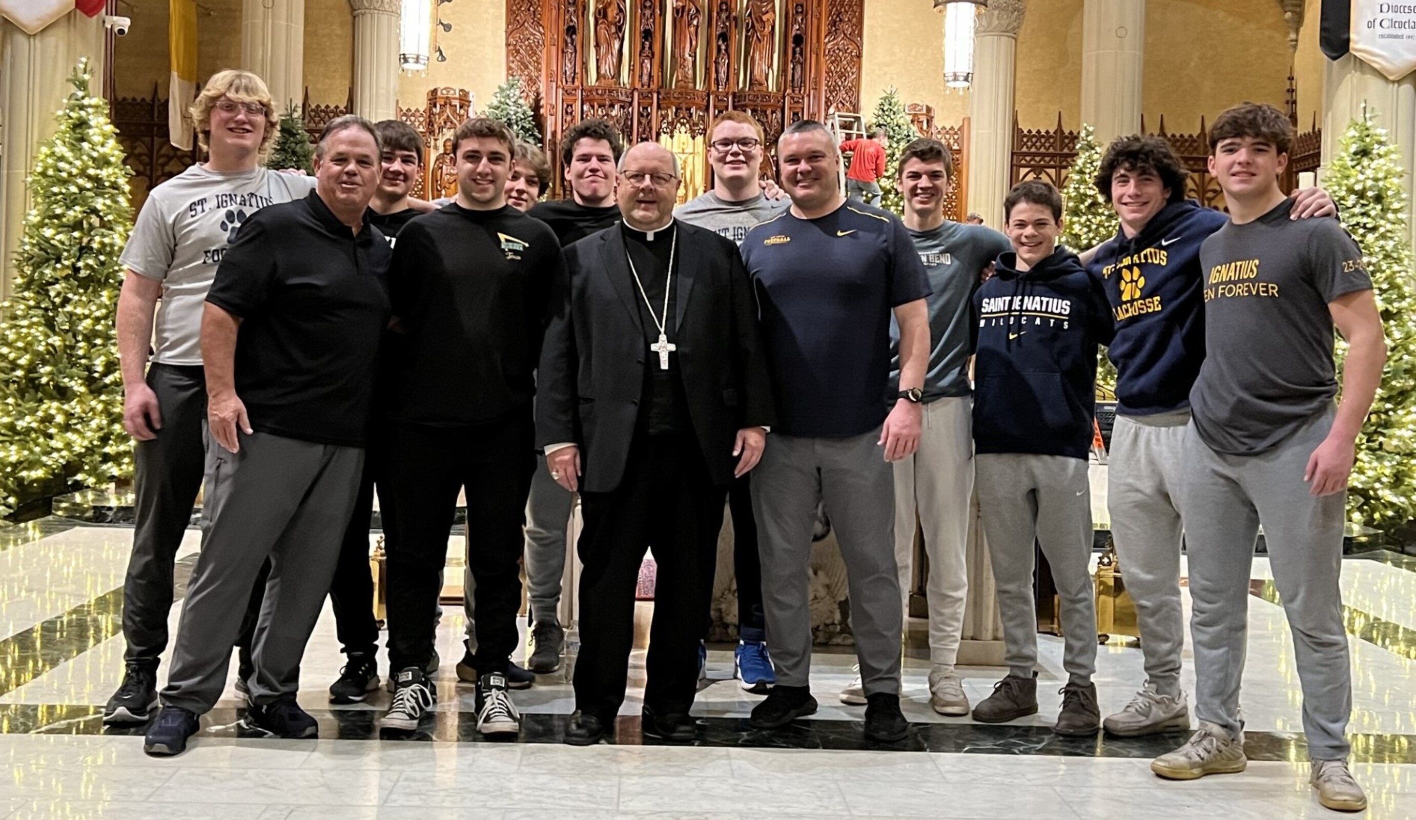 Another last minute, finishing touch to the interior decorations are dozens of red and white poinsettia plants that will be slipped into place prior to the vigil Mass that will be celebrated by Bishop Malesic. The bishop stopped by on Dec. 16 to check on the status of the decorating project and to thank the volunteers for their hard work. He took a few minutes to pose for a photo with the Saint Ignatius students.