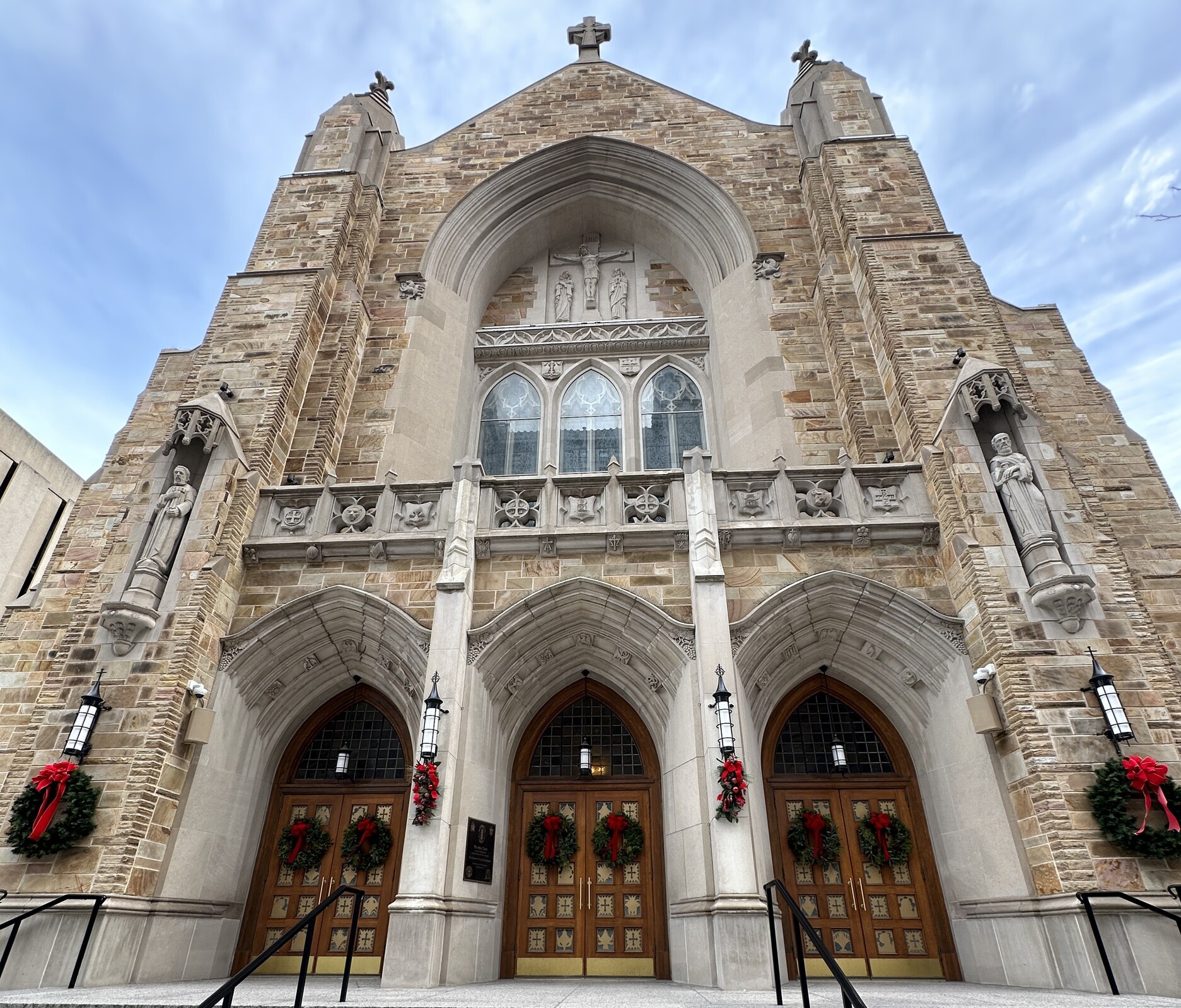 Wreaths were hung on the outside cathedral doors the previous week. Gates enclosing the recently rebuilt courtyard also have wreaths on them.