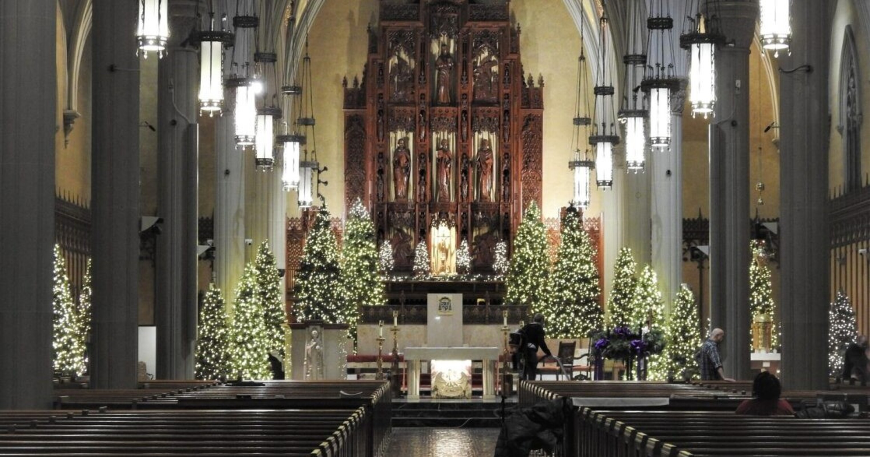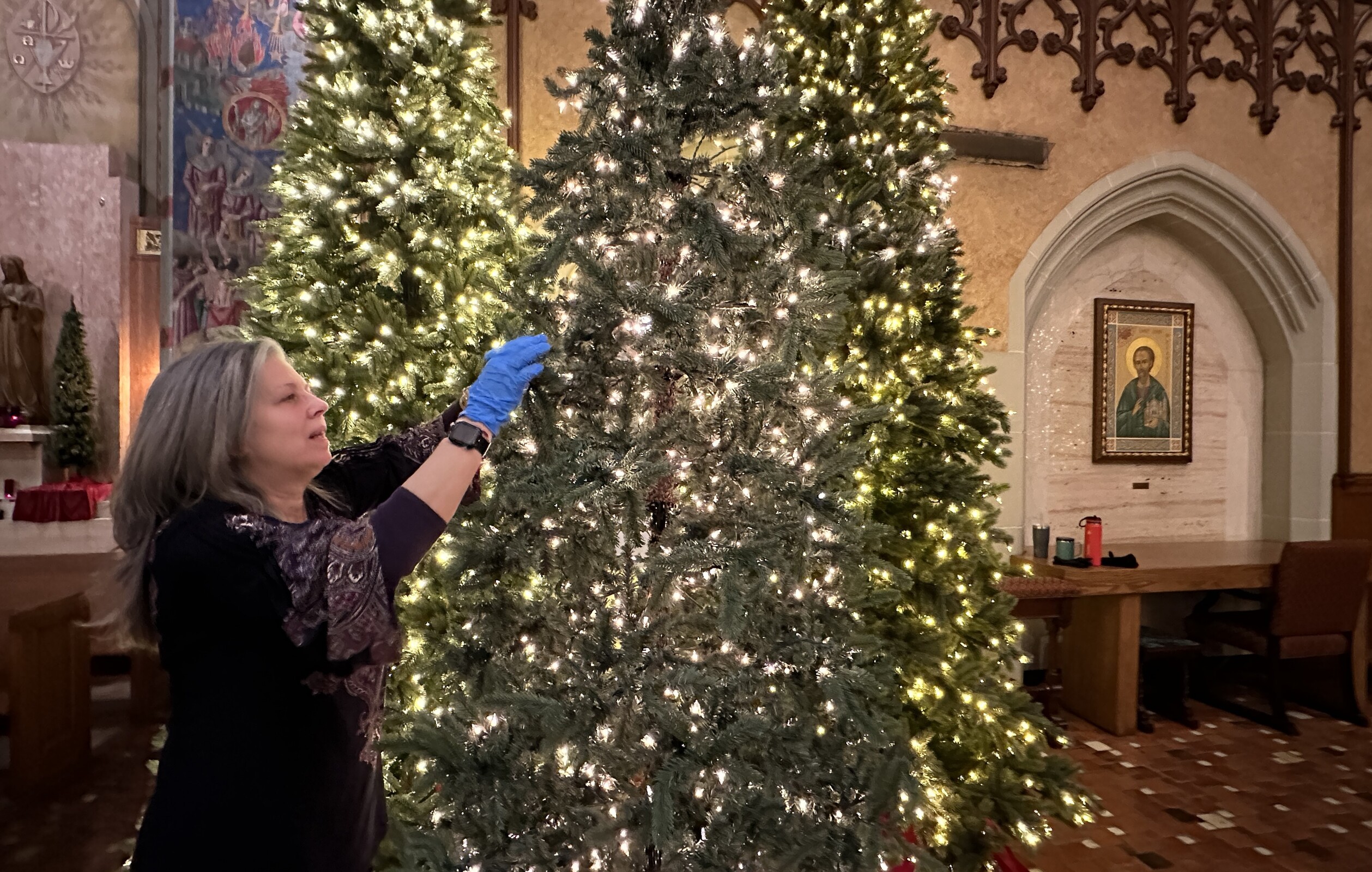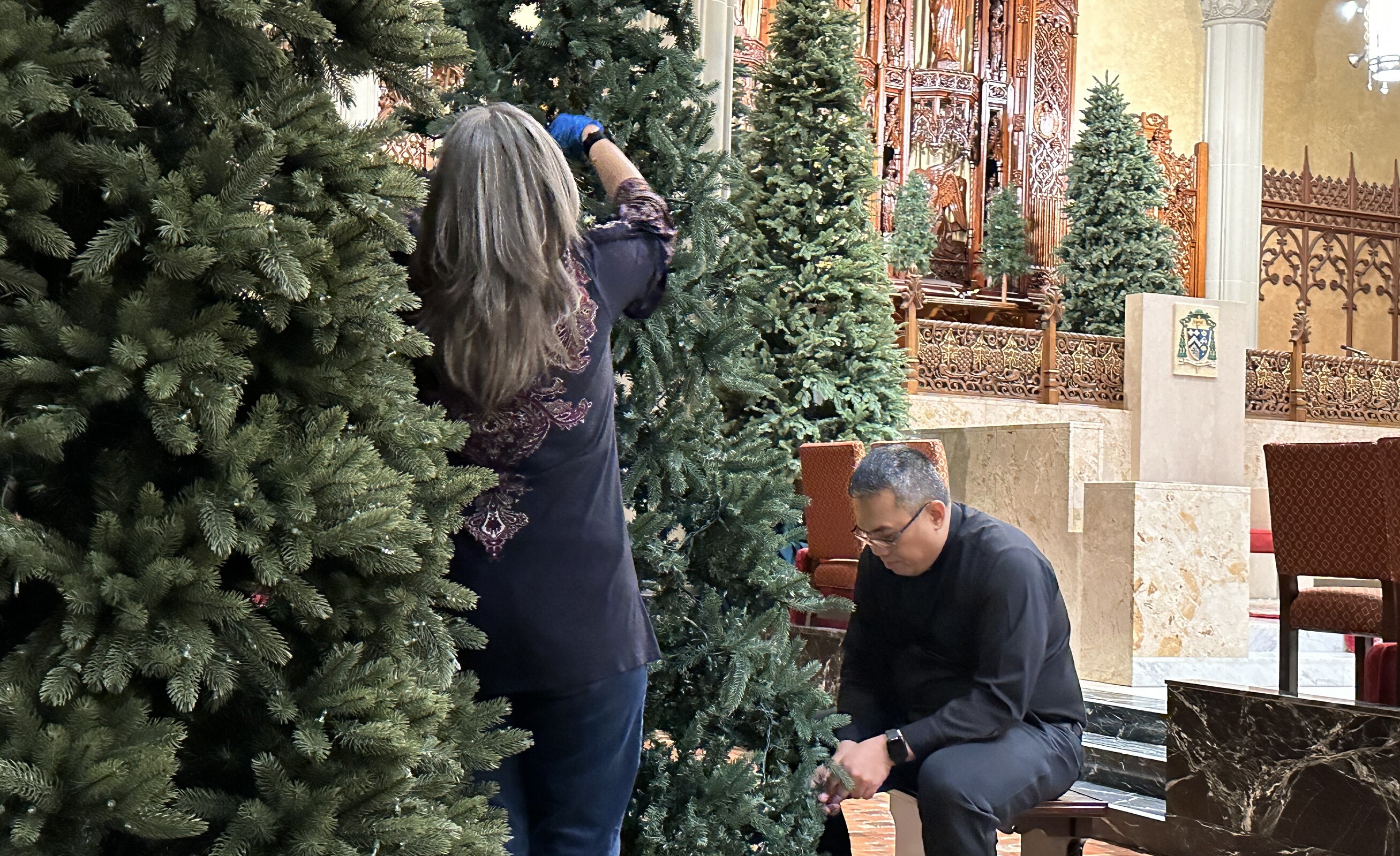 Even after all the trees were placed around the sanctuary, near the main doors of the cathedral and in the naves, there was plenty of finishing work to do. Volunteers, some wearing protective gloves, fluffed up the trees to help them look more realistic. Thousands of tiny, white lights will brighten each tree throughout the Christmas season, which ends on Epiphany.