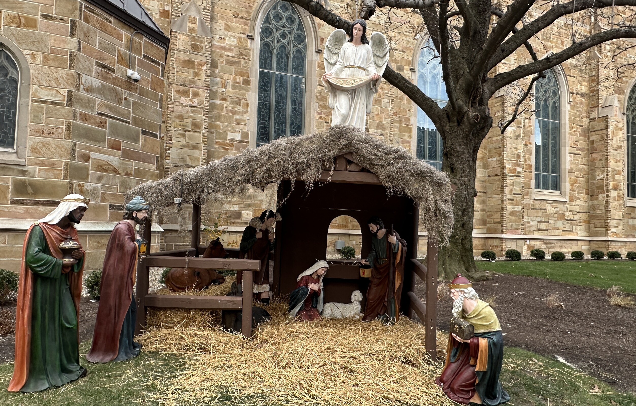 Focal points both inside and outside of the historic cathedral are creches. The outside crèche was created a few years ago by Kenny Misconish, director of maintenance and a talented woodworker. Father Ralph said Misconish built the large, wooden stable and he researched, then purchased appropriately sized statues.