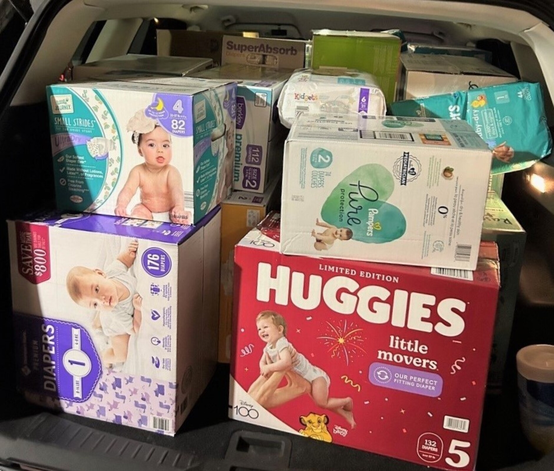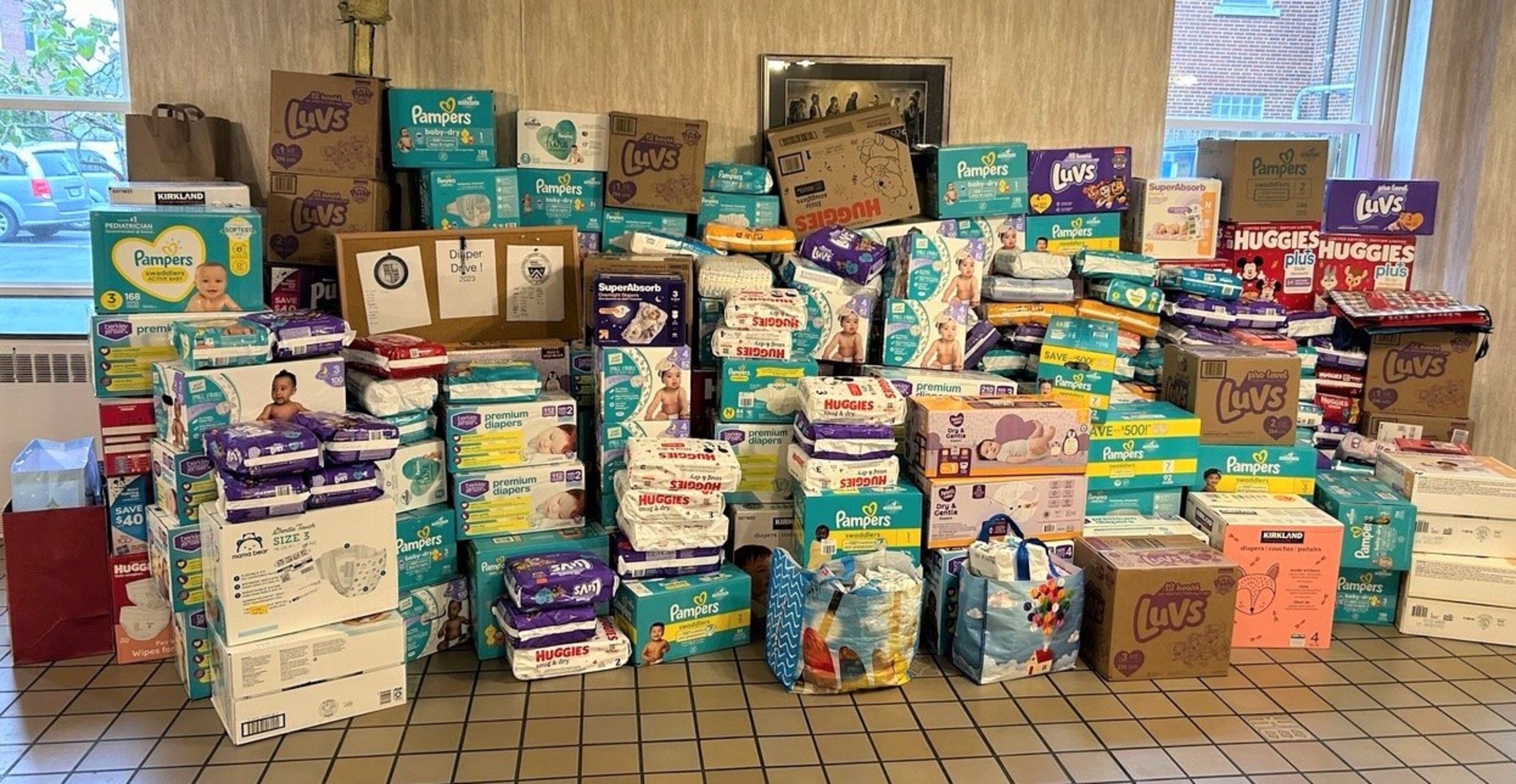 While the focus was on donations of diapers in all sizes, some baby wipes and knitted baby accessories were received. There also were some cash donations, which were used to purchase additional diapers.